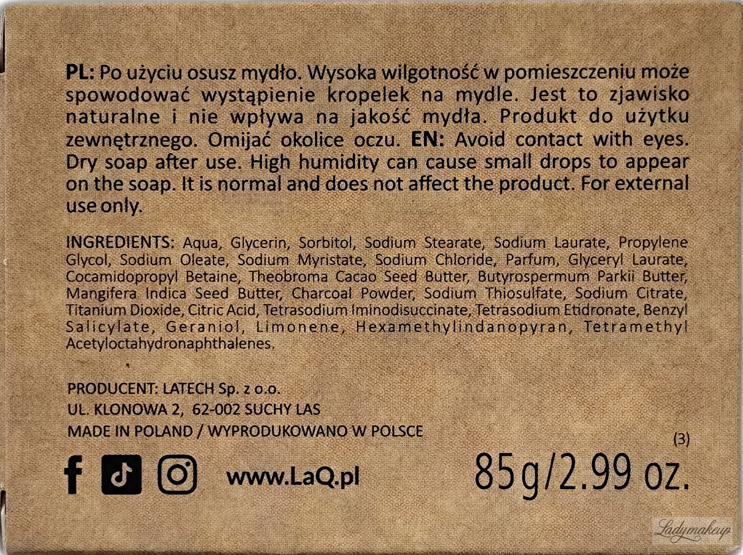 AQUA, GLYCERIN, SORBITOL, SODIUM STEARATE, SODIUM LAURATE, PROPYLENE GLYCOL, SODIUM OLEATE, SODIUM MYRISTATE, SODIUM CHLORIDE, PARFUM, GLYCERYL LAURATE, COCAMIDOPROPYL BETAINE, THEOBROMA CACAO SEED BUTTER, BUTYROSPERMUM PARKII BUTTER, MANGIFERA INDICA SEED BUTTER, CHARCOAL POWDER, SODIUM THIOSULFATE, SODIUM CITRATE, TITANIUM DIOXIDE, CITRIC ACID, TETRASODIUM IMINODISUCCINATE, TETRASODIUM ETIDRONATE, BENZYL SALICYLATE, GERANIOL, LIMONENE, HEXAMETHYLINDANOPYRAN, TETRAMETHYL ACETYLOCTAHYDRONAPHTHALENES.