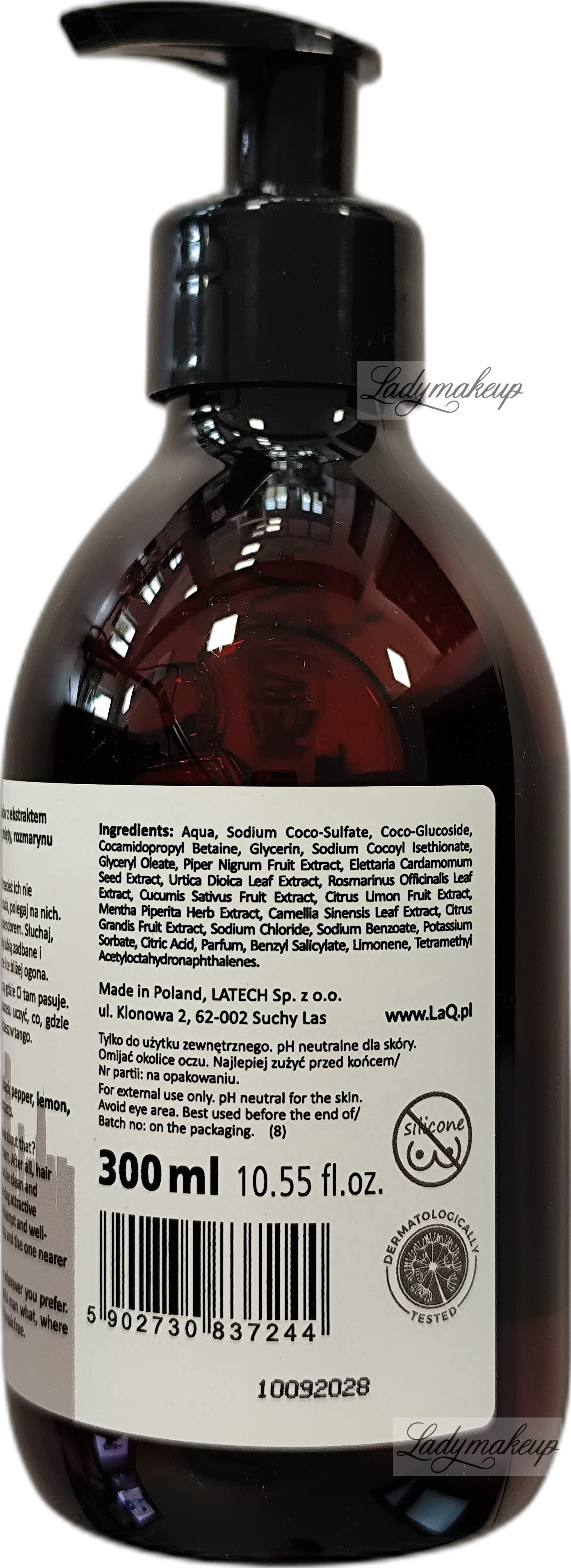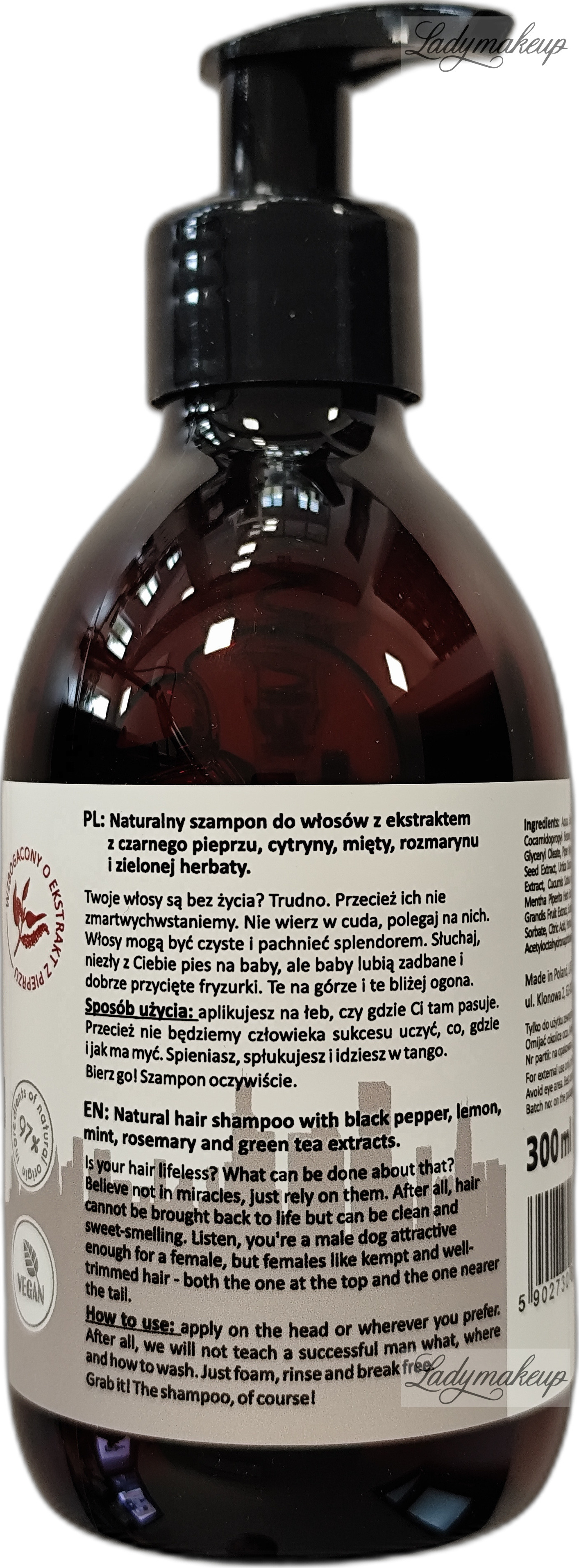 - Szampon do włosów. Dokładnie myje i oczyszcza pasma i skórę głowy z wszelkiego rodzaju zanieczyszczeń. Jego formuła w 97% opiera się na składnikach pochodzenia naturalnego takich jak np. ekstrakt z czarnego pieprzu, cytryny, mięty, rozmarynu i zielonej herbaty. Umieszczony został w plastikowej butelce o pojemności 300 ml.