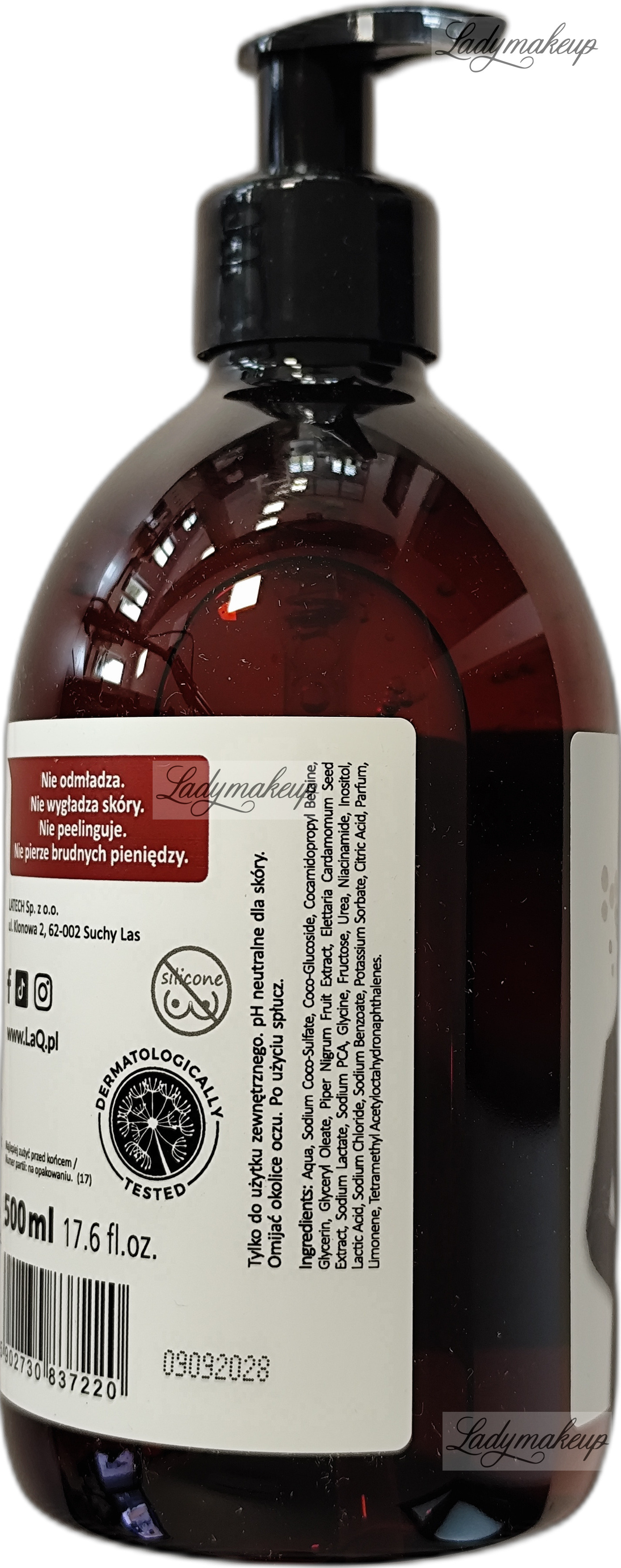 AQUA, SODIUM COCO-SULFATE, COCO-GLUCOSIDE, COCAMIDOPROPYL BETAINE, GLYCERIN, GLYCERYL OLEATE, PIPER NIGRUM FRUIT EXTRACT, ELETTARIA CARDAMOMUM SEED EXTRACT, SODIUM LACTATE, SODIUM PCA, GLYCINE, FRUCTOSE, UREA, NIACINAMIDE, INOSITOL, LACTIC ACID, SODIUM CHLORIDE, SODIUM BENZOATE, POTASSIUM SORBATE, CITRIC ACID, PARFUM, LIMONENE, TETRAMETHYL ACETYLOCTAHYDRONAPHTHALENES.