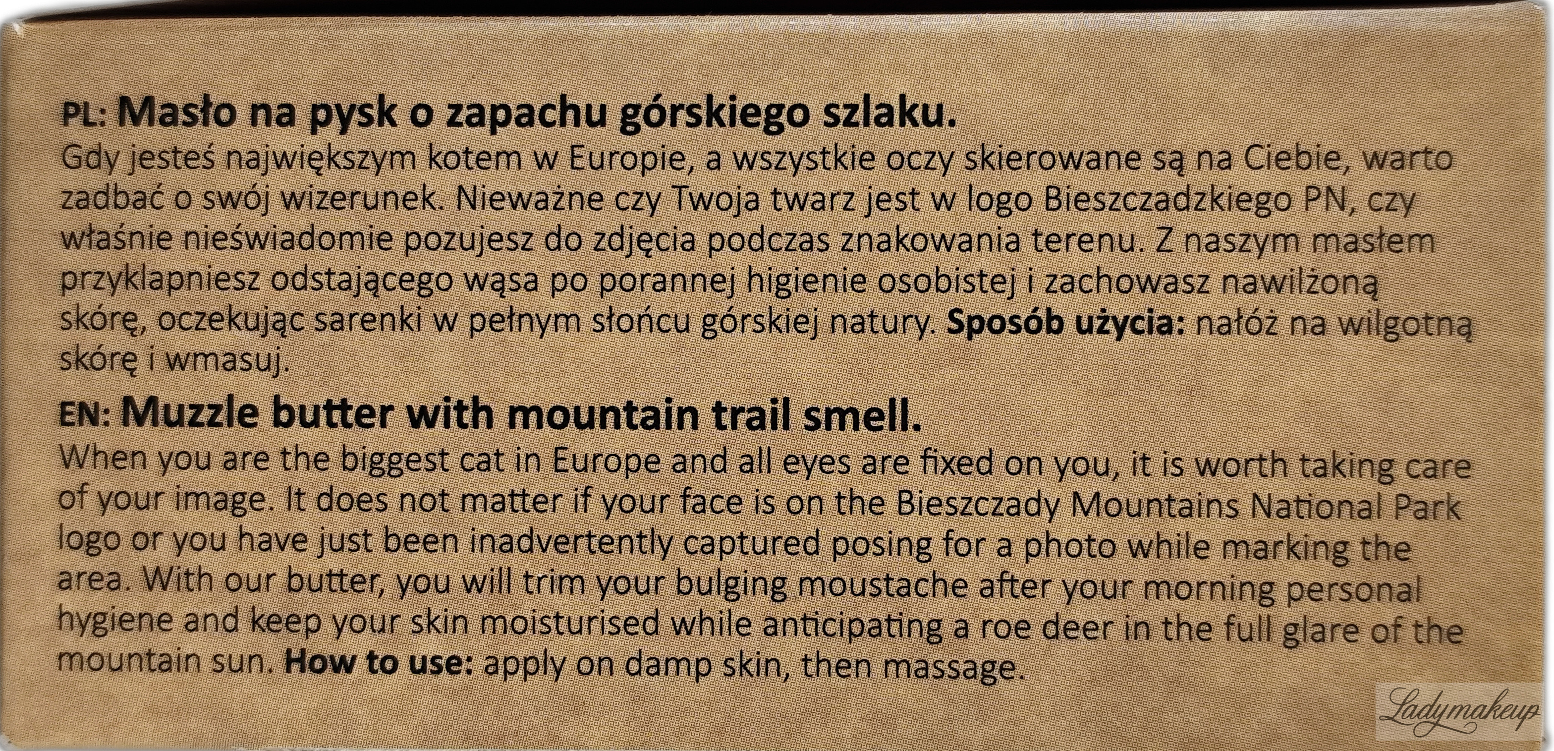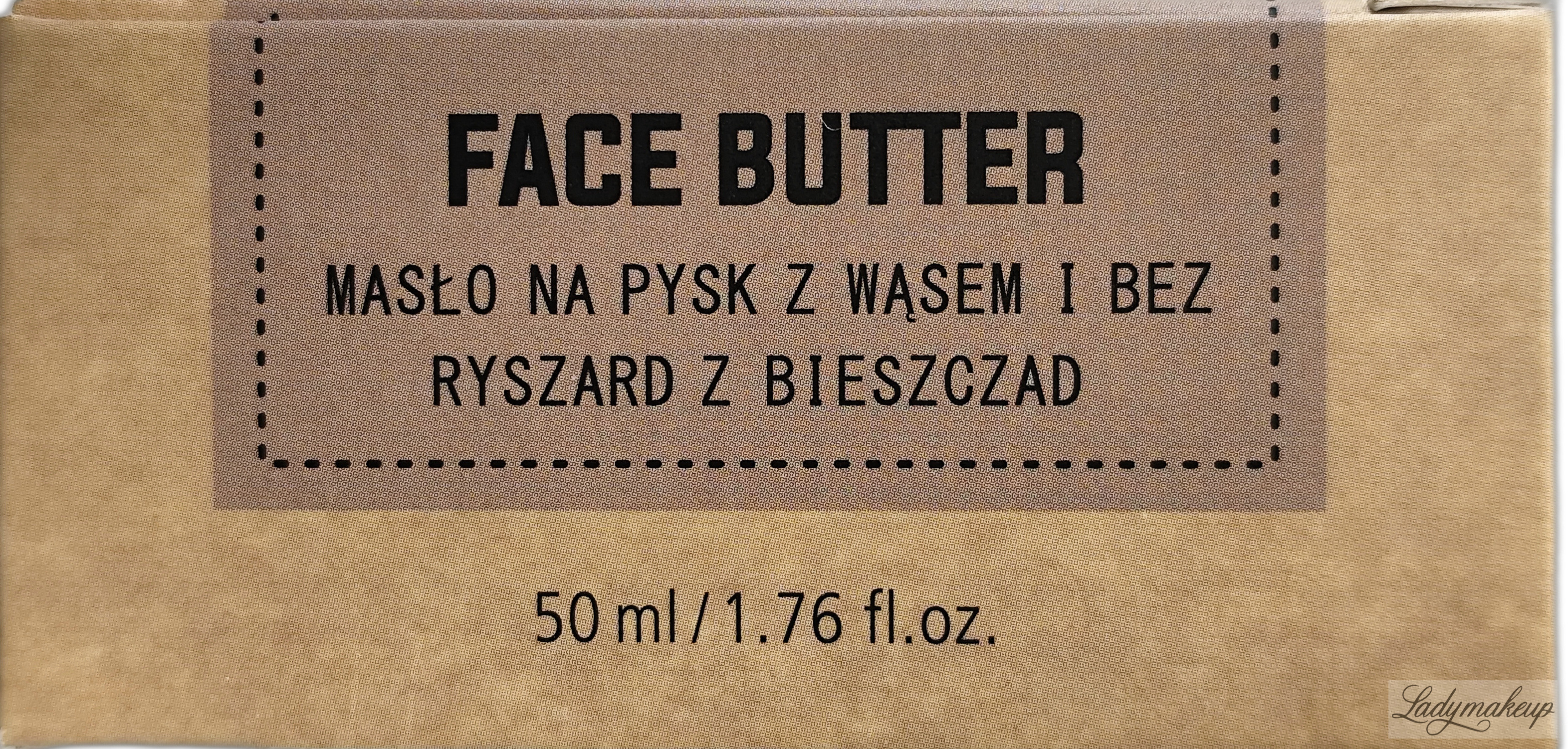 Masło. Stworzone zostało do pielęgnacji twarzy dla mężczyzn. Szczególnie tych zmęczonych ciągłą pracą planujących ucieczkę w Bieszczady. Przeznaczone do codziennego użytku, bez względu na porę roku. Skutecznie koi i regeneruje skórę. Formuła kosmetyku w 99% opiera się na składnikach pochodzenia naturalnego. W jej składzie znajdują się między innymi: masło shea, oleje (konopny, z pestek malin i arbuza) oraz witamina E. Produkt jest przyjazny dla vegan. Umieszczono go w odkręcanym słoiczku o pojemności 50 ml.