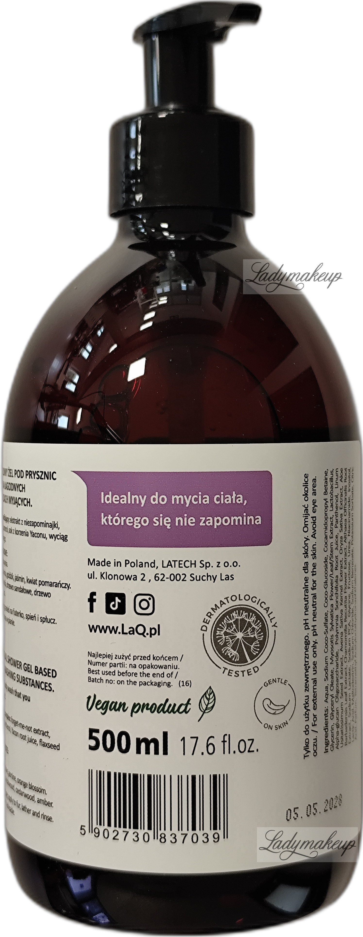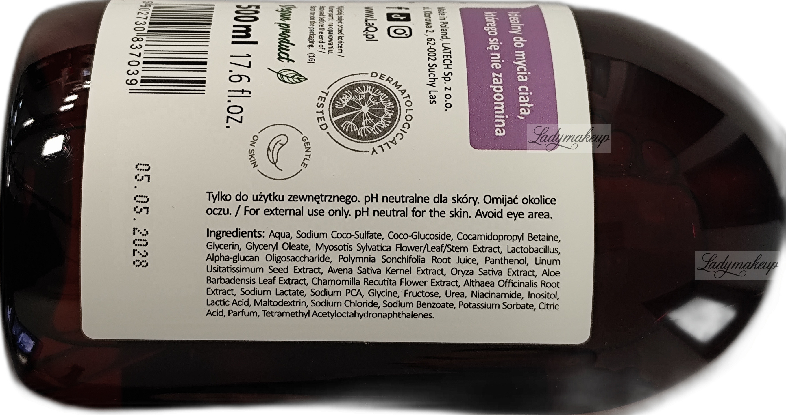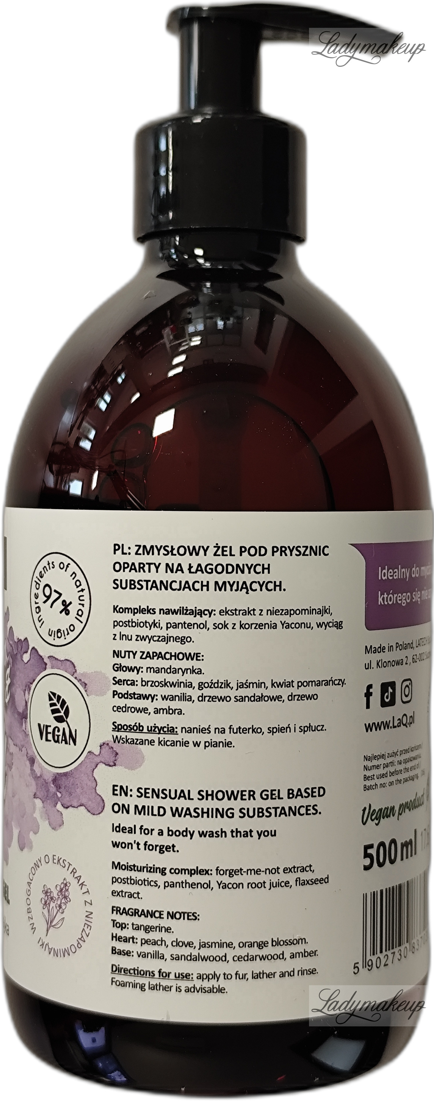 - Żel pod prysznic. Został stworzony do pielęgnacji kobiecego ciała. Jego formuła w 99% opiera się na delikatnych naturalnych składnikach myjących pochodzenia roślinnego. Receptura kosmetyku wzbogacona została o olejeki z nasion niezapominajki i lnu oraz d-panthenol, dzięki którym wykazuje właściwości nawilżające i wzmacniające barierę ochronną skóry. Produkt posiada przyjemny zmysłowy zapach kojący zmysły i dodający energii. Jest przyjazny dla wegan. Umieszczono go w butelce o pojemności 500 ml z pompką ułatwiającą dozowanie.