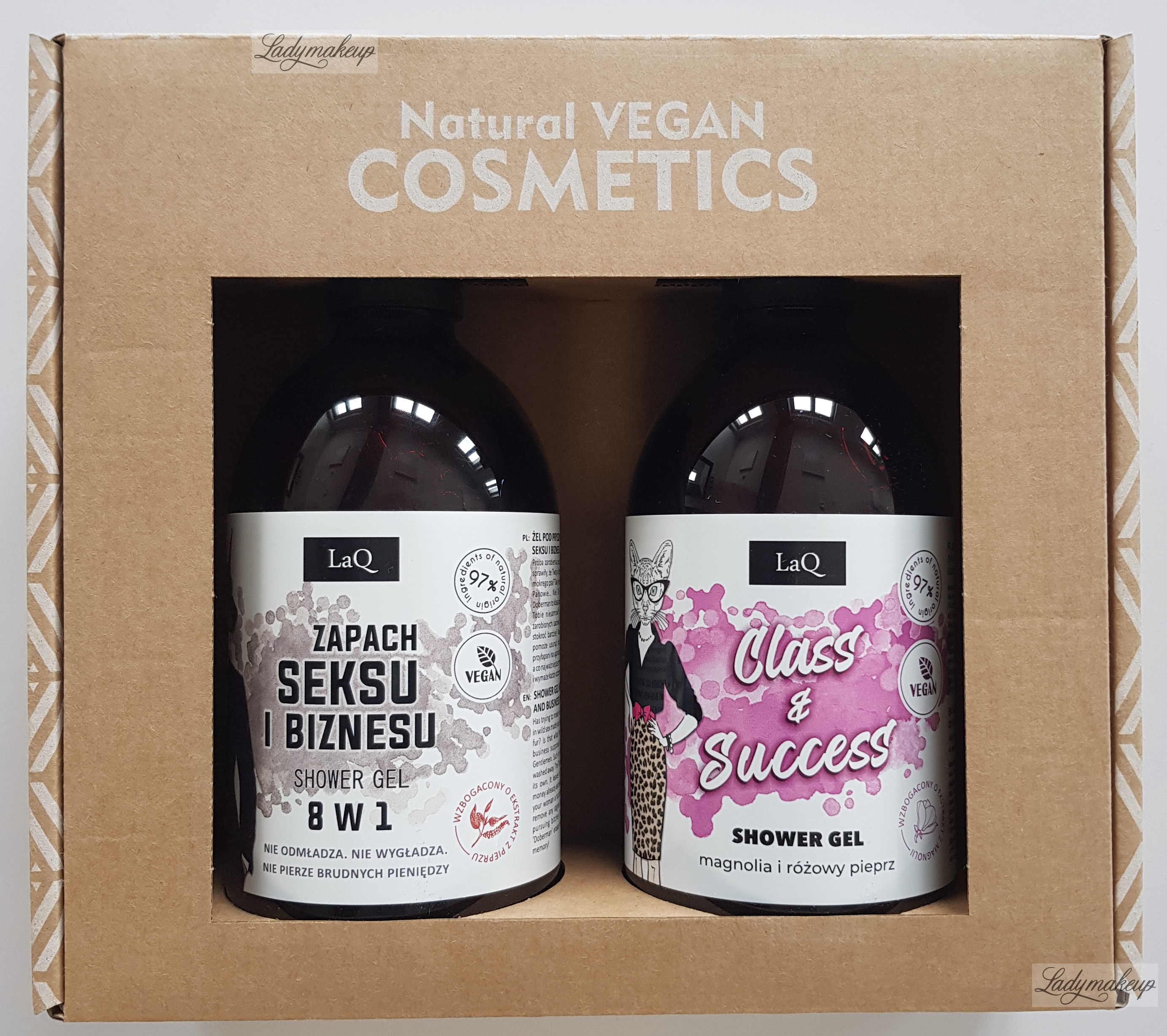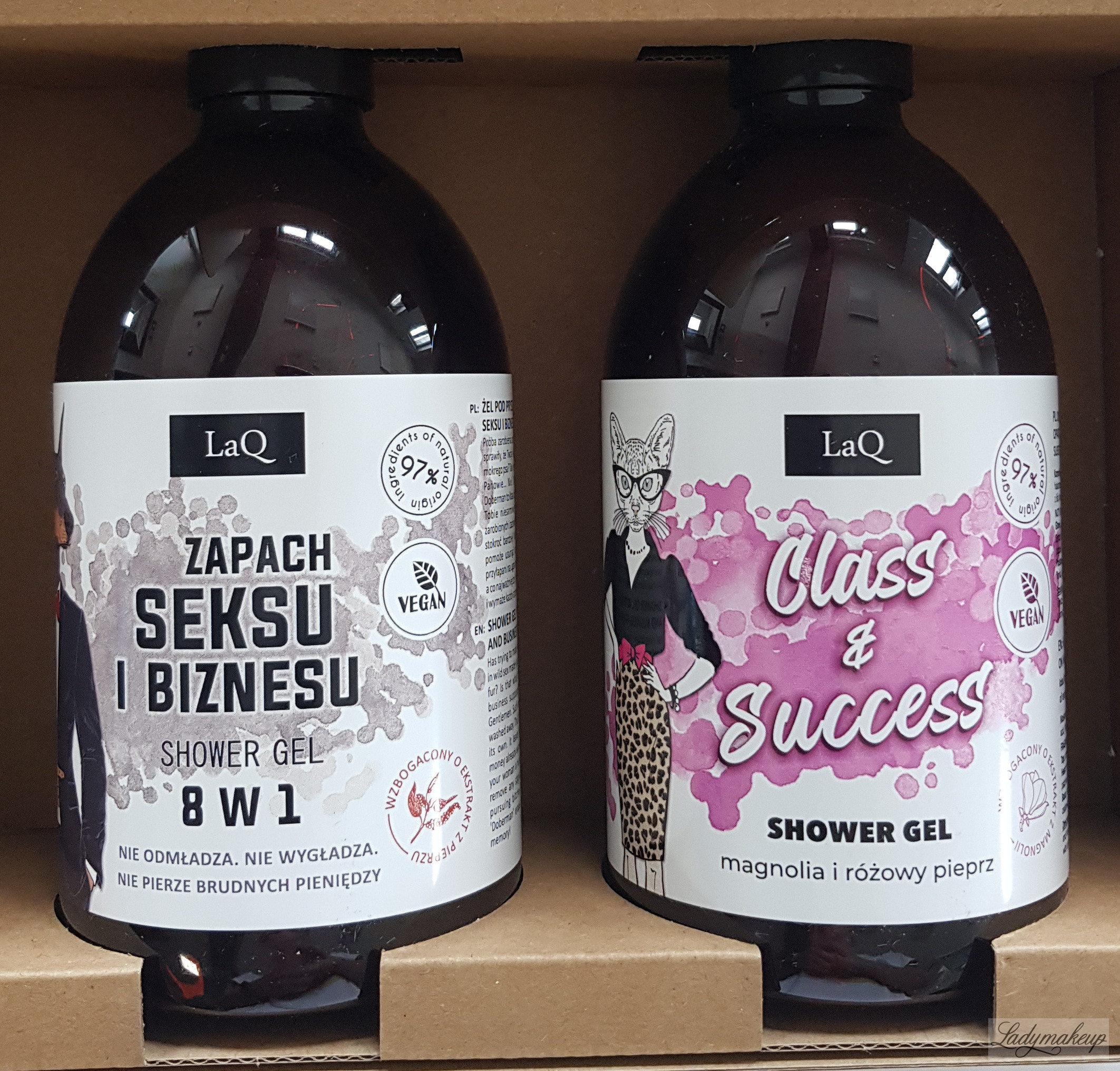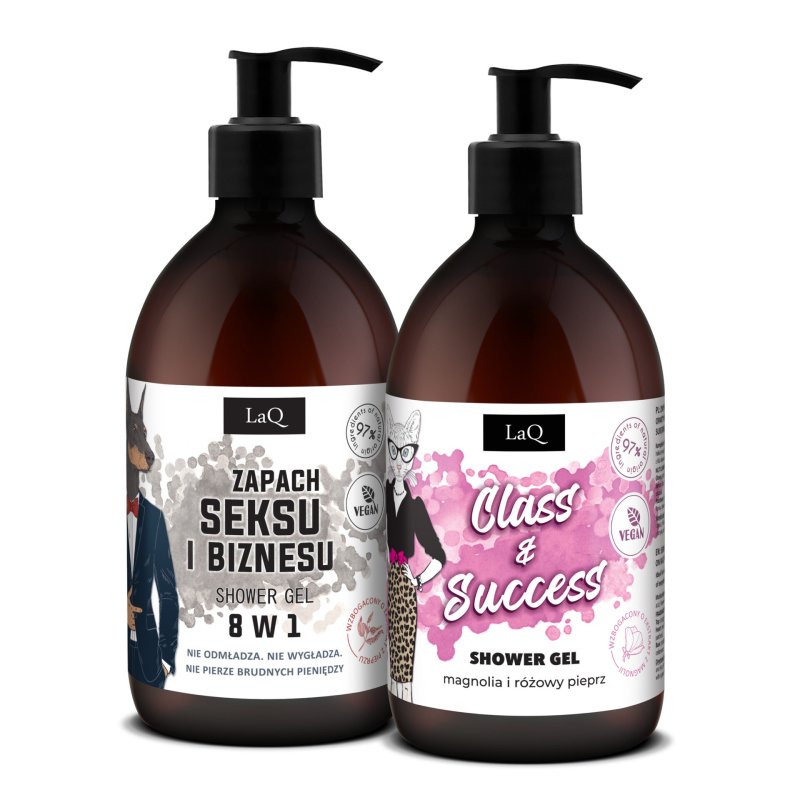 - Class & Succes Shower Gel. Został stworzony do pielęgnacji kobiecego ciała. Jego formuła w 97% opiera się na delikatnych naturalnych składnikach myjących pochodzenia roślinnego. Receptura kosmetyku wzbogacona została o ekstrakt z magnolii, olejek z nasion pieprzowca brazylijskiego oraz kwas hialuronowy, dzięki którym wykazuje właściwości nawilżające i wzmacniające barierę ochronną skóry. Produkt posiada przyjemny zapach. Jest przyjazny dla vegan. Umieszczono go w małej butelce o pojemności 500 ml.