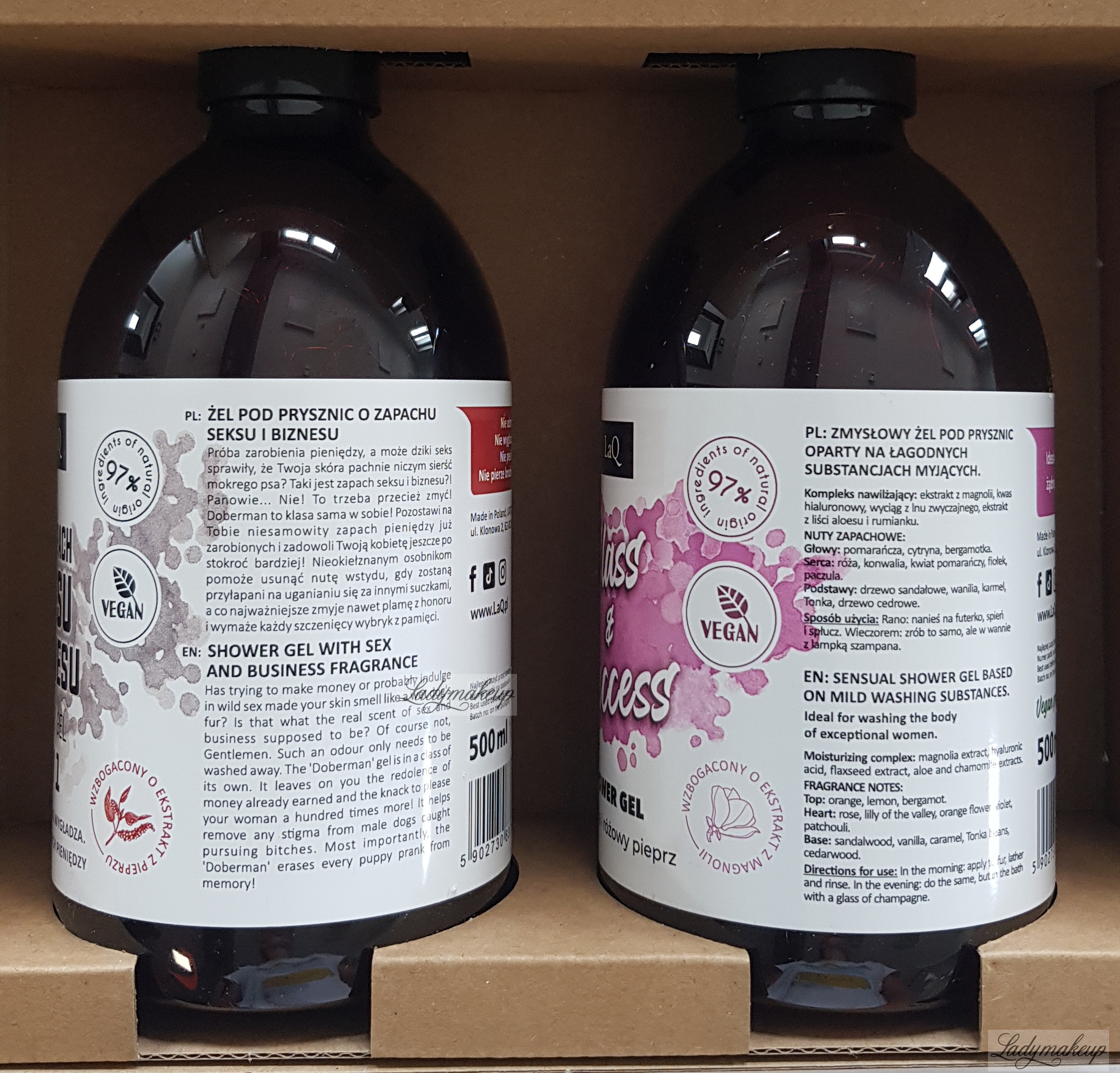 - Seks i Biznes 8w1 Shower Gel. Żel pod prysznic. Przeznaczony do codziennej pielęgnacji męskiej skóry. Aż w 97% składa się z produktów pochodzenia naturalnego. Dokładnie myje i oczyszcza skórę z wszelkich zanieczyszczeń. Pozostawia uczucie świeżości i orzeźwienia. Wzbogacony został m.in. o ekstrakty z kardamonu i czarnego pieprzu, a także kwas mlekowy i glicerynę. Kosmetyk nie zawiera silikonów w składzie. Został umieszczony w plastikowej butelce z pompką, na której widnieje zabawna grafika i tekst. Żel posiada delikatny męski aromat.