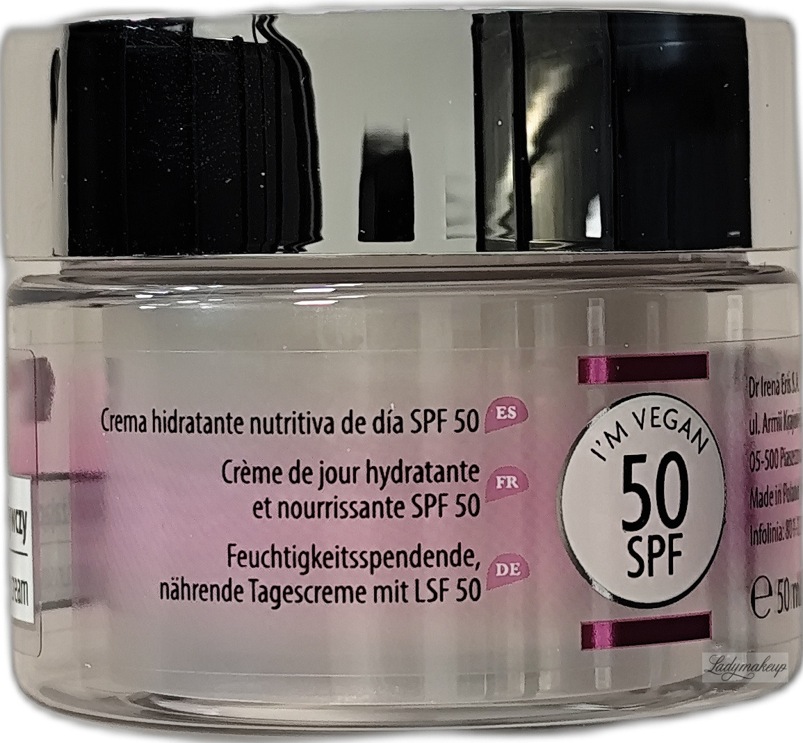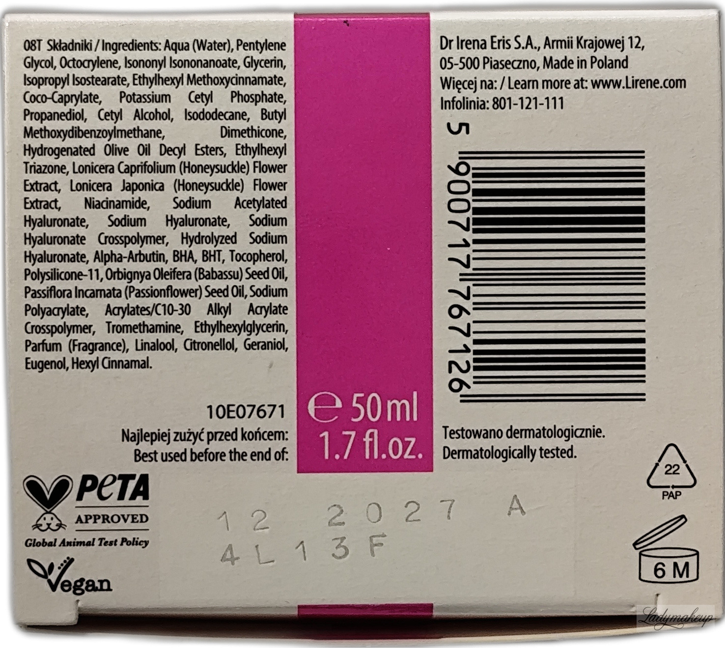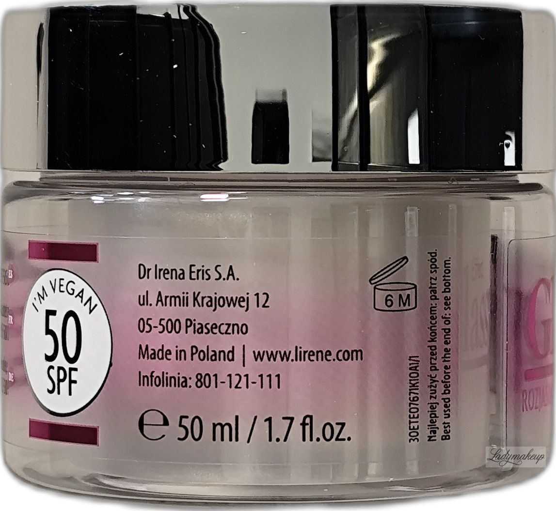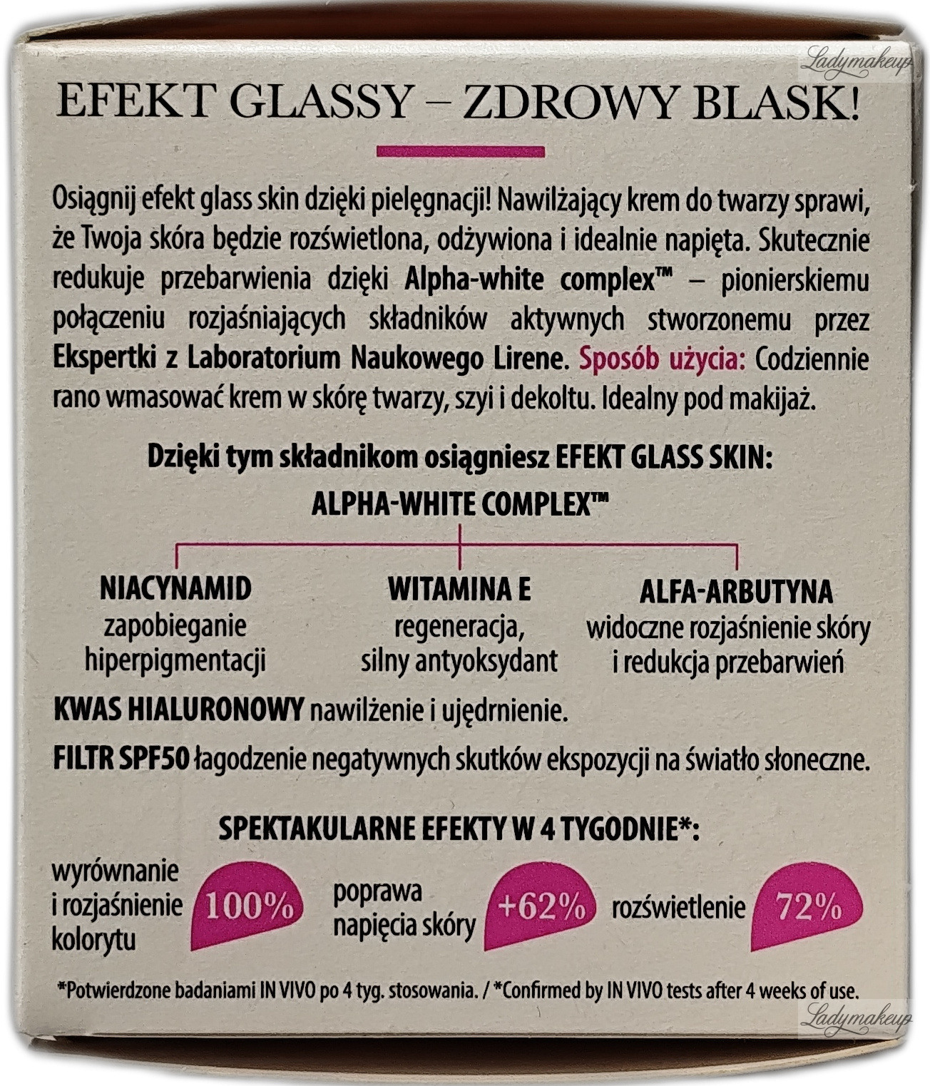 Krem do twarzy . Jest w 100% wegański. Doskonale sprawdzi się pod makijaż, a także do pielęgnacji skóry każdego rodzaju. Swoje działanie opiera na bazie specjalnie wyselekcjonowanych składników aktywnych, takich jak: niacynamid, witamina E, alfa arbutyna oraz kwas hialuronowy, które pielęgnują cerę. Krem Lirene intensywnie nawilża naskórek na długie godziny, a także sprawia, że skóra jest przyjemnie miękka, gładka oraz znacznie bardziej napięta i ujędrniona. Dodatkowo rozjaśnia przebarwienia, wyrównuje koloryt naskórka oraz dogłębnie odżywia i regeneruje skórę. Dodatek filtra SPF50 zapewnia niezwykle skuteczną oraz wysoką ochronę przed szkodliwym działaniem promieni słonecznych UVA i UVB. Lirene krem SPF 50 dostępny jest w opakowaniu o pojemności 50 ml.