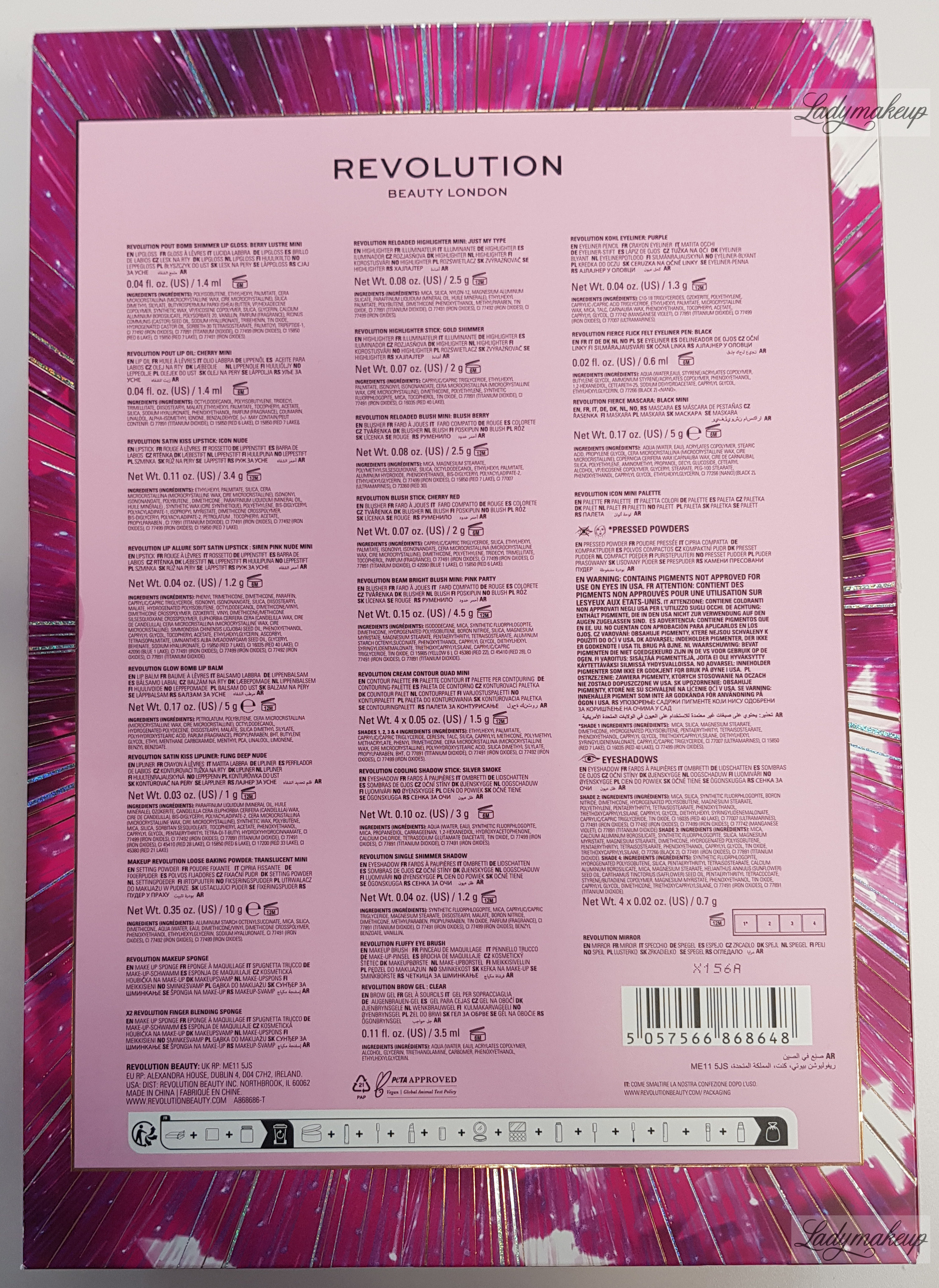 REVOLUTION POUT BOMB SHIMMER LIP GLOSS BERRY LUSTRE MINI (INGREDIENTS): POLYISOBUTENE, ETHYLHEXYL PALMITATE, CERA MICROCRISTALLINA (MICROCRYSTALLINE WAX, CIRE MICROCRYSTALLINE), SILICA DIMETHYL SILYLATE, BUTYROSPERMUM PARKII (SHEA) BUTTER, VP/HEXADECENE COPOLYMER, SYNTHETIC WAX, VP/EICOSENE COPOLYMER, SILICA, GLYCERIN, CALCIUM ALUMINIUM BOROSILICATE, POLYSORBATE 20, VANILLIN, PARFUM (FRAGRANCE), RICINUS COMMUNIS (CASTOR) SEED OIL, SODIUM HYALURONATE, TRIBEHENIN, TIN OXIDE, HYDROGENATED CASTOR OIL, SORBETH-30 TETRAISOSTEARATE, PALMITOYL TRIPEPTIDE-1, CI 77492 (IRON OXIDES), CI 77891 (TITANIUM DIOXIDE), CI 77499 (IRON OXIDES), CI 15850 (RED 6 LAKE), CI 15850 (RED 7 LAKE), CI 77491 (IRON OXIDES). REVOLUTION POUT LIP OIL CHERRY MINI (INGREDIENTS): OCTYLDODECANOL, POLYISOBUTYLENE, TRIDECYL TRIMELLITATE, DIISOSTEARYL MALATE, ETHYLHEXYL PALMITATE, TOCOPHERYL ACETATE, SILICA, SODIUM HYALURONATE, PHENOXYETHANOL, PARFUM (FRAGRANCE), COUMARIN, LINALOOL, ALPHA-ISOMETHYL IONONE, BENZALDEHYDE. [+/- MAY CONTAIN/PEUT CONTENIR: CI 77891 (TITANIUM DIOXIDE), CI 15850 (RED 6 LAKE), CI 15850 (RED 7 LAKE)]. REVOLUTION SATIN KISS LIPSTICK ICON NUDE (INGREDIENTS): ETHYLHEXYL PALMITATE, SILICA, CERA MICROCRISTALLINA (MICROCRYSTALLINE WAX, CIRE MICROCRISTALLINE), ISONONYL ISONONANOATE, POLYBUTENE , DIMETHICONE , PARAFFINIUM LIQUIDUM (MINERAL OIL, HUILE MINÉRALE) , SYNTHETIC WAX (CIRE SYNTHETIQUE), POLYETHYLENE, BIS-DIGLYCERYL POLYACYLADIPATE-1, ISOPROPYL MYRISTATE, DIMETHICONE CROSSPOLYMER, BIS-DIGLYCERYL POLYACYLADIPATE-2, PETROLATUM , TOCOPHERYL ACETATE, PROPYLPARABEN , CI 77891 (TITANIUM DIOXIDE), CI 77491 (IRON OXIDES), CI 77492 (IRON OXIDES), CI 77499 (IRON OXIDES), CI 15850 (RED 7 LAKE). REVOLUTION LIP ALLURE SOFT SATIN LIPSTICK SIREN PINK NUDE MINI (INGREDIENTS): PHENYL TRIMETHICONE, DIMETHICONE, PARAFFIN, CAPRYLIC/CAPRIC TRIGLYCERIDE, ISONONYL ISONONANOATE, SILICA, DIISOSTEARYL MALATE, HYDROGENATED POLYISOBUTENE, OCTYLDODECANOL, DIMETHICONE/VINYL DIMETHICONE CROSSPOLYMER, OZOKERITE, VINYL DIMETHICONE/METHICONE SILSESQUIOXANE CROSSPOLYMER, EUPHORBIA CERIFERA CERA (CANDELILLA WAX, CIRE DE CANDELILLA), CERA MICROCRISTALLINA (MICROCRYSTALLINE WAX, CIRE MICROCRISTALLINE), SIMMONDSIA CHINENSIS (JOJOBA) SEED OIL, PHENOXYETHANOL, CAPRYLYL GLYCOL, TOCOPHERYL ACETATE, ETHYLHEXYLGLYCERIN, ASCORBYL TETRAISOPALMITATE, LIMNANTHES ALBA (MEADOWFOAM) SEED OIL, GLYCERYL BEHENATE, SODIUM HYALURONATE, CI 15850 (RED 7 LAKE), CI 16035 (RED 40 LAKE), CI 42090 (BLUE 1 LAKE), CI 77491 (IRON OXIDES), CI 77499 (IRON OXIDES), CI 77492 (IRON OXIDES), CI 77891 (TITANIUM DIOXIDE). REVOLUTION GLOW BOMB LIP BALM (INGREDIENTS): PETROLATUM, POLYBUTENE, CERA MICROCRISTALLINA (MICROCRYSTALLINE WAX, CIRE MICROCRISTALLINE), OCTYLDODECANOL, HYDROGENATED POLYDECENE, DIISOSTEARYL MALATE, SILICA DIMETHYL SILYLATE, POLYHYDROXYSTEARIC ACID, PARUM (FRAGRANCE), PROPYLPARABEN, BHT, BUTYLENE GLYCOL, ETHYL MENTHANE CARBOXAMIDE, MENTHYL PCA, LINALOOL, LIMONENE, BENZYL BENZOATE. REVOLUTION SATIN KISS LIPLINER FLING DEEP NUDE (INGREDIENTS): PARAFFINUM LIQUIDUM (MINERAL OIL, HUILE MINERALE), OZOKERITE, CANDELILLA CERA (EUPHORBIA CERIFERA (CANDELILLA) WAX, CIRE DE CANDELILLA), BIS-DIGLYCERYL POLYACYLADIPATE-2, CERA MICROCRISTALLINA (MICROCRYSTALLINE WAX, CIRE MICROCRYSTALLINE), SYNTHETIC WAX, POLYBUTENE, MICA, SILICA, SORBITAN SESQUIOLEATE, TOCOPHERYL ACETATE, PHENOXYETHANOL, CAPRYLYL GLYCOL, PENTAERYTHRITYL TETRA-DI-T-BUTYL HYDROXYHYDROCINNAMATE, CI 77499 (IRON OXIDES), CI 77492 (IRON OXIDES), CI 77891 (TITANIUM DIOXIDE), CI 77491 (IRON OXIDES), CI 45410 (RED 28 LAKE), CI 15850 (RED 6 LAKE), CI 17200 (RED 33 LAKE), CI 45380 (RED 21 LAKE). MAKEUP REVOLUTION LOOSE BAKING POWDER TRANSLUCENT MINI (INGREDIENTS): ALUMINUM STARCH OCTENYLSUCCINATE, MICA, SILICA, DIMETHICONE, AQUA (WATER, EAU), DIMETHICONE/VINYL DIMETHICONE CROSSPOLYMER, PHENOXYETHANOL, ETHYLHEXYLGLYCERIN, SODIUM HYALURONATE, CI 77491 (IRON OXIDES), CI 77492 (IRON OXIDES), CI 77499 (IRON OXIDES). REVOLUTION RELOADED HIGHLIGHTER MINI JUST MY TYPE (INGREDIENTS): MICA, SILICA, NYLON-12, MAGNESIUM ALUMINUM SILICATE, PARAFFINUM LIQUIDUM (MINERAL OIL, HUILE MINERALE), ETHYLHEXYL PALMITATE, POLYBUTENE, DIMETHICONE PHENOXYETHANOL, METHYLPARABEN, TIN OXIDE, CI 77891 (TITANIUM DIOXIDE), CI 77491 (IRON OXIDES), CI 77492 (IRON OXIDES), CI 77499 (IRON OXIDES). REVOLUTION HIGHLIGHTER STICK GOLD SHIMMER (INGREDIENTS): CAPRYLIC/CAPRIC TRIGLYCERIDE, ETHYLHEXYL PALMITATE, ISONONYL ISONONANOATE, CERA MICROCRISTALLINA (MICROCRYSTALLINE WAX, CIRE MICROCRYSTALLINE), DIMETHICONE, POLYETHYLENE, SYNTHETIC FLUORPHLOGOPITE, MICA, TOCOPHEROL, TIN OXIDE, CI 77891 (TITANIUM DIOXIDE), CI 77491 (IRON OXIDES), CI 16035 (RED 40 LAKE). REVOLUTION RELOADED BLUSH MINI BLUSH BERRY (INGREDIENTS): MICA, MAGNESIUM STEARATE, POLYMETHYLSILSESQUIOXANE, SILICA, OCTYLDODECANOL, ETHYLHEXYL PALMITATE, ALUMINUM HYDROXIDE, PHENOXYETHANOL, BIS-DIGLYCERYL POLYACYLADIPATE-2, ETHYLHEXYLGLYCERIN, CI 77499 (IRON OXIDES), CI 15850 (RED 7 LAKE), CI 77007 (ULTRAMARINES), CI 73360 (RED 30). REVOLUTION BLUSH STICK PINK (INGREDIENTS): CAPRYLIC/CAPRIC TRIGLYCERIDE, SILICA, ETHYLHEXYL PALMITATE, ISONONYL ISONONANOATE, CERA MICROCRISTALLINA (MICROCRYSTALLINE WAX, CIRE MICROCRYSTALLINE), DIMETHICONE, POLYETHYLENE, TRIDECYL TRIMELLITATE, TOCOPHEROL, PARFUM (FRAGRANCE), CI 77491 (IRON OXIDES), CI 77499 (IRON OXIDES), CI 77891 (TITANIUM DIOXIDE), CI 42090 (BLUE 1 LAKE), CI 15850 (RED 6 LAKE). REVOLUTION BEAM BRIGHT BLUSH MINI PINK PARTY (INGREDIENTS): ISODODECANE, MICA, SYNTHETIC FLUORPHLOGOPITE, DIMETHICONE, HYDROGENATED POLYISOBUTENE, BORON NITRIDE, SILICA, MAGNESIUM MYRISTATE, MAGNESIUM STEARATE, PENTAERYTHRITYL TETRAISOSTEARATE, ALUMINUM STARCH OCTENYLSUCCINATE, PHENOXYETHANOL, CAPRYLYL GLYCOL, DIETHYLHEXYL SYRINGYLIDENEMALONATE, TRIETHOXYCAPRYLYLSILANE, CAPRYLIC/CAPRIC TRIGLYCERIDE, TIN OXIDE, CI 15985 (YELLOW 6), CI 45380 (RED 22), CI 45410 (RED 28), CI 77491 (IRON OXIDES), CI 77891 (TITANIUM DIOXIDE). REVOLUTION CREAM CONTOUR QUAD MINI (INGREDIENTS): SHADES 1,