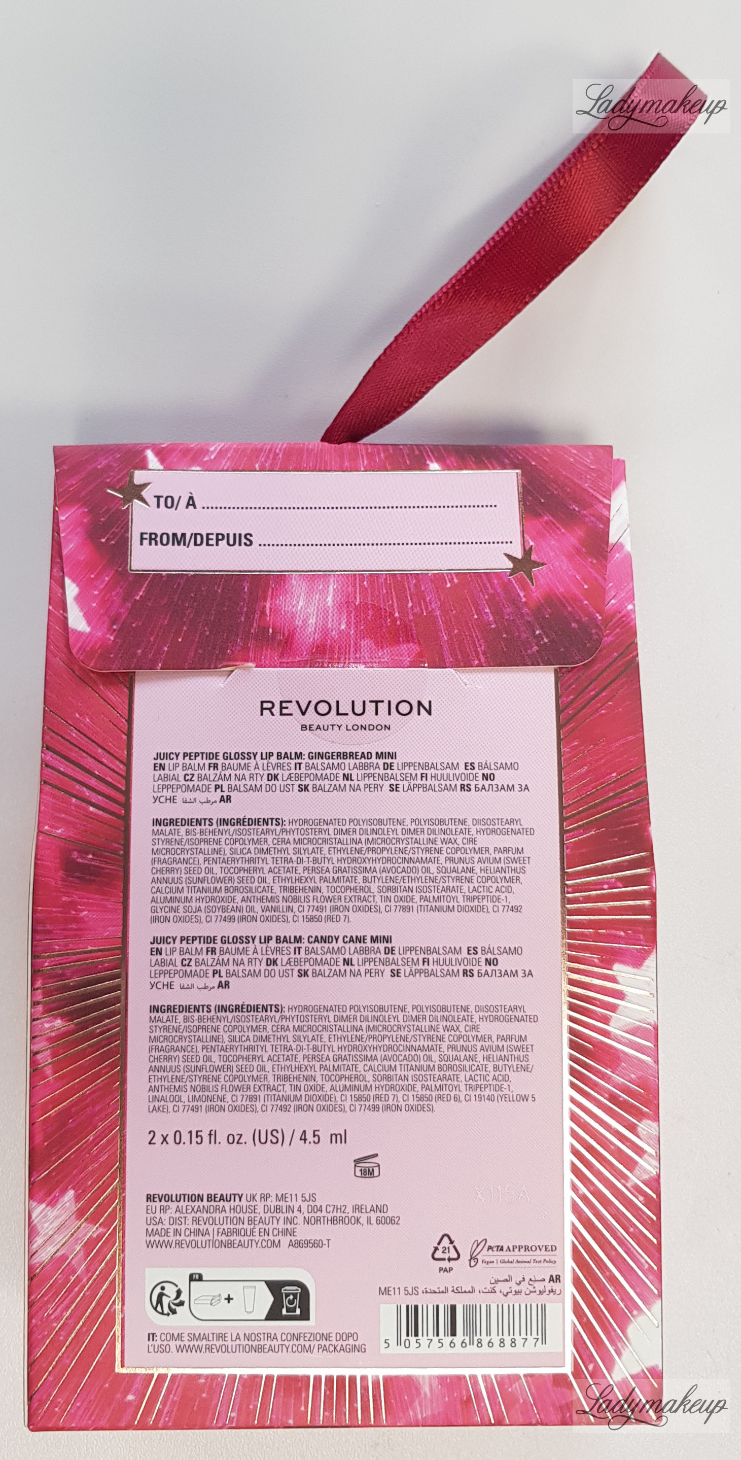 Zestaw prezentowy. Składa się z balsamów do ust z pielęgnacyjnymi peptydami o różnych odcieniach: Gingerbread Mini oraz Candy Cane Mini. Niewielkie rozmiary kosmetyków idealnie sprawdzą się w podróży, gdyż zmieszczą się nawet do małej kosmetyczki czy torebki. Razem tworzą niezastąpiony duet dla każdej miłośniczki zadbanych warg. Produkty zostały wzbogacone o pielęgnacyjne peptydy, które dobrze nawilżają oraz odżywiają naskórek. Po aplikacji na skórę pozostawia na ustach kuszące błyszczące wykończenie. Całość została umieszczona w poręcznym kartonowym opakowaniu w uroczym, kobiecym odcieniu malinowego różu z wstążeczką. Doskonale sprawdzi się jako prezent dla bliskiej osoby.