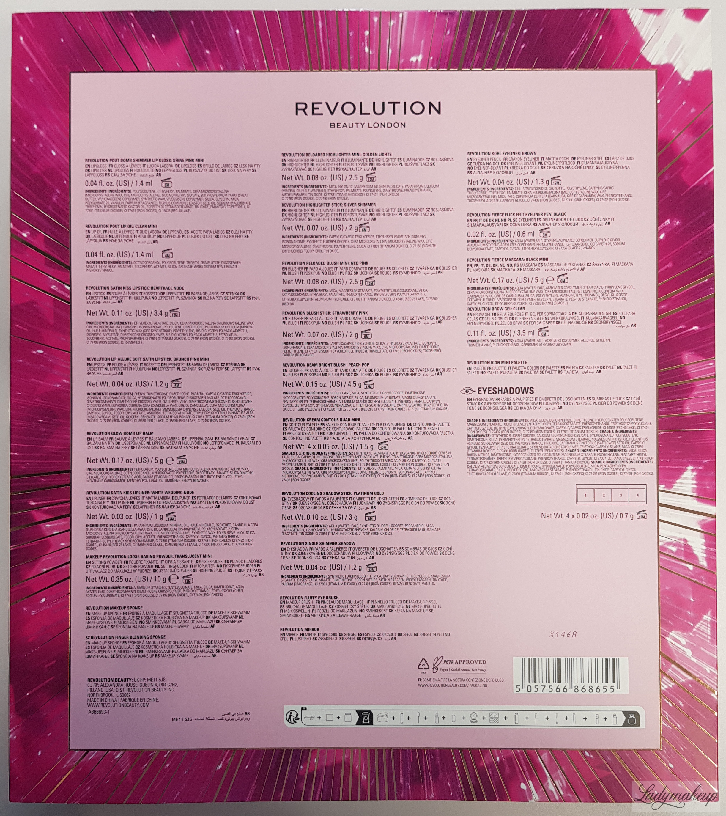 REVOLUTION POUT BOMB SHIMMER LIP GLOSS SHINE PINK MINI POLYISOBUTENE, ETHYLHEXYL PALMITATE, CERA MICROCRISTALLINA (MICROCRYSTALLINE WAX, CIRE MICROCRYSTALLINE), SILICA DIMETHYL SILYLATE, BUTYROSPERMUM PARKII (SHEA) BUTTER, VP/HEXADECENE COPOLYMER, SYNTHETIC WAX, VP/EICOSENE COPOLYMER, SILICA, GLYCERIN, MICA, POLYSORBATE 20, VANILLIN, PARFUM (FRAGRANCE), RICINUS COMMUNIS (CASTOR) SEED OIL, SODIUM HYALURONATE, TRIBEHENIN, HYDROGENATED CASTOR OIL, SORBETH-30 TETRAISOSTEARATE, TIN OXIDE, PALMITOYL TRIPEPTIDE-1, CI 77891 (TITANIUM DIOXIDE), CI 77491 (IRON OXIDES), CI 16035 (RED 40 LAKE). REVOLUTION POUT LIP OIL CLEAR MINI OCTYLDODECANOL, POLYISOBUTENE, TRIDECYL TRIMELLITATE, DIISOSTEARYL MALATE, ETHYLHEXYL PALMITATE, TOCOPHERYL ACETATE, SILICA, AROMA (FLAVOR), SODIUM HYALURONATE, PHENOXYETHANOL. REVOLUTION SATIN KISS LIPSTICK HEARTRACE NUDE ETHYLHEXYL PALMITATE, SILICA, CERA MICROCRISTALLINA (MICROCRYSTALLINE WAX, CIRE MICROCRYSTALLINE), ISONONYL ISONONANOATE, POLYBUTENE, DIMETHICONE, PARAFFINIUM LIQUIDUM (MINERAL OIL, HUILE MINERALE), SYNTHETIC WAX (CIRE SYNTHETIQUE), POLYETHYLENE, BIS-DIGLYCERYL POLYACYLADIPATE-1, ISOPROPYL MYRISTATE, DIMETHICONE CROSSPOLYMER, BIS-DIGLYCERYL POLYACYLADIPATE-2, PETROLATUM, TOCOPHERYL ACETATE, PROPYLPARABEN, CI 77891 (TITANIUM DIOXIDE), CI 77491 (IRON OXIDES), CI 77492 (IRON OXIDES), CI 77499 (IRON OXIDES), CI 15850 (RED 7). REVOLUTION LIP ALLURE SOFT SATIN LIPSTICK BRUNCH PINK MINI PHENYL TRIMETHICONE, DIMETHICONE, PARAFFIN, CAPRYLIC/CAPRIC TRIGLYCERIDE, ISONONYL ISONONANOATE, SILICA, HYDROGENATED POLYISOBUTENE, DIISOSTEARYL MALATE, OCTYLDODECANOL, DIMETHICONE/VINYL DIMETHICONE CROSSPOLYMER, OZOKERITE, VINYL DIMETHICONE/METHICONE SILSESQUIOXANE CROSSPOLYMER, EUPHORBIA CERIFERA CERA (CANDELILLA WAX, CIRE DE CANDELILLA), CERA MICROCRISTALLINA (MICROCRYSTALLINE WAX, CIRE MICROCRYSTALLINE), SIMMONDSIA CHINENSIS (JOJOBA) SEED OIL, PHENOXYETHANOL, CAPRYLYL GLYCOL, TOCOPHERYL ACETATE, ASCORBYL TETRAISOPALMITATE, ETHYLHEXYLGLYCERIN, LIMNANTHES ALBA (MEADOWFOAM) SEED OIL, GLYCERYL BEHENATE, SODIUM HYALURONATE, CI 77891 (TITANIUM DIOXIDE), CI 77491 (IRON OXIDES), CI 77499 (IRON OXIDES), CI 15850 (RED 7 LAKE), CI 15850 (RED 6 LAKE), CI 77492 (IRON OXIDES). REVOLUTION GLOW BOMB LIP BALM PETROLATUM, POLYBUTENE, CERA MICROCRISTALLINA (MICROCRYSTALLINE WAX, CIRE MICROCRYSTALLINE), OCTYLDODECANOL, HYDROGENATED POLYDECENE, DIISOSTEARYL MALATE, SILICA DIMETHYL SILYLATE, POLYHYDROXYSTEARIC ACID, PARUM (FRAGRANCE), PROPYLPARABEN, BHT, BUTYLENE GLYCOL, ETHYL MENTHANE CARBOXAMIDE, MENTHYL PCA, LINALOOL, LIMONENE, BENZYL BENZOATE. REVOLUTION SATIN KISS LIPLINER WHITE WEDDING NUDE PARAFFINUM LIQUIDUM (MINERAL OIL, HUILE MINERALE), OZOKERITE, CANDELILLA CERA (EUPHORBIA CERIFERA (CANDELILLA) WAX, CIRE DE CANDELILLA), BIS-DIGLYCERYL POLYACYLADIPATE-2, CERA MICROCRISTALLINA (MICROCRYSTALLINE WAX, CIRE MICROCRYSTALLINE), SYNTHETIC WAX, POLYBUTENE, MICA, SILICA, SORBITAN SESQUIOLEATE, TOCOPHERYL ACETATE, PHENOXYETHANOL, CAPRYLYL GLYCOL, PENTAERYTHRITYL TETRA-DI-T-BUTYL HYDROXYHYDROCINNAMATE, CI 77891 (TITANIUM DIOXIDE), CI 77491 (IRON OXIDES), CI 77492 (IRON OXIDES), CI 45410 (RED 28 LAKE), CI 15850 (RED 6 LAKE), CI 45380 (RED 21 LAKE), CI 17200 (RED 33 LAKE), CI 77499 (IRON OXIDES). MAKEUP REVOLUTION LOOSE BAKING POWDER TRANSLUCENT MINI ALUMINUM STARCH OCTENYLSUCCINATE, MICA, SILICA, DIMETHICONE, AQUA (WATER, EAU), DIMETHICONE/VINYL DIMETHICONE CROSSPOLYMER, PHENOXYETHANOL, ETHYLHEXYLGLYCERIN, SODIUM HYALURONATE, CI 77491 (IRON OXIDES), CI 77492 (IRON OXIDES), CI 77499 (IRON OXIDES). REVOLUTION MAKEUP SPONGE X2 REVOLUTION FINGER BLENDING SPONGE REVOLUTION RELOADED HIGHLIGHTER MINI GOLDEN LIGHTS MICA, NYLON-12, MAGNESIUM ALUMINUM SILICATE, PARAFFINUM LIQUIDUM (MINERAL OIL, HUILE MINERALE), ETHYLHEXYL PALMITATE, POLYBUTENE, DIMETHICONE, PHENOXYETHANOL, METHYLPARABEN, TIN OXIDE, CI 77891 (TITANIUM DIOXIDE), CI 77491 (IRON OXIDES), CI 77492 (IRON OXIDES), CI 77499 (IRON OXIDES). REVOLUTION HIGHLIGHTER STICK SILVER SHIMMER CAPRYLIC/CAPRIC TRIGLYCERIDE, ETHYLHEXYL PALMITATE, ISONONYL ISONONANOATE, SYNTHETIC FLUORPHLOGOPITE, CERA MICROCRISTALLINA (MICROCRYSTALLINE WAX, CIRE MICROCRYSTALLINE), DIMETHICONE, POLYETHYLENE, SILICA, CI 77891 (TITANIUM DIOXIDE), CI 77163 (BISMUTH OXYCHLORIDE), TOCOPHEROL, TIN OXIDE. REVOLUTION RELOADED BLUSH MINI NEO PINK MICA, MAGNESIUM STEARATE, POLYMETHYLSILSESQUIOXANE, SILICA, OCTYLDODECANOL, ETHYLHEXYL PALMITATE, PHENOXYETHANOL, BIS-DIGLYCERYL POLYACYLADIPATE-2, ETHYLHEXYLGLYCERIN, ALUMINUM HYDROXIDE, CI 77891 (TITANIUM DIOXIDE), CI 45410 (RED 28 LAKE), CI 73360(RED 30). REVOLUTION BLUSH STICK PINK CAPRYLIC/CAPRIC TRIGLYCERIDE, SILICA, ETHYLHEXYL PALMITATE, ISONONYL ISONONANOATE, CERA MICROCRISTALLINA (MICROCRYSTALLINE WAX, CIRE MICROCRYSTALLINE), DIMETHICONE, POLYETHYLENE, CI 77163 (BISMUTH OXYCHLORIDE), TRIDECYL TRIMELLITATE, CI 77491 (IRON OXIDES), TOCOPHEROL, PARFUM (FRAGRANCE). REVOLUTION BEAM BRIGHT BLUSH PEACH POP ISODODECANE, MICA, SYNTHETIC FLUORPHLOGOPITE, DIMETHICONE, HYDROGENATED POLYISOBUTENE, BORON NITRIDE, SILICA, MAGNESIUM MYRISTATE, MAGNESIUM STEARATE, PENTAERYTHRITYL TETRAISOSTEARATE, ALUMINUM STARCH OCTENYLSUCCINATE, PHENOXYETHANOL, CAPRYLYL GLYCOL, DIETHYLHEXYL SYRINGYLIDENEMALONATE, TRIETHOXYCAPRYLYLSILANE, CAPRYLIC/CAPRIC TRIGLYCERIDE, TIN OXIDE, CI 15985 (YELLOW 6 ), CI 45380 (RED 22), CI 45410 (RED 28), CI 77491 (IRON OXIDES), CI 77891 (TITANIUM DIOXIDE). REVOLUTION CREAM CONTOUR QUAD MINI SHADES 1, 3, 4: ETHYLHEXYL PALMITATE, CAPRYLIC/CAPRIC TRIGLYCERIDE, CERESIN, TALC, SILICA, CAPRYLYL METHICONE, POLYMETHYL METHACRYLATE, PHENYL TRIMETHICONE, CERA MICROCRISTALLINA (MICROCRYSTALLINE WAX, CIRE MICROCRYSTALLINE), POLYHYDROXYSTEARIC ACID, SILICA DIMETHYL SILYLATE, PROPYLPARABEN, BHT, CI 77891 (TITANIUM DIOXIDE), CI 77491 (IRON OXIDES), CI 77492 (IRON OXIDES), CI 77499 (IRON OXIDES). SHADE 2: ETHYLHEXYL PALMITATE, MICA, CERA MICROCRISTALLINA (MICROCRYSTALLINE WAX, CIRE MICROCRYSTALLINE), DIMETHICONE, ISONONYL ISONONANOATE, CAPRYLYL METHICONE,