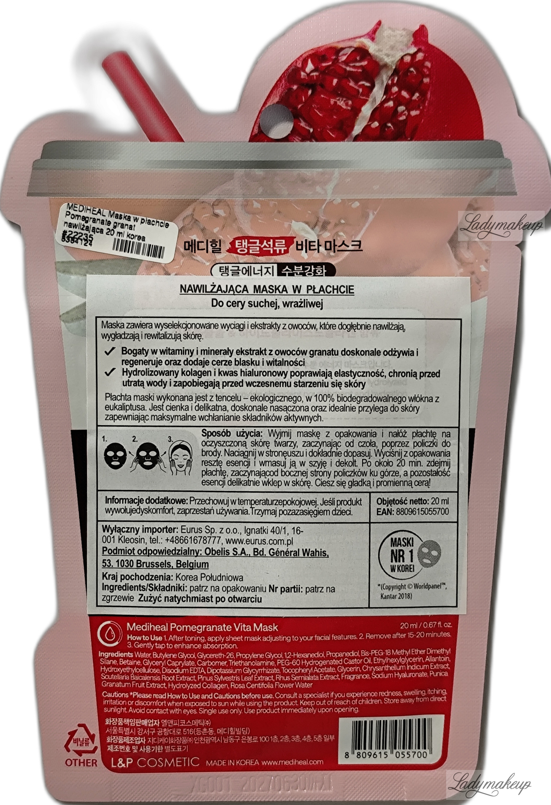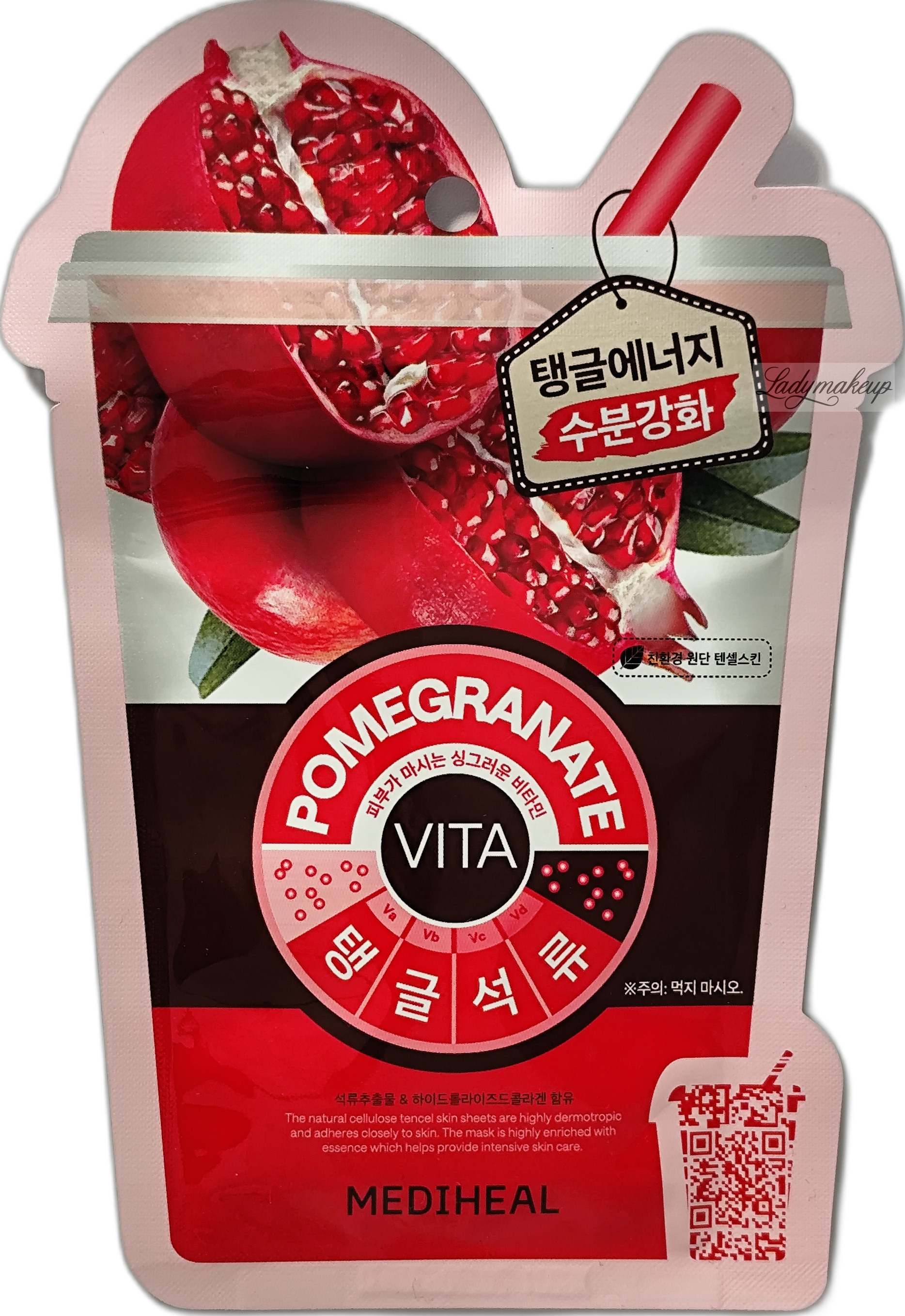 Maska do twarzy. Została stworzona specjalnie z myślą o pielęgnacji cery suchej oraz wrażliwej. Pochodzi z linii Vita, która czerpie wszystko, co najlepsze z natury poprzez wykorzystanie wyselekcjonowanych wyciągów i ekstraktów z owoców. W swoim składzie zawiera specjalnie wyselekcjonowane składniki aktywne takie jak: ekstrakt z owoców granatu, hydrolizowany kolagen oraz kwas hialuronowy. Płachta maski wykonana jest z materiału Tencel, który powstaje metodą nanotechnologii ze 100% celulozy z eukaliptusa. Mediheal maska intensywnie nawilża naskórek, widocznie poprawia strukturę skóry, odświeża i dodaje witalności. Dodatkowo działa antyoksydacyjnie, regenerująco oraz wygładzająco. W opakowaniu została umieszczona 1 sztuka maseczki na twarz.