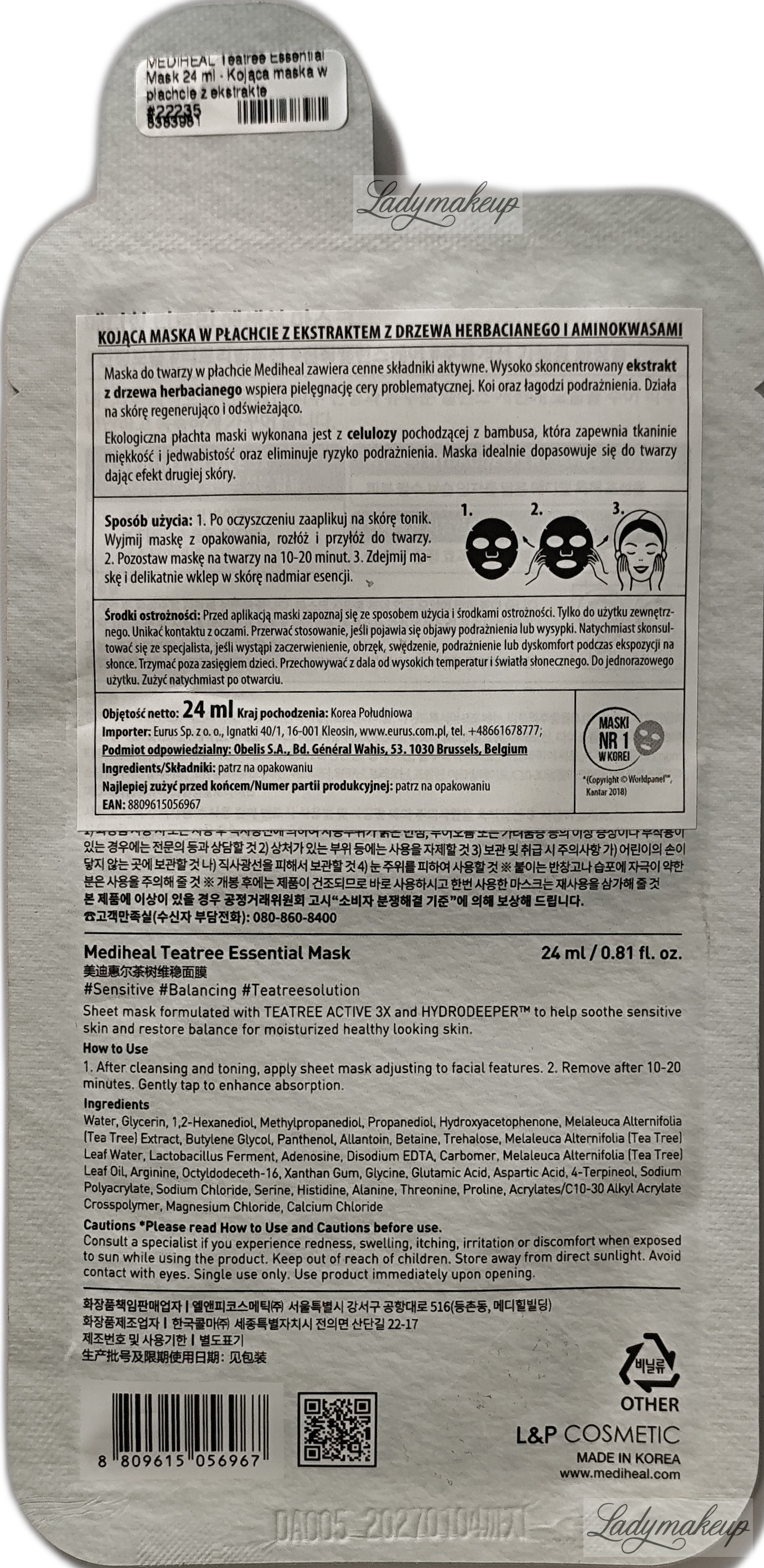 Maska do twarzy. Przeznaczona jest do pielęgnacji skóry każdego rodzaju. Została umieszczona na specjalnym hipoalergicznym płacie wykonanym w 100% z celulozy bambusa. Została silnie nasączona takimi składnikami aktywnymi jak: ekstrakt z drzewa herbacianego, bioferment z bakterii Lactobacillus, aminokwasy, alantoina i panthenol. Mediheal maska skutecznie koi i łagodzi podrażnienia, wspomaga i wzmacnia mikrobiom skóry, a także regeneruje. Ponadto maska Mediheal zmniejsza widoczność porów oraz nadaje skórze świeżego wyglądu, bez efektu świecenia się. W saszetce umieszczono 1 maskę.