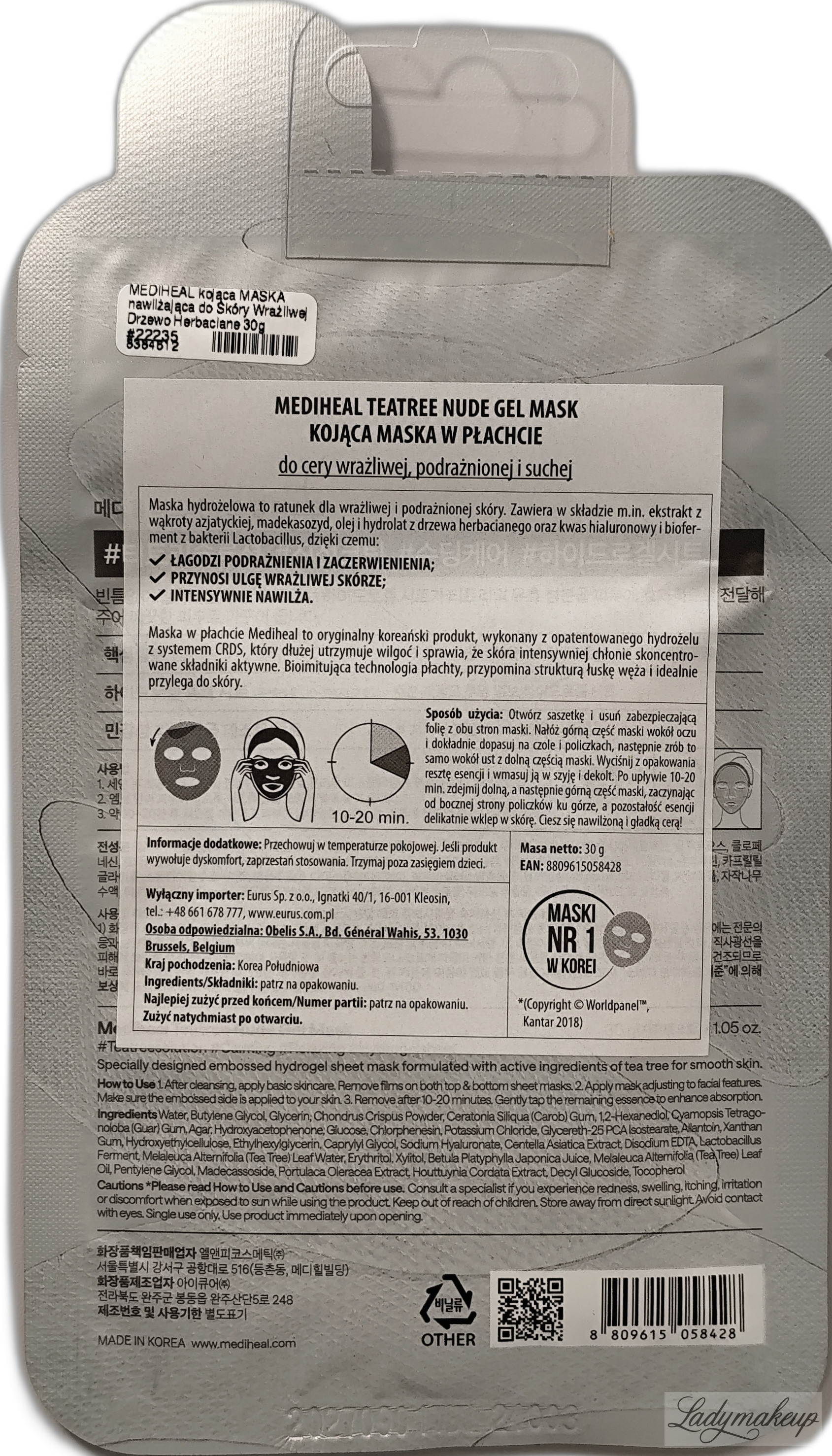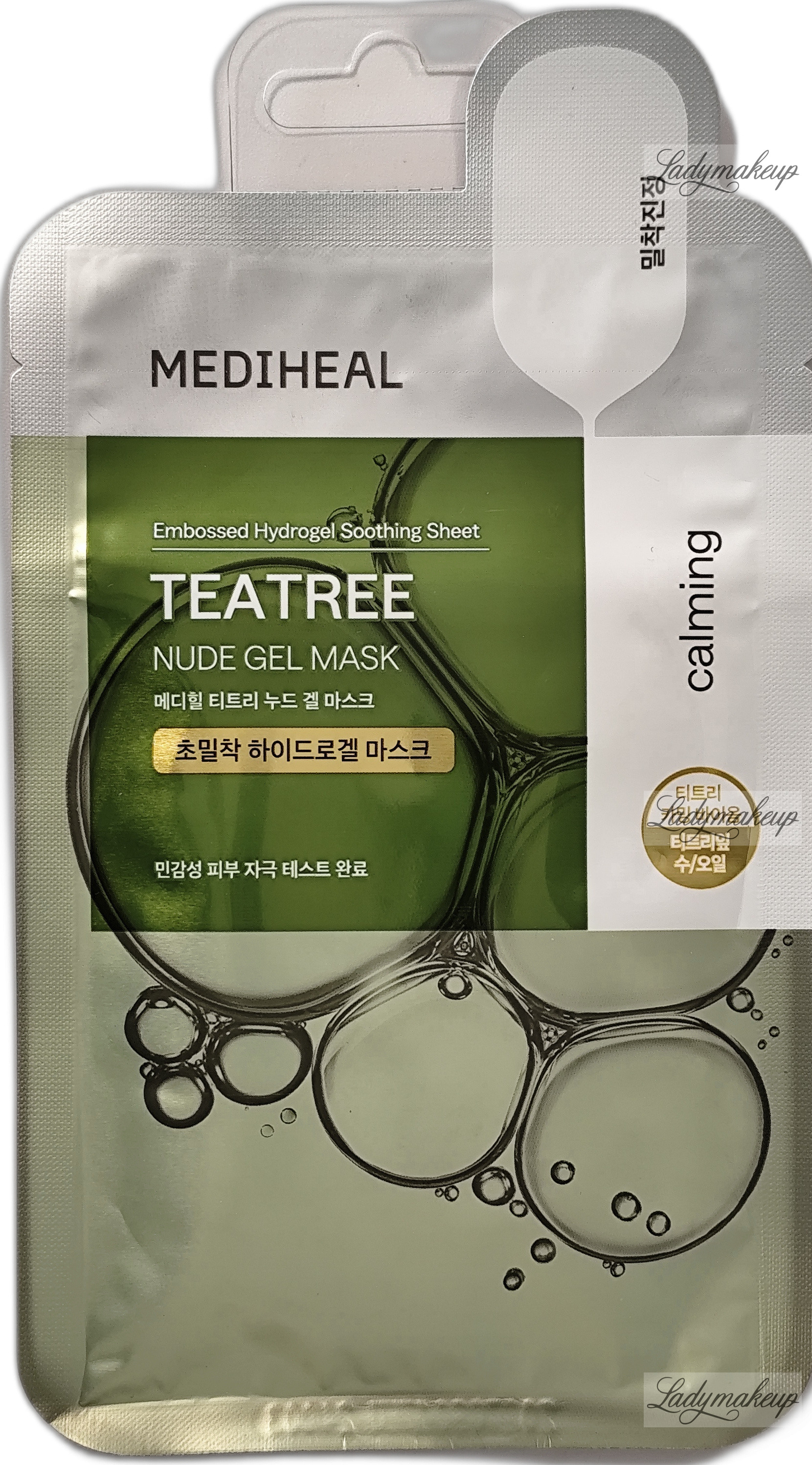 Maska do twarzy. Polecana jest do skóry wrażliwej, podrażnionej, suchej, wrażliwej i z tendencją do zaczerwienień. Wykonana została ze specjalnego hydrożelowego materiału, który dobrze przylega do skóry oraz dopasowuje się do kształtu twarzy. Składa się z dwóch części: pierwsza obejmuje czoło, okolice oczu oraz nos, zaś druga przeznaczona jest na obszar dookoła ust. Maska Mediheal nasączona została specjalnymi składnikami aktywnymi, takimi jak: woda i olejek z drzewa herbacianego, ekstrakt z wąkroty azjatyckiej, kwas hialuronowy, alantoina oraz fermenty. Dogłębnie nawilża, przyjemnie chłodzi skórę, a przy tym łagodzi i koi podrażnienia. Ponadto Mediheal maseczka działa antybakteryjnie i wzmacniająco, wyciszająco. W saszetce umieszczono 1 maskę.