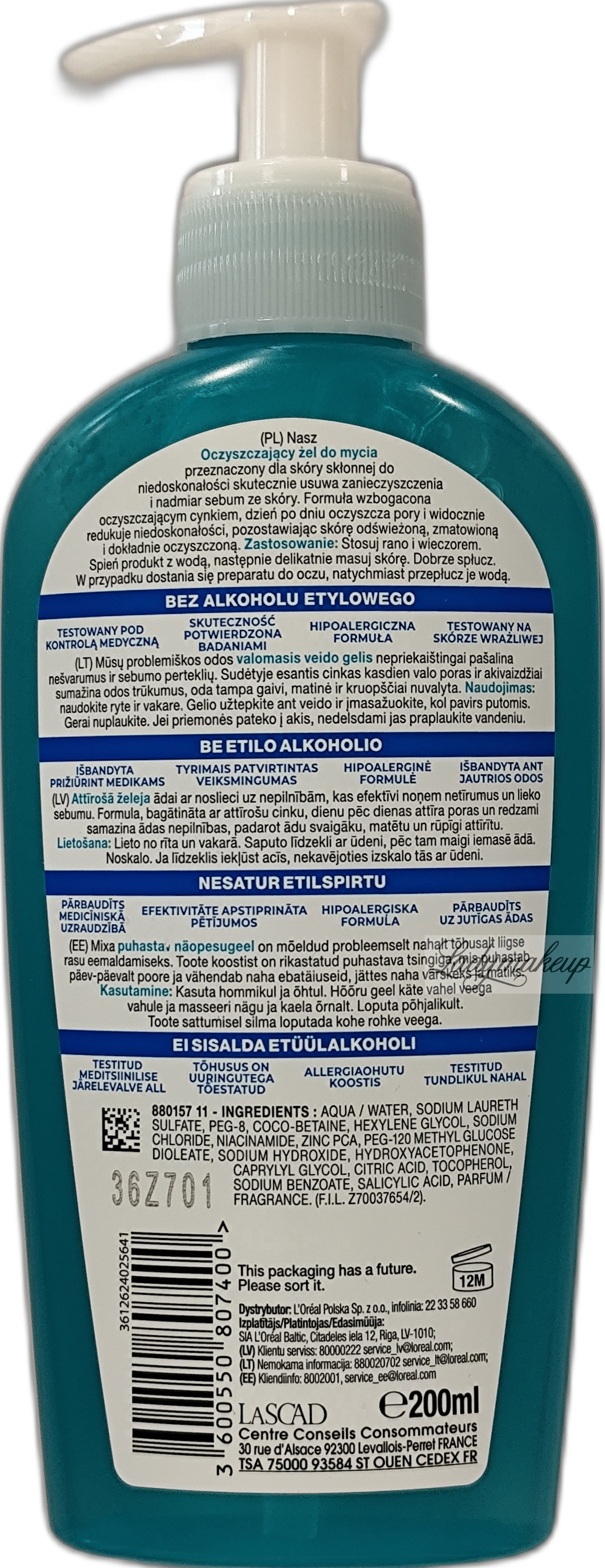 Przeznaczony do pielęgnacji cery wrażliwej i skorej do niedoskonałości. Zawiera specjalne połączenie składników aktywnych, w tym również cynk, które łagodnie oczyszczają pory skóry z zanieczyszczeń, pozostałości kosmetyków oraz nadmiaru sebum. Dodatkowo produkt zwalcza niedoskonałości oraz zmniejsza ryzyko ich ponownego powstania. Z myślą o wrażliwej skórze żel nie zawiera alkoholu etylowego oraz posiada neutralne pH, dzięki czemu kosmetyk nie podrażnia cery. Zamknięty w poręcznej butelce z pompką dozującą odpowiednią ilość produktu.