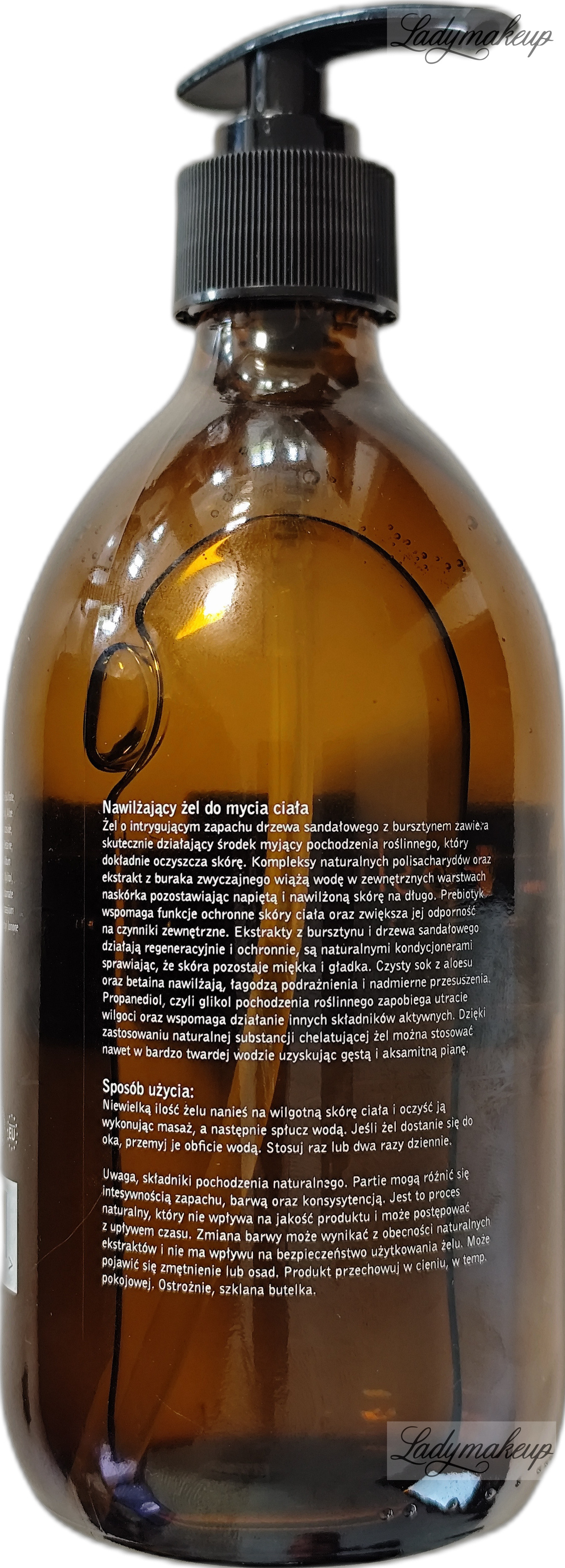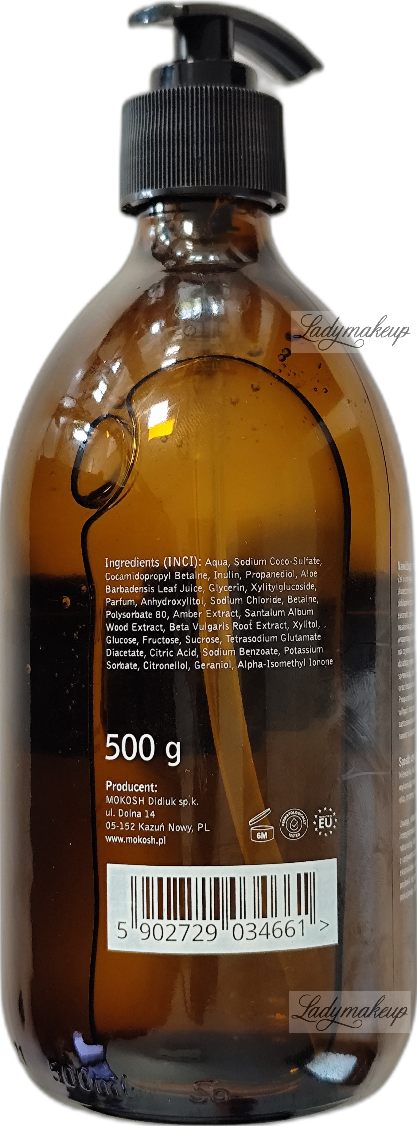 Jest w 100% wegański. Dobrze myje oraz delikatnie oczyszcza skórę z wszelkich zanieczyszczeń oraz brudu bez wywoływania podrażnień. Swoje dobroczynne działanie opiera na bazie specjalnie wyselekcjonowanych składników aktywnych takich jak m.in.: kompleksy naturalnych polisacharydów, ekstrakty z buraka zwyczajnego, bursztynu i drzewa sandałowego, prebiotyki, czysty sok z aloesu, betaina i propanediol. Żel Mokosh przyjemnie odświeża, a także długotrwale nawilża skórę całego ciała, sprawiając, że jest ona niezwykle miękka oraz gładka w dotyku. Po zastosowaniu tworzy na powierzchni skóry specjalną warstwę ochronną, która ogranicza utratę wody z naskórka, a także chroni przed szkodliwym działaniem czynników zewnętrznych. Żel Mokosh umieszczony został w butelce 500 g, wykonanej z grubego, mocnego szkła barwionego na ciemno.