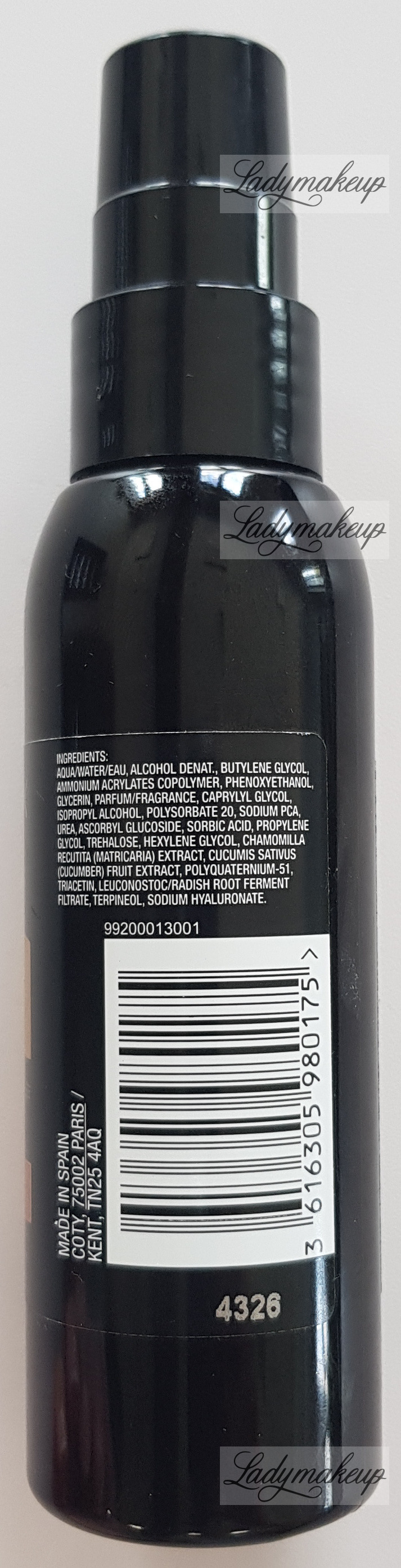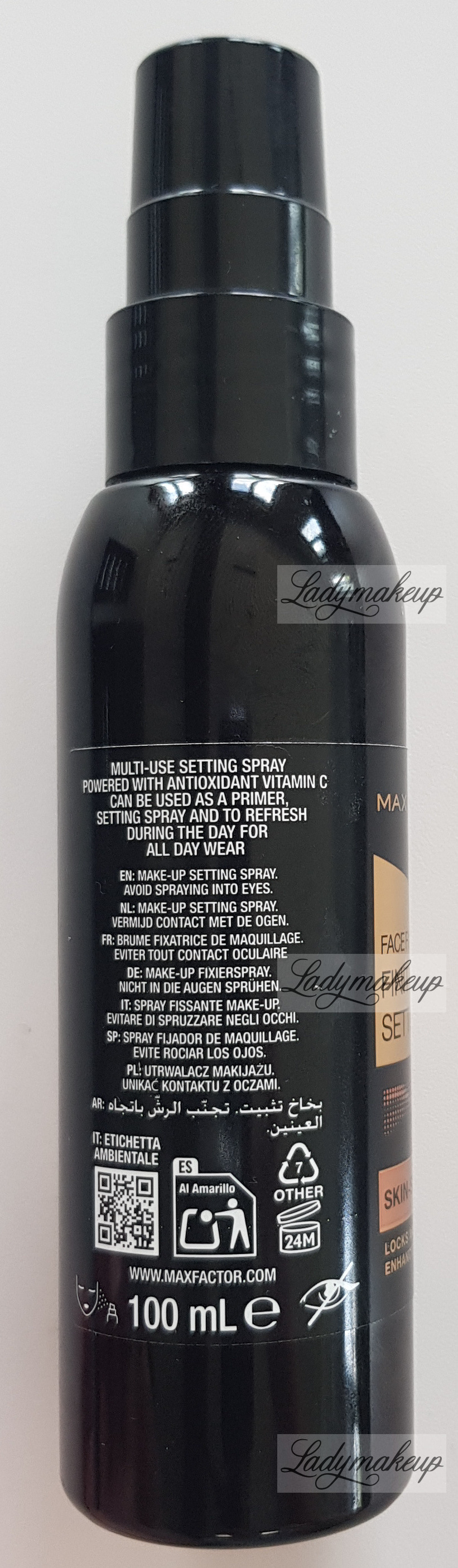 Utrwalacz do makijażu w spray'u. Skutecznie przedłuża trwałość make-up'u na długie godziny. Posiada formę delikatnej mgiełki, która nie tworzy na skórze smug, ani żadnych plam. Po aplikacji na skórę spray Max Factor zapewnia długotrwały i naturalny efekt, a także kuszące matowe wykończenie. Dodatkowo chroni cerę przed zanieczyszczeniami. Max Factor Facefinity spray utrwalający makijaż pozostawia na skórze przyjemne chłodzące wykończenie oraz odświeżający efekt. Kosmetyk został wzbogacony w witaminę C, dzięki czemu posiada silne właściwości antyoksydacyjne. Innowacyjna formuła błyskawicznie zasycha na skórze, a przy tym nie powoduje uczucia ściągnięcia. Max Factor mgiełka utrwalająca makijaż dostępna jest w butelce o pojemności 100 ml.