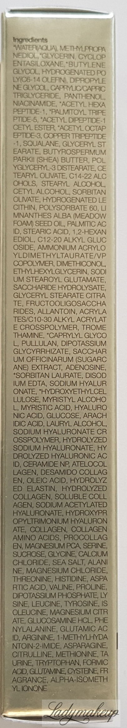 WATER (AQUA), METHYLPROPANEDIOL, GLYCERIN, CYCLOPENTASILOXANE, BUTYLENE GLYCOL, HYDROGENATED POLY(C6-14 OLEFIN), DIPROPYLENE GLYCOL, CAPRYLIC/CAPRIC TRIGLYCERIDE, PANTHENOL, NIACINAMIDE, ACETYL HEXAPEPTIDE-1, PALMITOYL TRIPEPTIDE-5, ACETYL DIPEPTIDE-1 CETYL ESTER, ACETYL OCTAPEPTIDE-3, COPPER TRIPEPTIDE-1, SQUALANE, GLYCERYL STEARATE, BUTYROSPERMUM PARKII (SHEA) BUTTER, POLYGLYCERYL-3 DISTEARATE, CETEARYL OLIVATE, C14-22 ALCOHOLS, STEARYL ALCOHOL, CETYL ALCOHOL, SORBITAN OLIVATE, HYDROGENATED LECITHIN, POLYSORBATE 60, LIMNANTHES ALBA (MEADOWFOAM) SEED OIL, PALMITIC ACID, STEARIC ACID, 1,2-HEXANEDIOL, C12-20 ALKYL GLUCOSIDE, AMMONIUM ACRYLOYLDIMETHYLTAURATE/VP COPOLYMER, DIMETHICONOL, ETHYLHEXYLGLYCERIN, SODIUM STEAROYL GLUTAMATE, SACCHARIDE HYDROLYSATE, GLYCERYL STEARATE CITRATE, FRUCTOOLIGOSACCHARIDES, ALLANTOIN, ACRYLATES/C10-30 ALKYL ACRYLATE CROSSPOLYMER, TROMETHAMINE, CAPRYLYL GLYCOL, PULLULAN, DIPOTASSIUM GLYCYRRHIZATE, SACCHARUM OFFICINARUM (SUGARCANE) EXTRACT, ADENOSINE, SORBITAN LAURATE, DISODIUM EDTA, SODIUM HYALURONATE, HYDROXYETHYLCELLULOSE, MYRISTYL ALCOHOL, MYRISTIC ACID, HYALURONIC ACID, GLUCOSE, ARACHIDIC ACID, LAURYL ALCOHOL, SODIUM HYALURONATE CROSSPOLYMER, HYDROLYZED SODIUM HYALURONATE, HYDROLYZED HYALURONIC ACID, CERAMIDE NP, ATELOCOLLAGEN, DESAMIDO COLLAGEN, OLEIC ACID, HYDROLYZED ELASTIN, HYDROLYZED COLLAGEN, SOLUBLE COLLAGEN, SODIUM ACETYLATED HYALURONATE, HYDROXYPROPYLTRIMONIUM HYALURONATE, COLLAGEN, COLLAGEN AMINO ACIDS, PROCOLLAGEN, MAGNESIUM PCA, SERINE, SUCROSE, GLYCINE, CALCIUM CHLORIDE, SEA SALT, ALANINE, MAGNESIUM CHLORIDE, THREONINE, HISTIDINE, ASPARTIC ACID, VALINE, PROLINE, DIPOTASSIUM PHOSPHATE, LYSINE, LEUCINE, TYROSINE, ISOLEUCINE, MAGNESIUM CITRATE, GLUCOSAMINE HCL, PHENYLALANINE, GLUTAMIC ACID, ARGININE, 1-METHYLHYDANTOIN-2-IMIDE, ASPARAGINE, CITRULLINE, METHIONINE, TAURINE, TRYPTOPHAN, FORMIC ACID, GLUTAMINE, CYSTEINE, FRAGRANCE, ALPHA-ISOMETHYL IONONE.