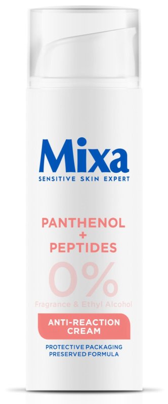 Krem do twarzy. Jest hipoalergiczny. Został stworzony specjalnie z myślą o skórze reaktywnej. Doskonale sprawdzi się do pielęgnacji delikatnej skóry powiek i pod oczami, a także całej twarzy. Krem Mixa skutecznie łączy w sobie pielęgnacyjne składniki aktywne takie jak: panthenol oraz peptydy. Kosmetyk zapewnia efekt dogłębnego nawilżenia do 48 godzin, łagodzi oraz koi podrażnienia, regeneruje, a także wspiera barierę ochronną skóry. Produkt dostępny jest w butelce o pojemności 50 ml.