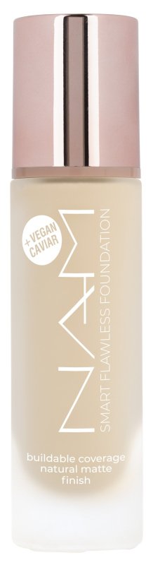 Podkład do twarzy. Jest w 100% wegański. Doskonale sprawdzi się do cery każdego rodzaju, również wrażliwej, mieszanej czy problematycznej. Posiada przyjemnie lekką konsystencję, która pozwala skórze oddychać, a także doskonale stapia się z cerą, bez obaw o jej obciążenie oraz wysuszenie. Pozwala budować od lekkiego, poprzez średnie, aż po mocne maskowanie niedoskonałości. Sprawia, że koloryt jest wyrównany, zaś wszelkie mankamenty skóry są niewidoczne. Jednocześnie kosmetyk perfekcyjnie wygładza (bluruje drobne zmarszczki) skórę, a także pozostawia na jej powierzchni kuszące naturalne, matowe wykończenie. Unikalny kompleks Anti-Blue Light sprawia, że podkład skutecznie chroni skórę przed szkodliwym działaniem światła niebieskiego. NAM podkład Smart Flawless Foundation zamknięty jest w solidnej szklanej butelce o pojemności 30 ml.