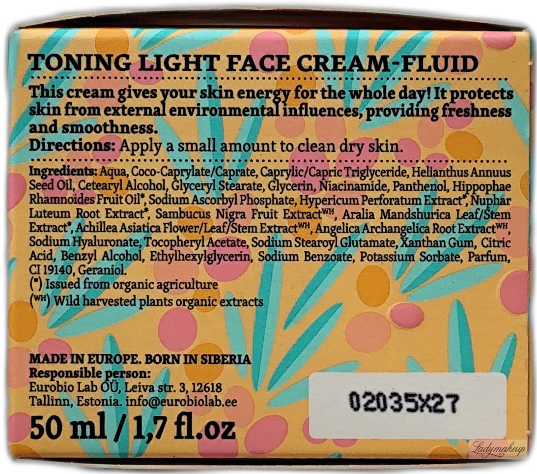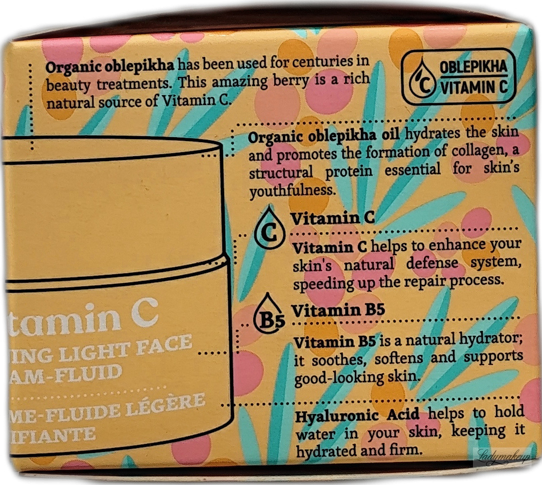 Krem na twarz. Jest w 100% wegański. Przeznaczony do pielęgnacji skóry każdego rodzaju. Zawiera w sobie m.in. witaminę C i B5, kwas hialuronowy oraz olejek z rokitnika ałtajskiego. Krem Natura Siberica dogłębnie nawilża skórę, zapobiega utracie wody, a także aktywnie chroni przed przesuszeniami. Dodatkowo rozjaśnia przebarwienia, wyrównuje koloryt skóry, a także dogłębnie ujędrnia, napina i uelastycznia. Ponadto Natura Siberica krem odczuwalnie odżywia i wygładza naskórek. Kosmetyk dostępny jest w opakowaniu o pojemności 50 ml.