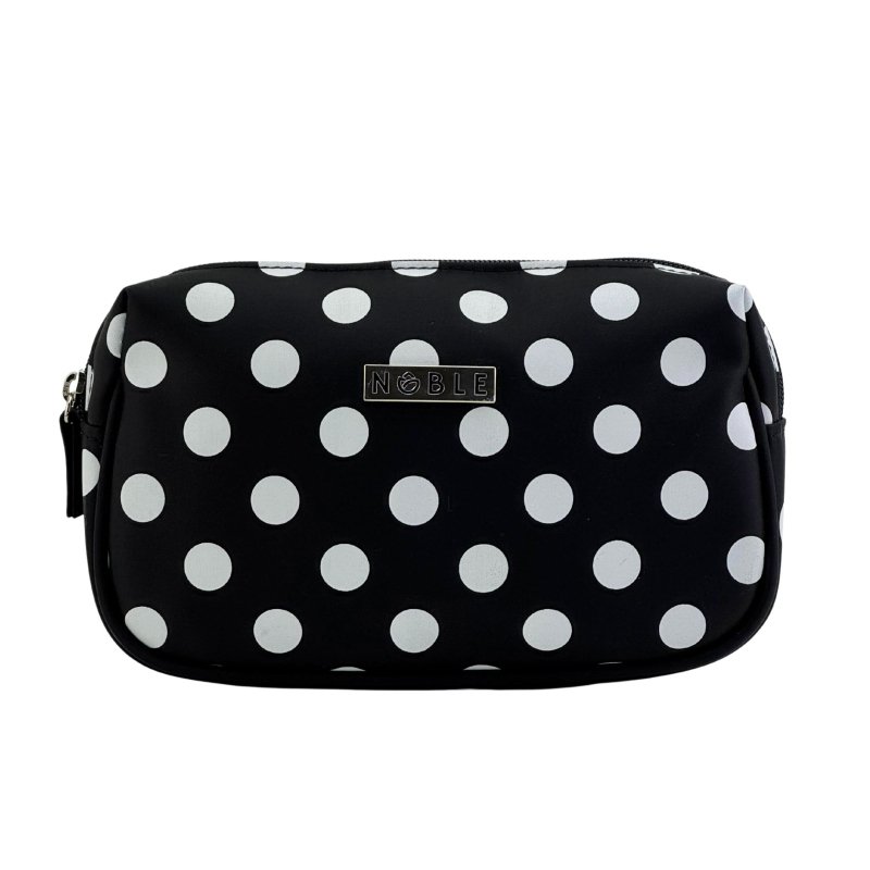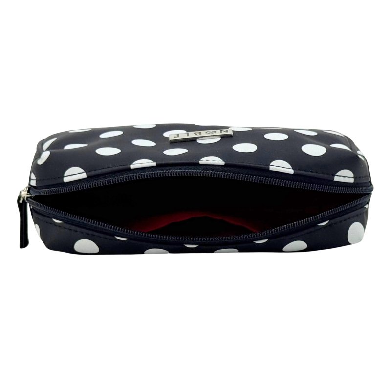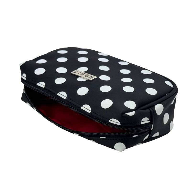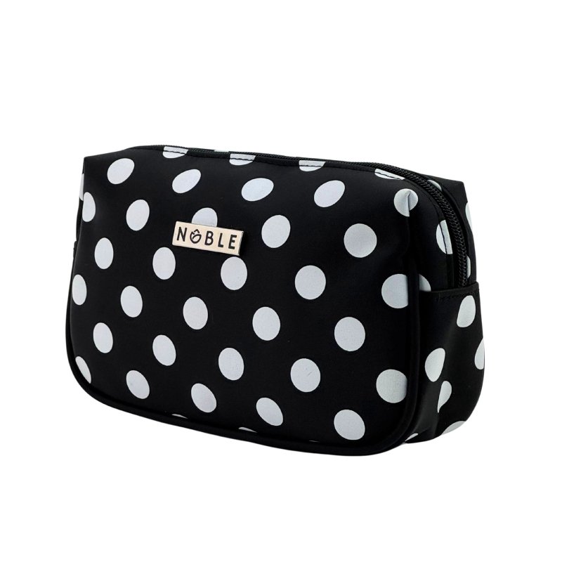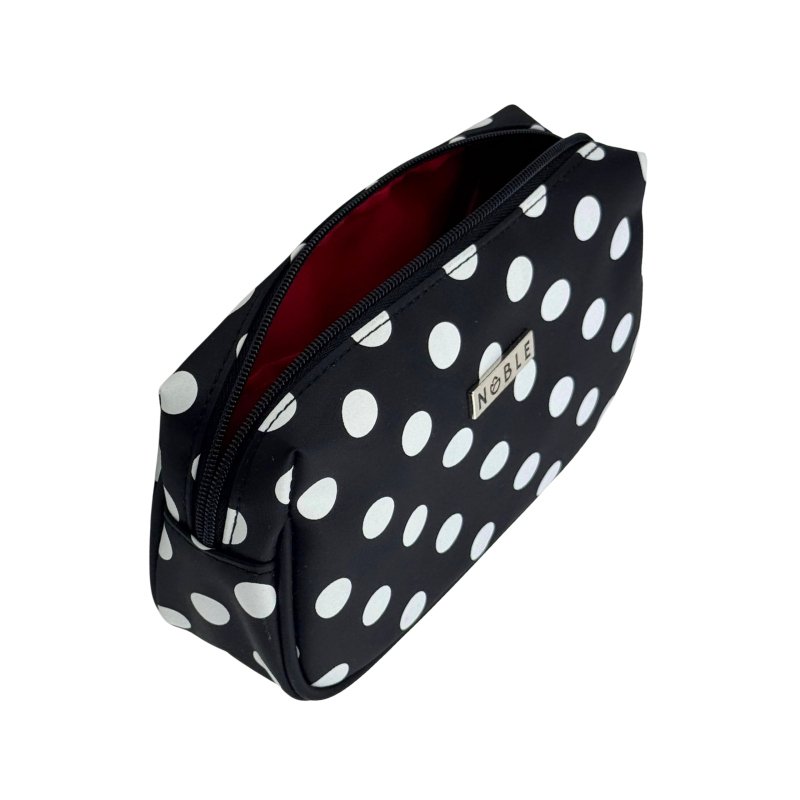 Wykonana została w 100% z wysokiej jakości materiału włókienniczego w klasyczny wzór białych groszków na czarnym tle. Tkanina ta jest wyjątkowo łatwa w utrzymaniu czystości i odporna na zabrudzenia. Kosmetyczka Noble kształtem przypomina mały piórnik. Z łatwością pomieści najpotrzebniejsze kosmetyki: pomadki, kredki do oczu, tusze, podkład, a nawet niewielki grzebień. Wnętrze kosmetyczki wyściełano czerwonym materiałem, co dodaje jej charakteru. Na jednej ze ścianek znajduje się praktyczna kieszonka, idealna na drobne przedmioty, takie jak gumki do włosów, spinki czy miniaturowe akcesoria. Dzięki swojej funkcjonalności kosmetyczka świetnie sprawdzi się jako organizer w każdej torebce.