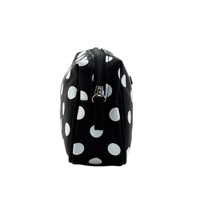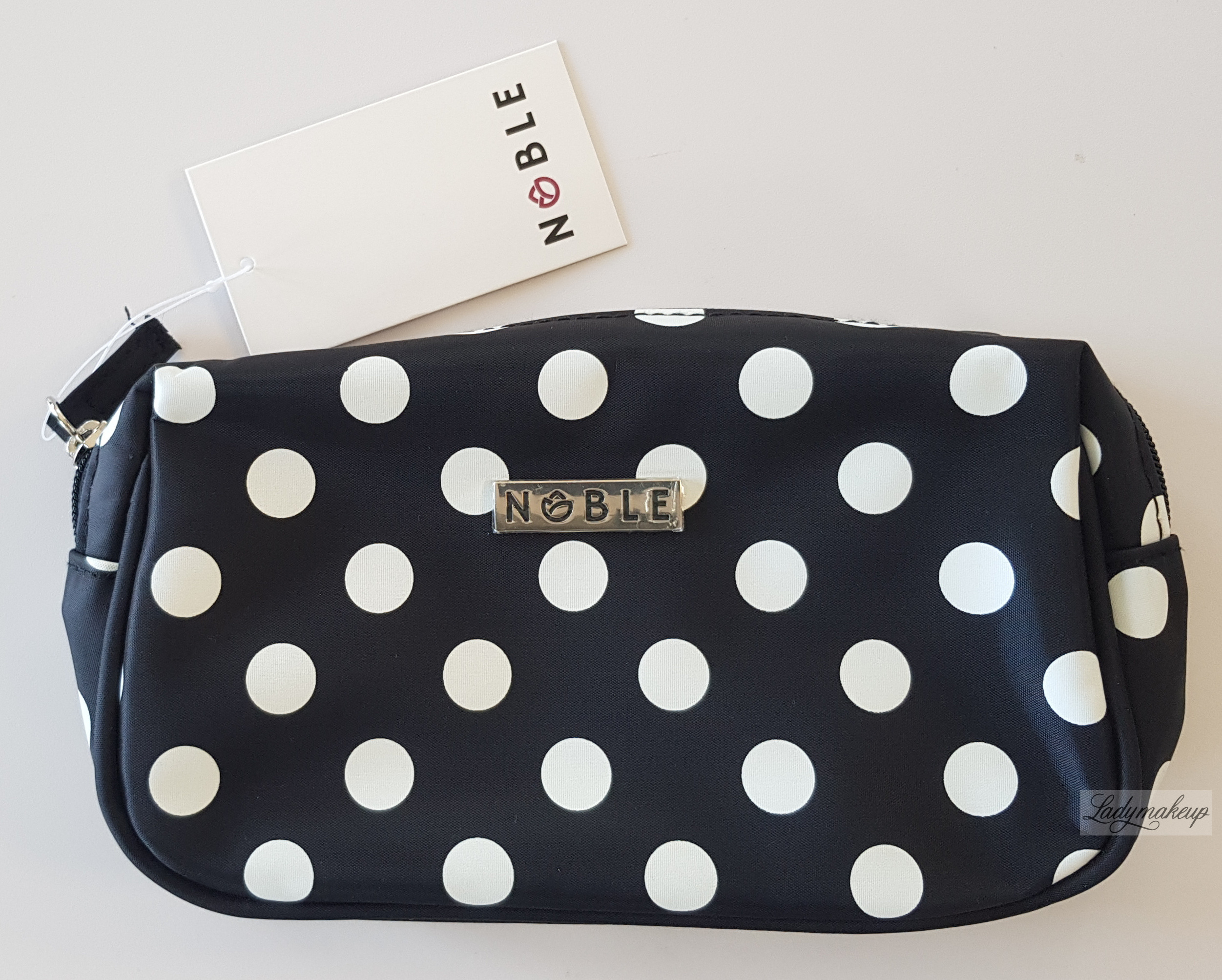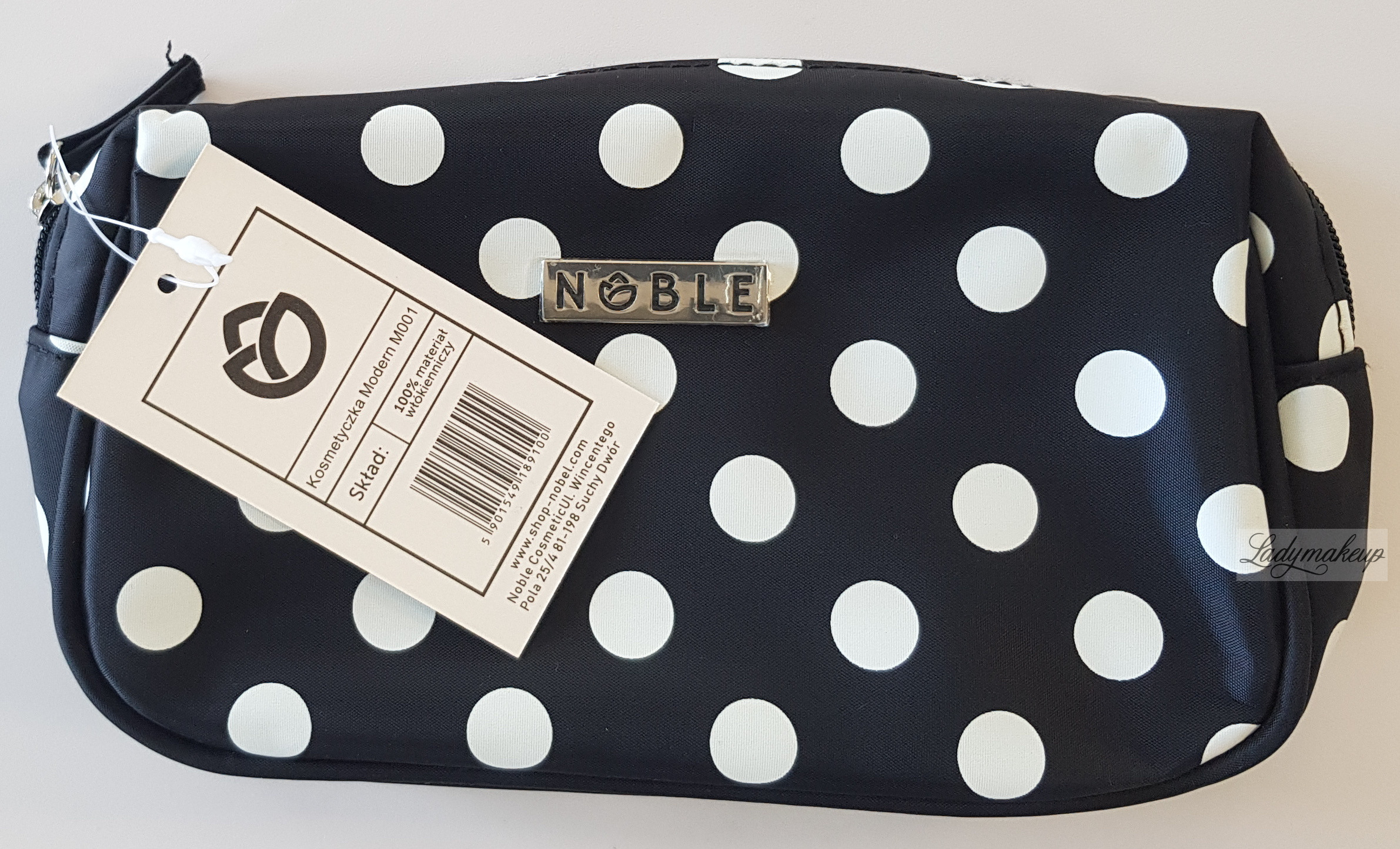 Wykonana została w 100% z wysokiej jakości materiału włókienniczego w klasyczny wzór białych groszków na czarnym tle. Tkanina ta jest wyjątkowo łatwa w utrzymaniu czystości i odporna na zabrudzenia. Kosmetyczka Noble kształtem przypomina mały piórnik. Z łatwością pomieści najpotrzebniejsze kosmetyki: pomadki, kredki do oczu, tusze, podkład, a nawet niewielki grzebień. Wnętrze kosmetyczki wyściełano czerwonym materiałem, co dodaje jej charakteru. Na jednej ze ścianek znajduje się praktyczna kieszonka, idealna na drobne przedmioty, takie jak gumki do włosów, spinki czy miniaturowe akcesoria. Dzięki swojej funkcjonalności kosmetyczka świetnie sprawdzi się jako organizer w każdej torebce.