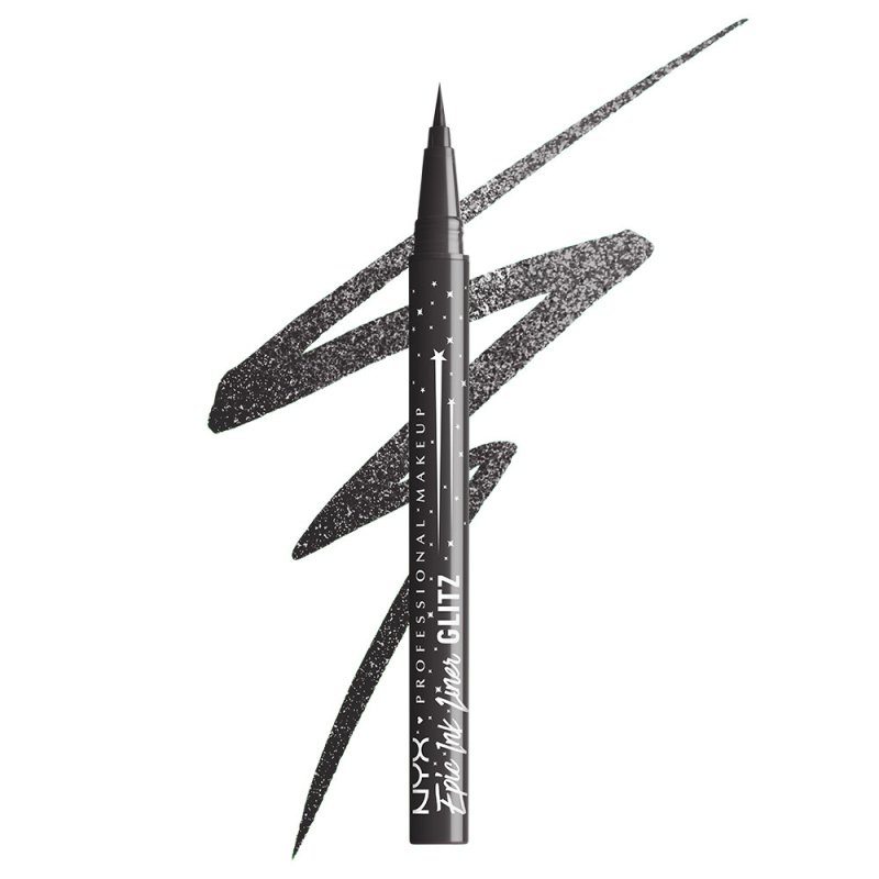 Eyeliner w pisaku. Pozwala na stworzenie niezwykle wyrazistej i kuszącej kreski na powiekach oraz wszędzie tam gdzie tylko sobie wyobrazimy. Liner Nyx posiada niezwykle dobrze napigmentowaną, długotrwałą formułę, która po zaschnięciu jest odporna na działanie wody. Ponadto Nyx eyeliner jest odporny na ścieranie i rozmazywanie przez co będzie niezawodny w każdej sytuacji i miejscu. Pochodzi z serii Glitz dzięki czemu każdy odcień posiada zatopione w sobie kuszące, brokatowe drobiny. Kosmetyk wyposażony został w ultra cienki, precyzyjny pędzelek, umożliwiający sprawną i łatwą aplikację. Dostępny jest w kilku odcieniach i o pojemności 1 ml.