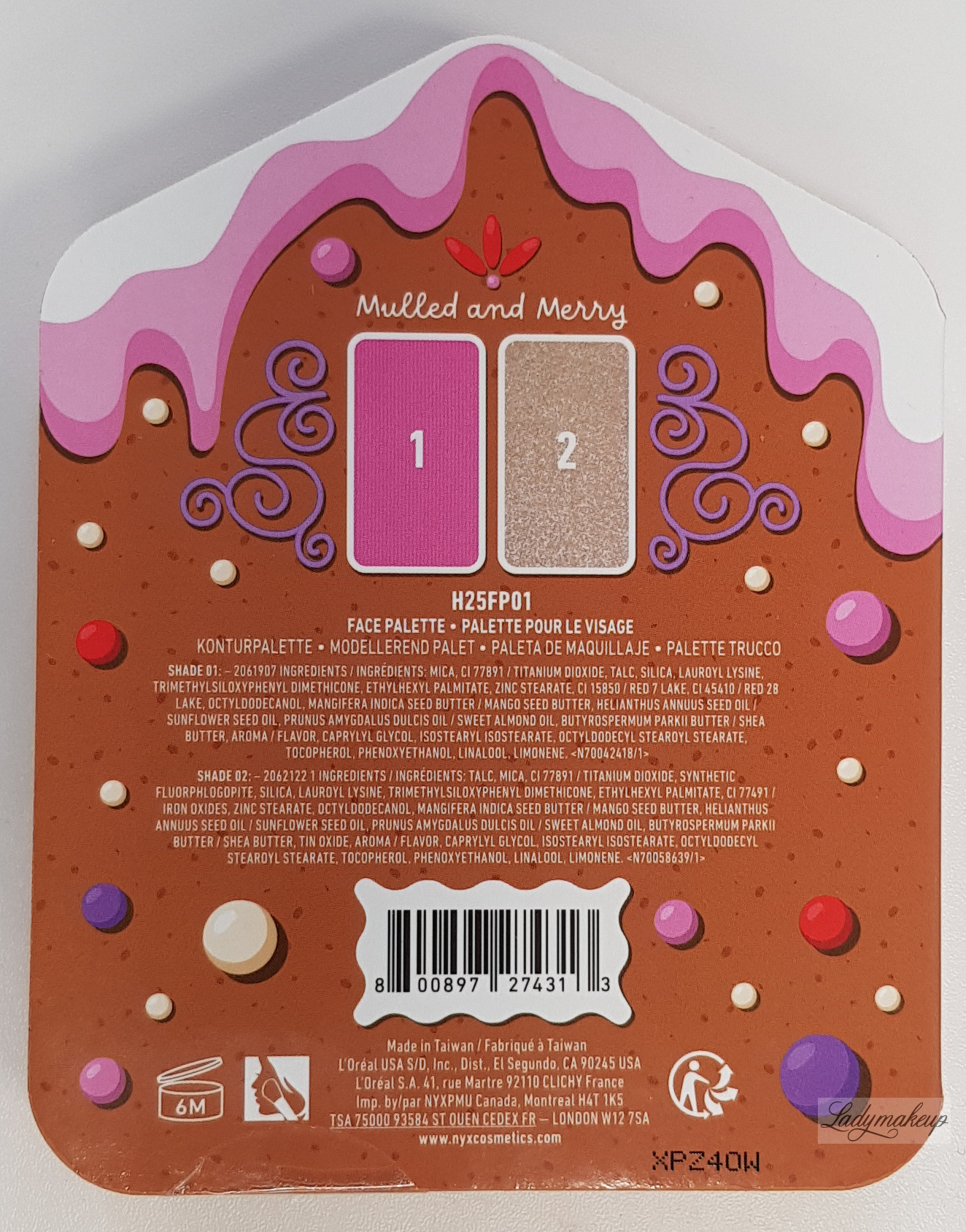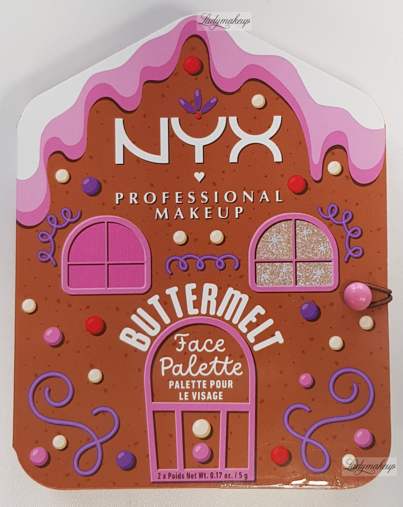 Paleta do twarzy. Pochodzi ze specjalnej świątecznej kolekcji powstałej specjalnie na sezon 2025. Idealnie sprawdzi się podczas wykonywania makijaży na co dzień oraz na większe wydarzenia, takie jak np. święta. Paleta Nyx Professional Makeup zawiera w sobie róż oraz błyszczący rozświetlacz, który powstał specjalnie dla jasnej i średniej karnacji. Doda skórze zdrowego i młodzieńczego rumieńca, a także pięknie rozświetli naskórek. W swoim składzie zawiera takie pielęgnacyjne składniki jak: masło shea, masło mango oraz masło migdałowe, które dbają o dobrostan naskórka. Całość została umieszczona w niezwykle kuszącym i klimatycznym opakowaniu przypominającym domek z piernika. Nyx paleta dostępny jest o pojemności 2 x 5 g.