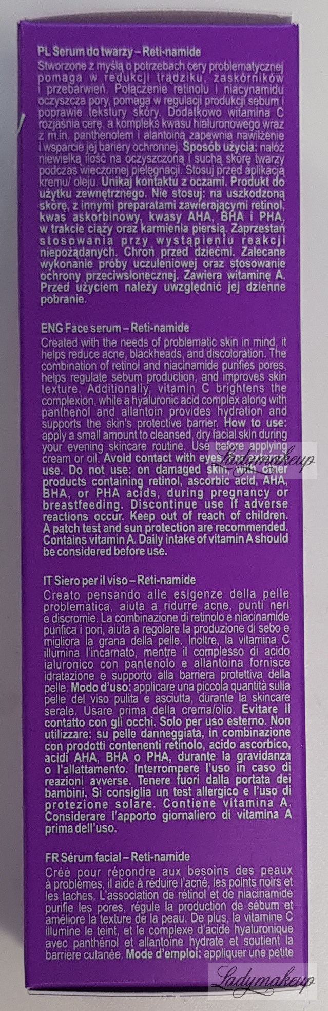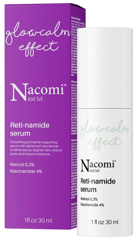 Serum do twarzy. Przeznaczone do wieczornej pielęgnacji skóry dojrzałej z pierwszymi oznakami starzenia, mieszanej oraz pozbawionej energii. Serum Nacomi to produkt będący nowoczesnym połączeniem niacynamidu 4% oraz retinolu 0,3% z dodatkiem witaminy C, kwasu hialuronowego, masła mango, alantoiny, bisabololu i panthenolu. Kosmetyk widocznie wygładza i zwęża pory, reguluje nadprodukcję sebum, zmniejsza przebarwienia, wyrównuje koloryt oraz zwalcza niedoskonałości. Dodatkowo Nacomi serum silnie nawilża, dogłębnie odżywia, wygładza i zmiękcza, a także wzmacnia barierę ochronną naskórka. Produkt dostępny jest w opakowaniu o pojemności 30 ml.