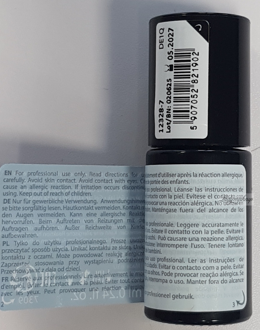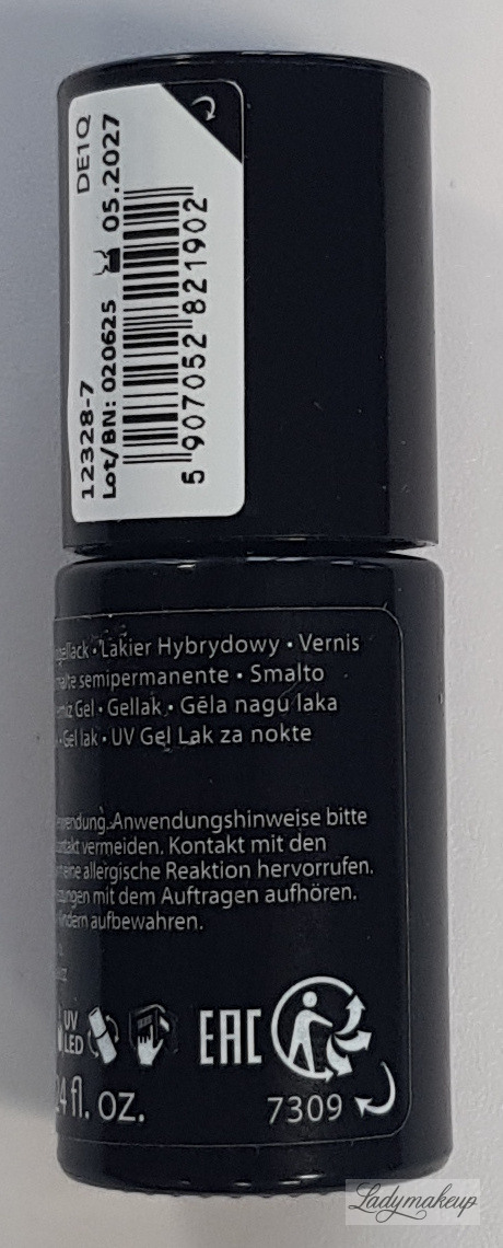 3. Nałożyć warstwę lakieru hybrydowego w wybranym kolorze i utwardzić w lampie LED lub lampie UV według tabeli (im ciemniejszy kolor tym dłuższy czas utwardzania). Dla uzyskania głębi koloru czynność należy powtórzyć.