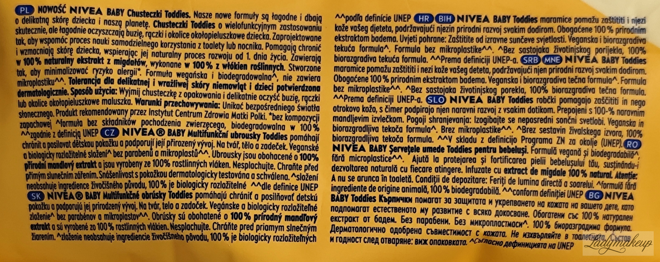 Chusteczki. Przeznaczone są do pielęgnacji delikatnej skóry dzieci oraz niemowląt. W trosce o dobro skóry wykonane zostały w 100% z biodegradowalnych włókien roślinnych nasączonych naturalnym ekstraktem z migdałów o właściwościach pielęgnacyjnych. Chusteczki Nivea skutecznie, ale przy tym łagodnie oczyszczają buzię, dłonie, ciało oraz okolice okołopieluszkowe. Dodatkowo Nivea chusteczki zostały tak zaprojektowane, by wspomóc naukę samodzielnego korzystania z toalety lub nocnika. Są one wegańskie, bez kompozycji zapachowej, bez składników pochodzenia naturalnego oraz są w 100%. W opakowaniu znajduje się, aż 57 sztuk chusteczek.