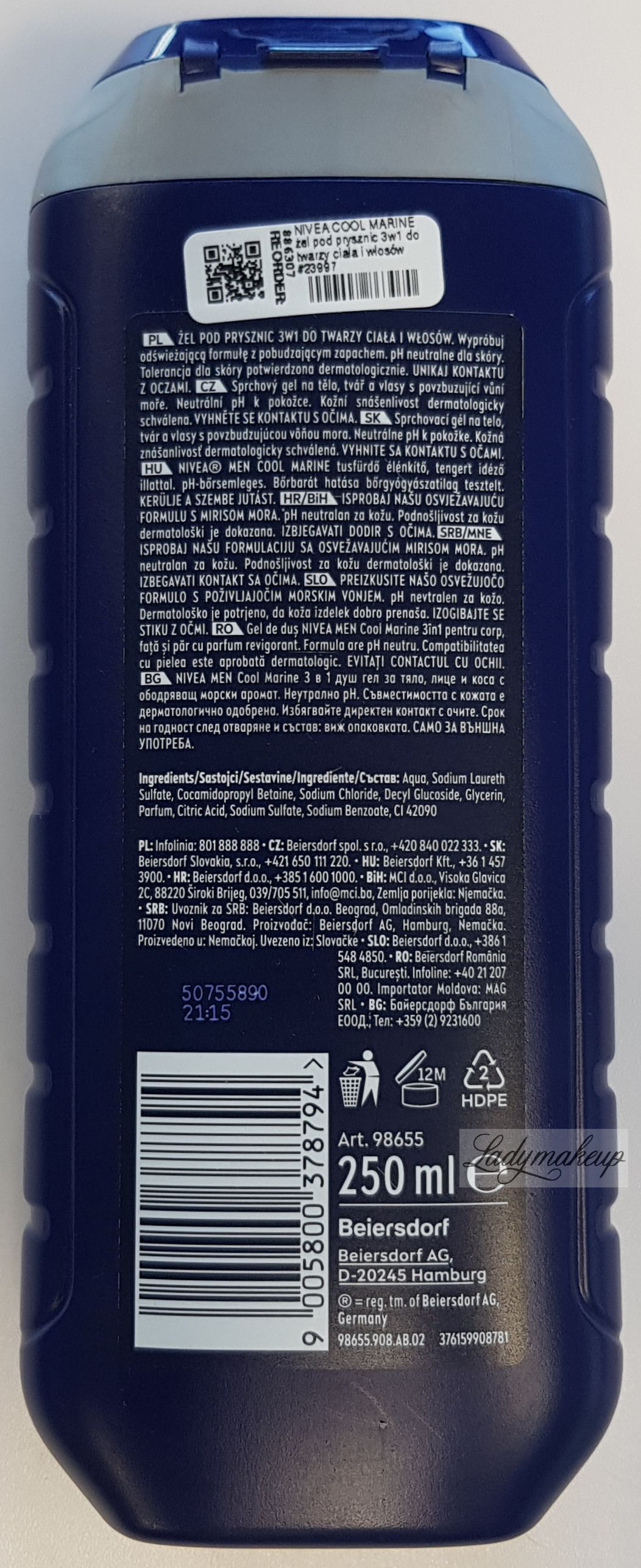 Żel pod prysznic. Został stworzony specjalnie z myślą o pielęgnacji męskiej skóry. Posiada wielofunkcyjny charakter i może być jednocześnie używany jako żel pod prysznic do mycia ciała, żel do oczyszczania twarzy a także szampon do włosów. Wzbogacony został o minerały morskie. Żel Nivea o pH neutralnym dla skóry posiada odświeżającą formułę i przyjemny, pobudzający zmysły zapach. Kosmetyk umieszczono w butelce o pojemności 250 ml.