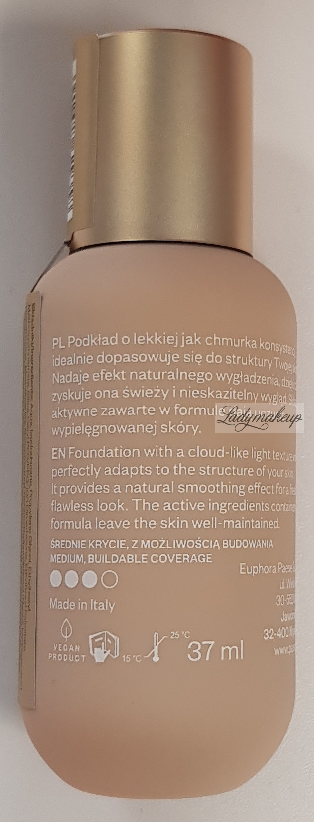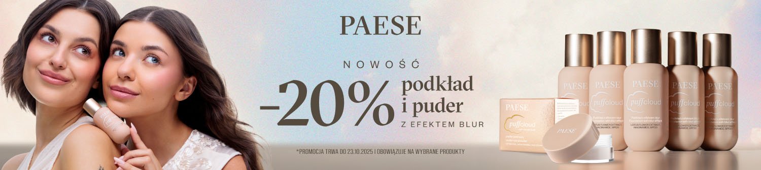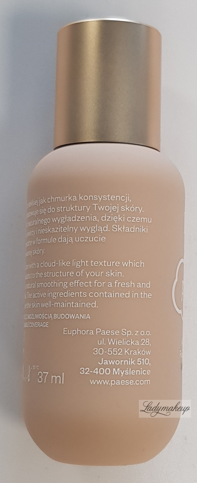 Podkład do twarzy. Jest w 100% wegański. Posiada płynno-kremową formułę, która otula skórę niczym miękka chmurka, dzięki czemu jest tez bardzo komfortowy podczas noszenia. Podkład Paese dobrze się aplikuje oraz stapia z naskórkiem tworząc bardzo naturalne, satynowe wykończenie, bez efektu maski. Dodatkowo optycznie wygładza cerę oraz sprawia, że skóra zyskuje świeży oraz promienny wygląd przez cały dzień. Jednocześnie Paese podkład pozwala osiągnąć efekt średniego krycia z możliwością stopniowania, dzięki czemu zakryje nawet mocne niedoskonałości skórne. W swojej formule zawiera takie składniki aktywne jak: niacynamid oraz ekstrakt z kwiatu lotosu, które mają działanie przeciwstarzeniowe, antyoksydacyjne oraz zmniejszają wydzielanie sebum i ujednolicają koloryt. Dodatek filtra SPF20 zapewnia ochronę przed promieniami UVA i UVB. Kosmetyk idealnie sprawdzi się w przypadku skóry normalnej i mieszanej. Dostępny jest w opakowaniu o pojemności 37 ml.
