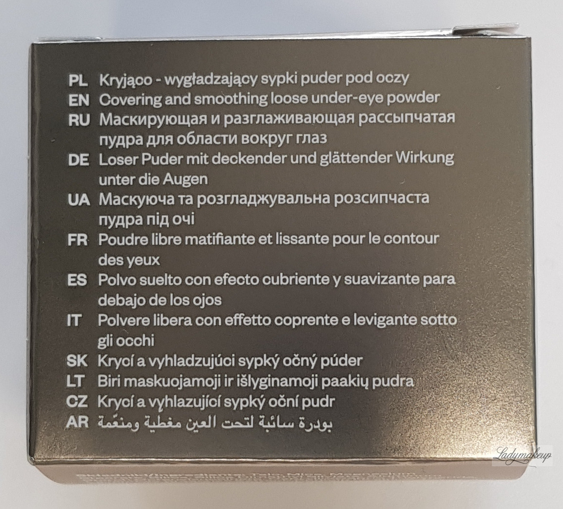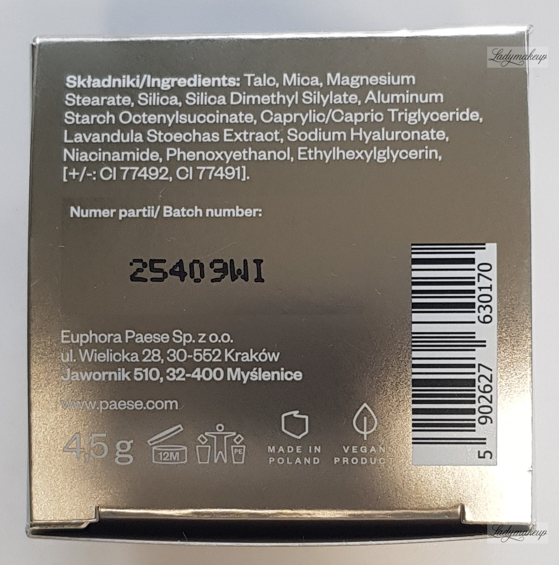 Puder pod oczy. Jest w 100% wegański i w 92% zawiera składniki pochodzenia naturalnego. Posiada ultralekką, drobno zmieloną, aksamitnie jedwabistą formułę, która nie podkreśla zmarszczek ani rozszerzonych porów. Puder Paese posiada odcień light beige - jasnego beżu, który wyrównuje koloryt skóry, a także dobrze ukrywa cienie i worki pod oczami, a przy tym dopasowuje się do każdej karnacji. Pięknie rozświetla oraz pozostawia na skórze efekt świeżego i kuszącego blasku. Dodatkowo daje efekt kuszącego blur, który optycznie wygładza drobne linie oraz zmarszczki. W swoim składzie zawiera takie składniki aktywne jak: kwas hialuronowy, stoechiol (ekstrakt z lawendy motylkowej) oraz niacynamid, które intensywnie nawilżają, ujędrniają i zmiękczają, a także regulują wydzielanie sebum oraz zmniejszają widoczność porów. Kosmetyk dostępny jest w opakowaniu o pojemności 4,5 g.