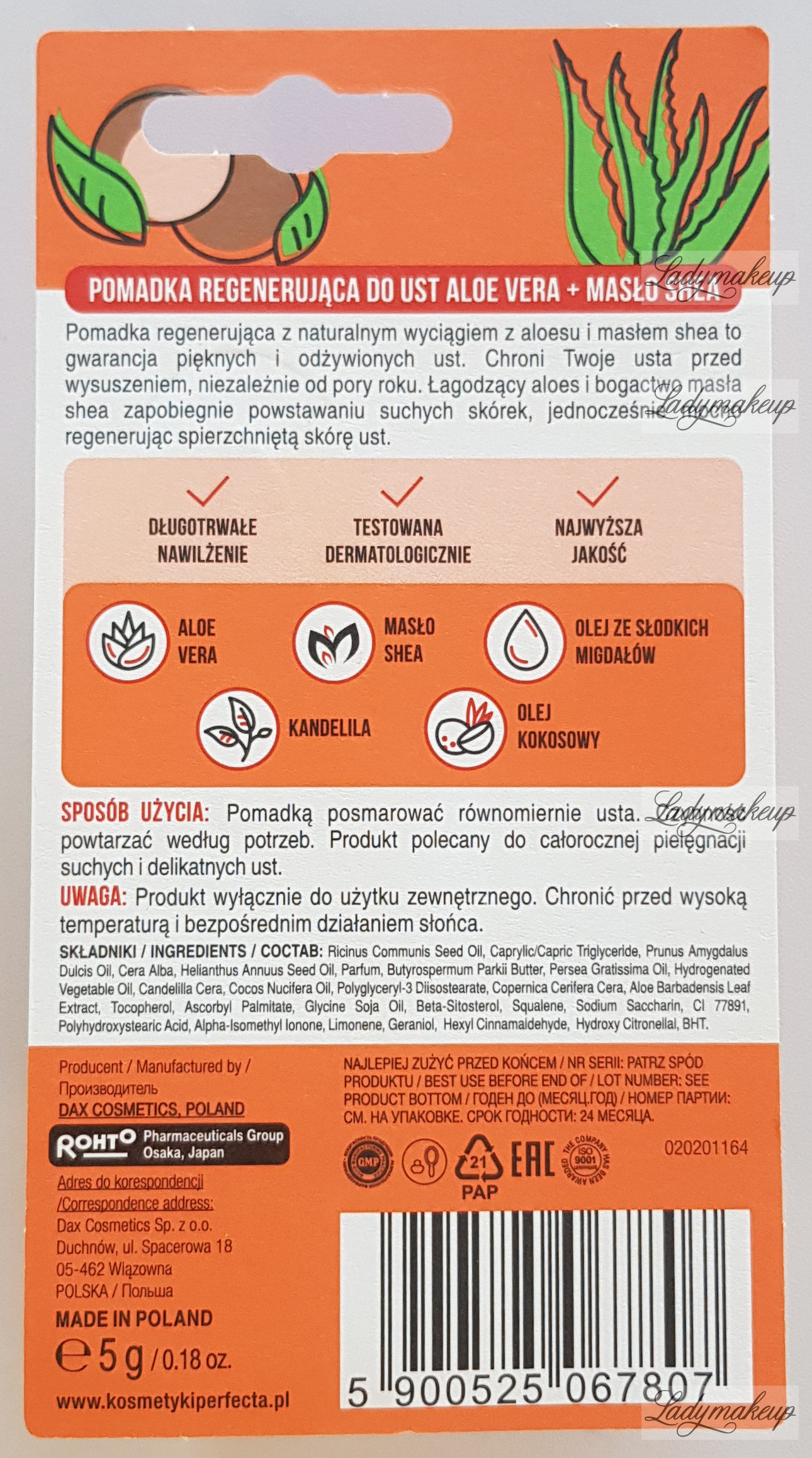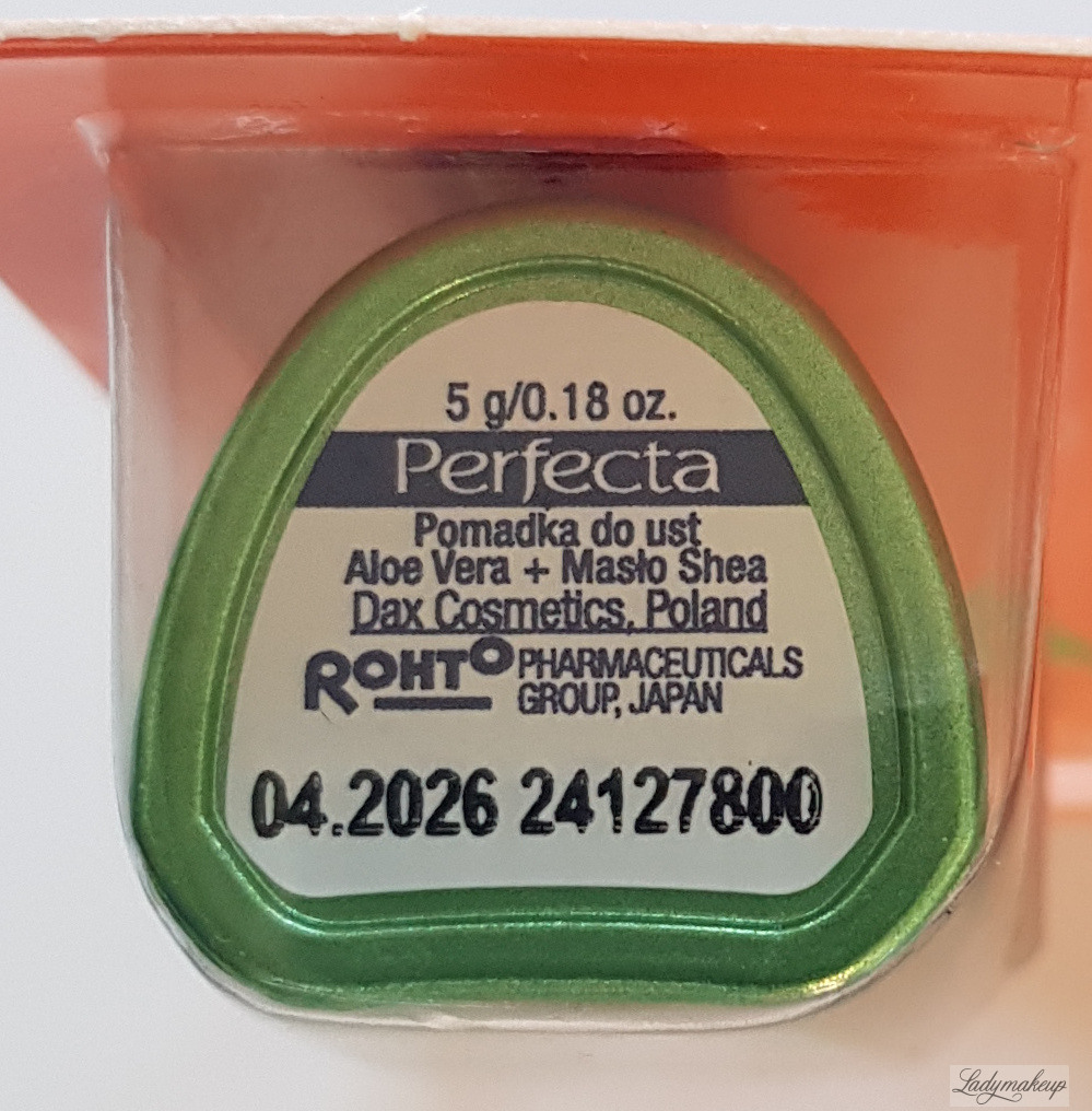 Przeznaczona do profesjonalnej pielęgnacji warg. W swoim składzie zawiera takie aktywne składniki jak: wyciąg z aloesu, masło shea, olej ze słodkich migdałów, wosk kandelilla oraz olejek kokosowy. Pomadka Perfecta intensywnie nawilża, dogłębnie odżywia oraz wygładza i zmiękcza usta. Skutecznie łagodzi i koi podrażnienia, a także pobudza skórę do szybszej regeneracji. Regularnie stosowana skutecznie chroni przed wysuszeniem, podrażnieniami oraz pękaniem, bez względu na porę roku. Dodatkowo Perfecta pomadka zapobiega powstawaniu suchych skórek. Uroczy kształt opakowania przypominający aloes sprawia, że pomadka prezentuje się bardzo ładnie. Kosmetyk dostępny jest o gramaturze 5 g.