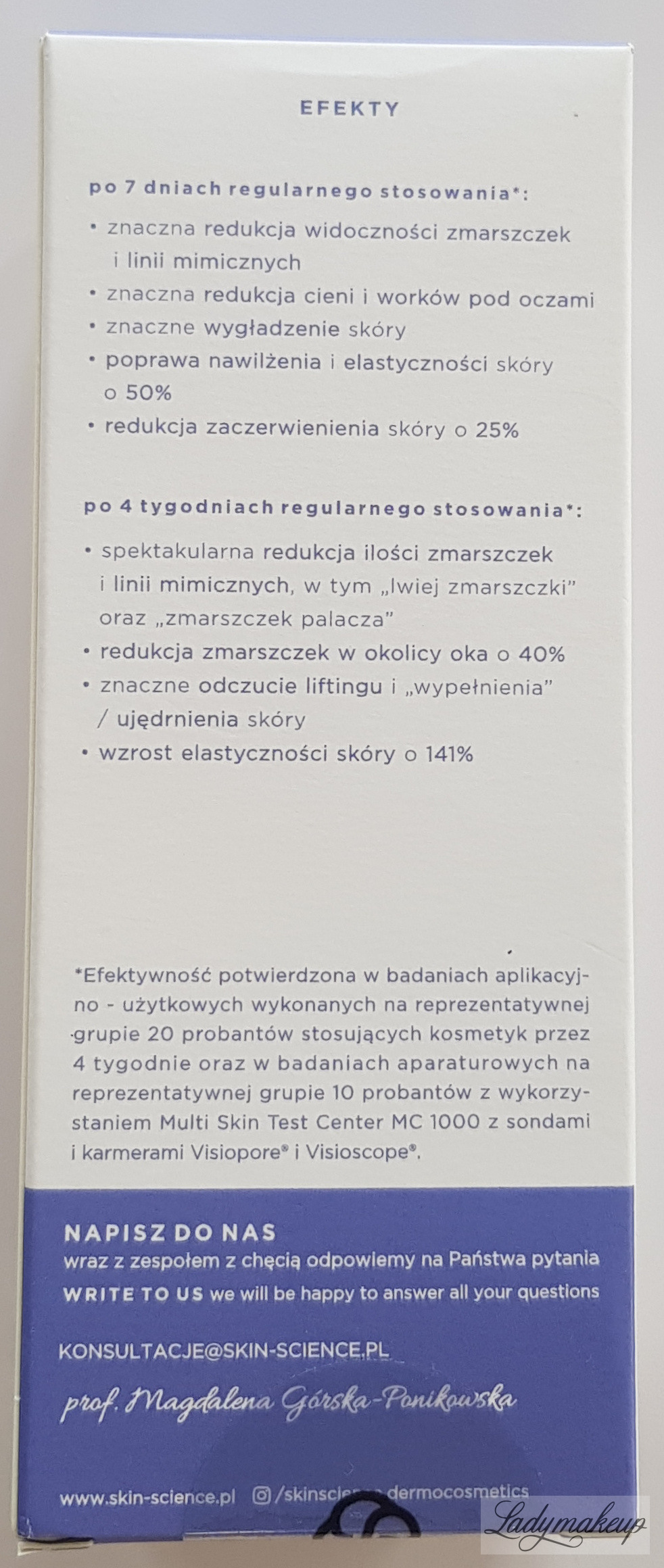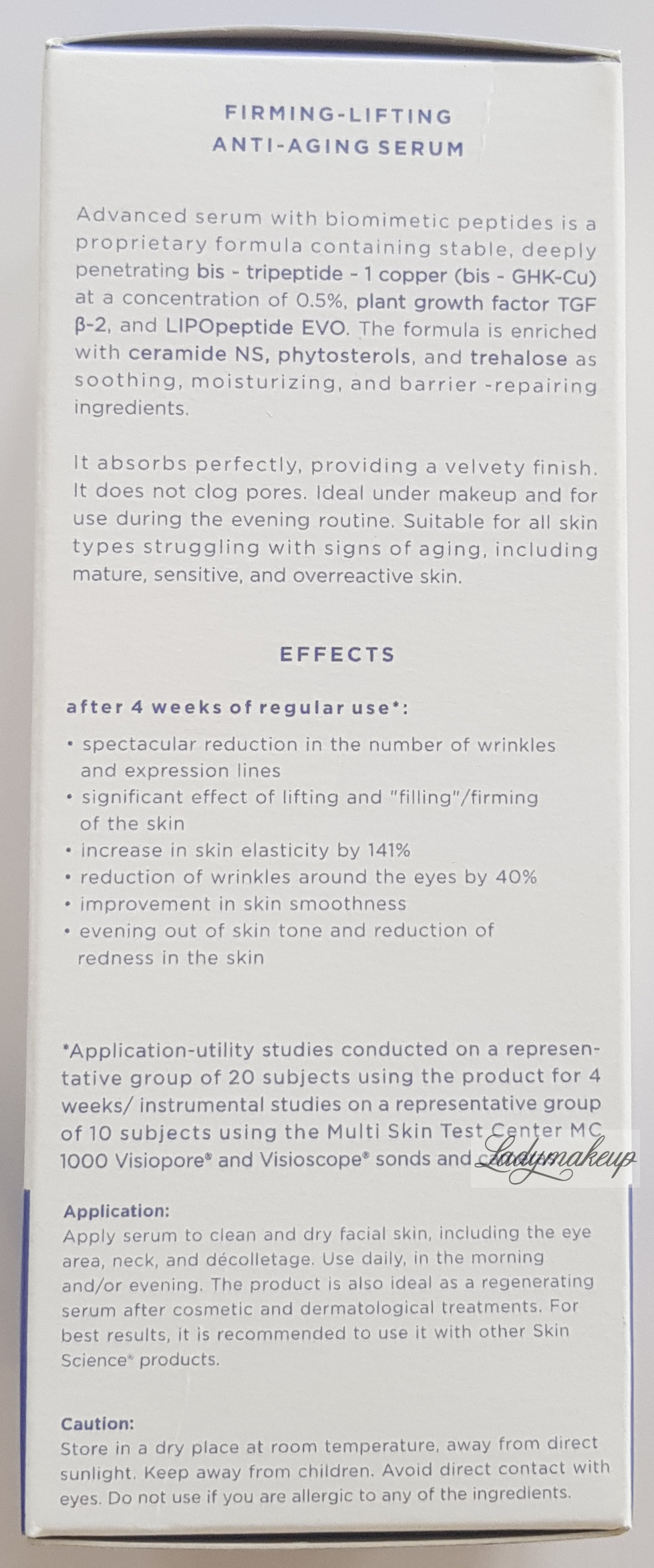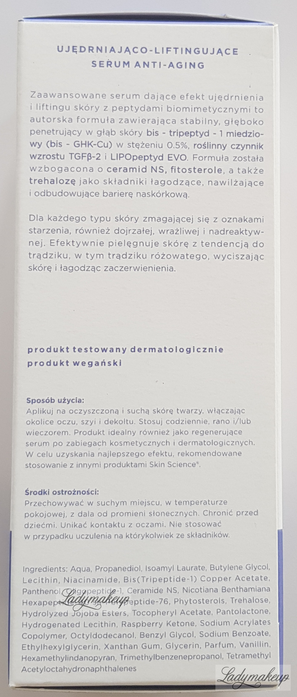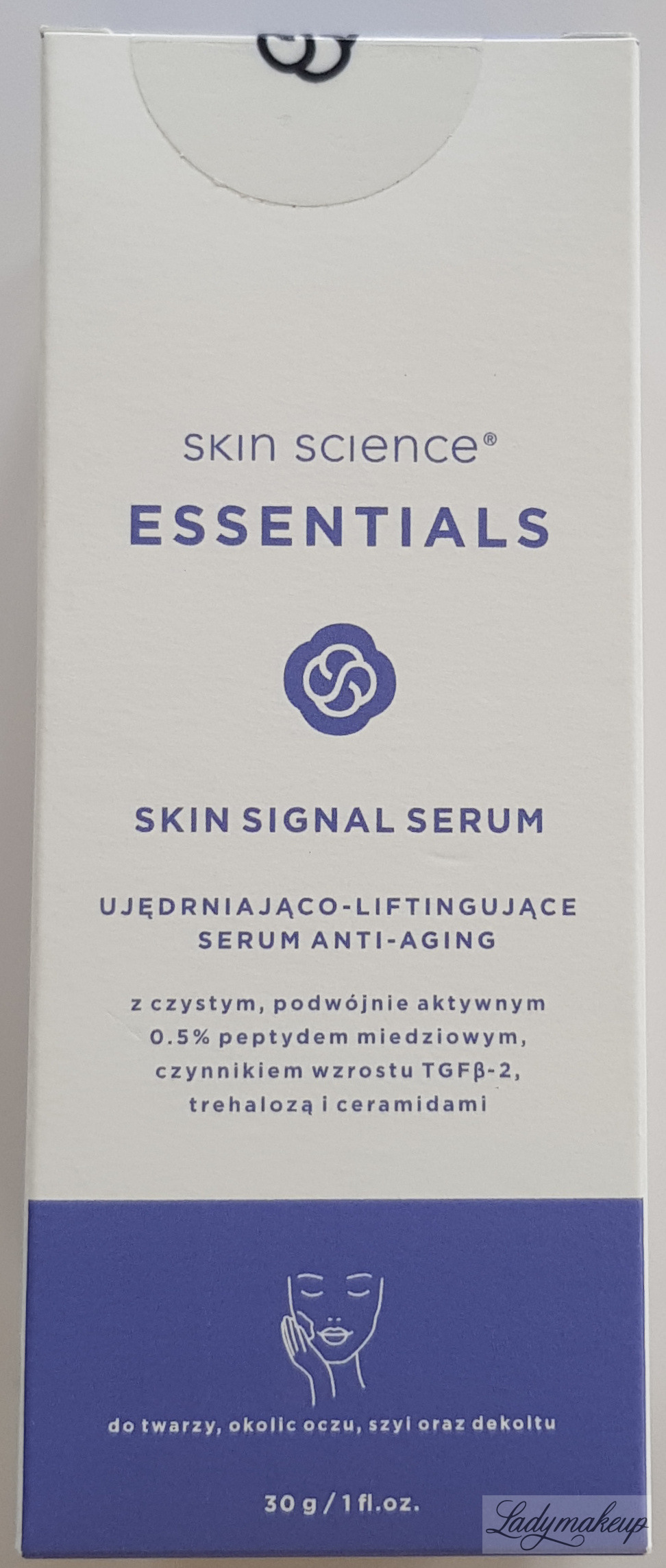Serum do twarzy. Do pielęgnacji skóry z oznakami starzenia, również dojrzałych, wrażliwych i nadreaktywnych. Polecane także do cer problematycznych z tendencją do trądziku. Doskonale ujędrnia, nawilża, wygładza i poprawia napięcie skóry już od pierwszych dni stosowania. Kosmetyk zawiera w składzie bis-tripeptyd-1 miedziowy (bis - GHK-Cu) w stężeniu 0.5%, roślinne czynniki wzrostu TGFβ-2 oraz naskórkowy czynnik EGF, dzięki którym uruchamia naturalne procesy naprawcze na poziomie komórkowym. Serum Skin Science dostępne jest w opakowaniu 30 g.