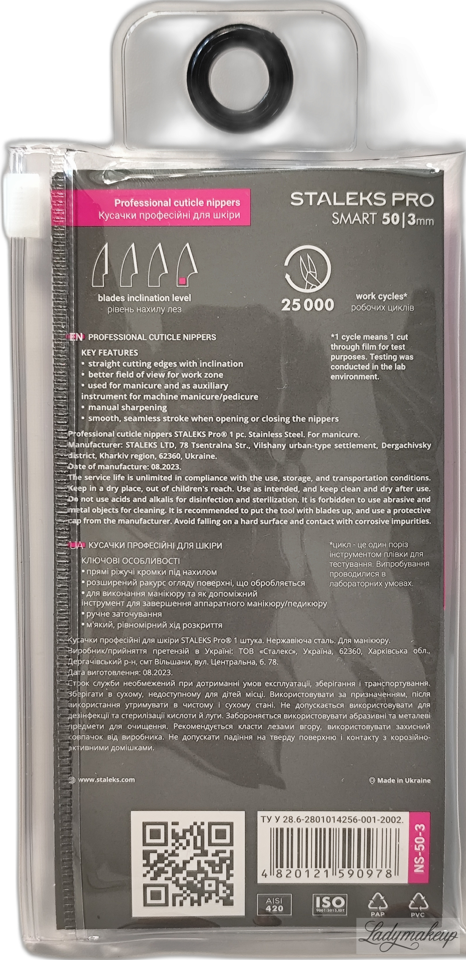Cążki Staleks. Przeznaczone do dłoni oraz stóp. Wykonane zostały z wysokiej jakości stali nierdzewnej, która używana jest do wytwarzania narzędzi chirurgicznych. Posiadają ostre ostrza o długości 3 mm, które szybko i sprawnie wycinają skórki, bez obaw o ciągnięcie. Unikalny, zwężony kształt końcówki zapewnia dobrą kontrolę podczas pracy, zaś specjalne wydłużone uchwyty doskonale sprawdzą się dla osób o średnich i szerokich dłoniach. Profesjonalne cążki do skórek z serii Pro posiadają specjalne ręcznie ostrzone krawędzie z obu stron, co dobrze zapobiega zadzieraniu się skórek. Dzięki mocnej oraz wytrzymałej konstrukcji starczą one na długie lata użytkowania. Podczas stosowania nie tępią się i nie rdzewieją, a także bez problemu można je sterylizować w autoklawie.