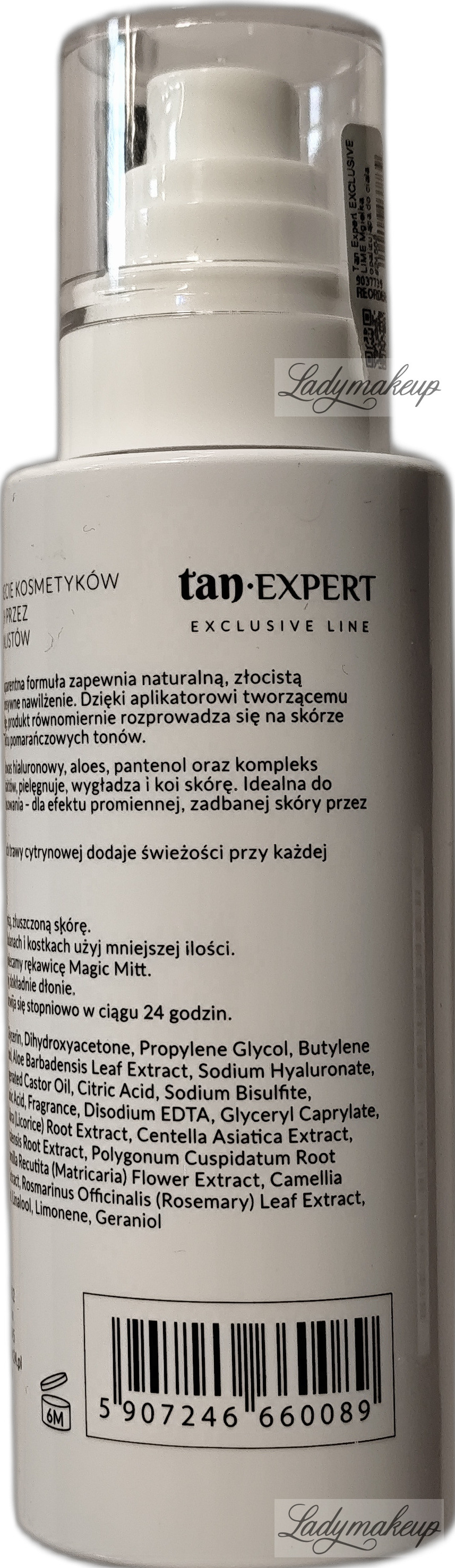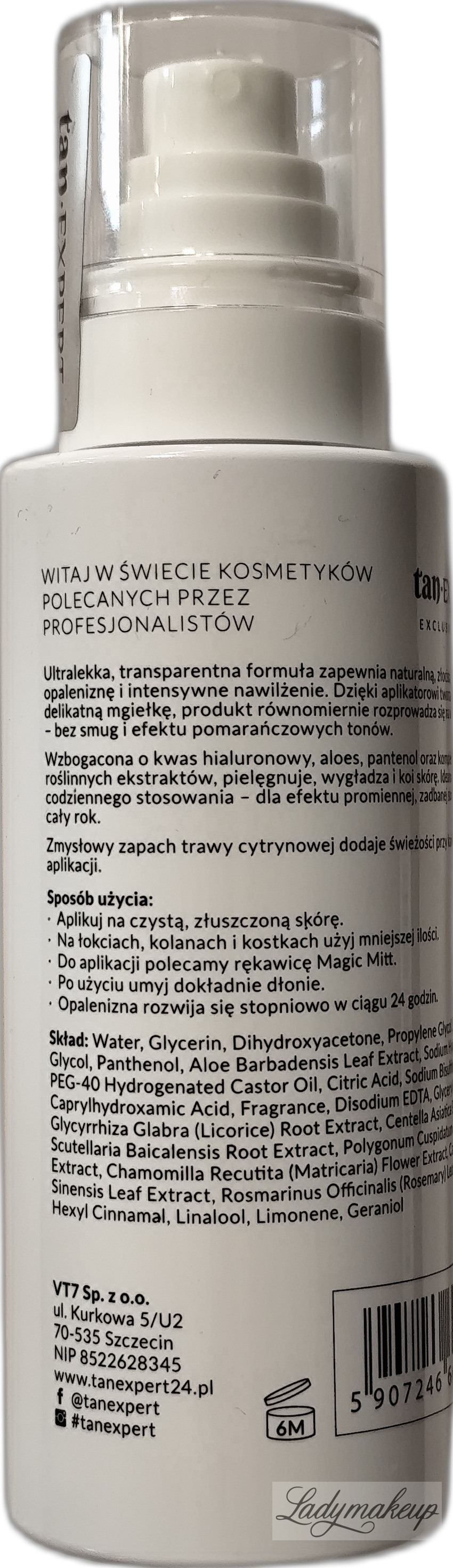 Mgiełka brązująca do ciała. Jest wegańska. Posiada lekką, transparentną formułę, która natychmiast się wchłania i stopniowo nadaje skórze złocisty odcień pełen zdrowego blasku. Mgiełka Tan Expert w swoim składzie zawiera takie pielęgnacyjne składniki jak: kwas hialuronowy, aloes, panthenol, gliceryna oraz kompleks ekstraktów roślinnych (m.in. lukrecja, wąkrota azjatycka, zielona herbata), które dobrze nawilżają i wygładzają skórę, a przy tym łagodzą podrażnienia. Tan Expert mgiełka nie zostawia smug oraz zacieków, a przy tym nie ma pomarańczowych tonów oraz charakterystycznego zapachu sztucznej opalenizny, co znacząco uprzyjemnia jej stosowanie. Kosmetyk posiada odświeżający zapach trawy cytrynowej. Dostępny jest w butelce o pojemności 200 ml.