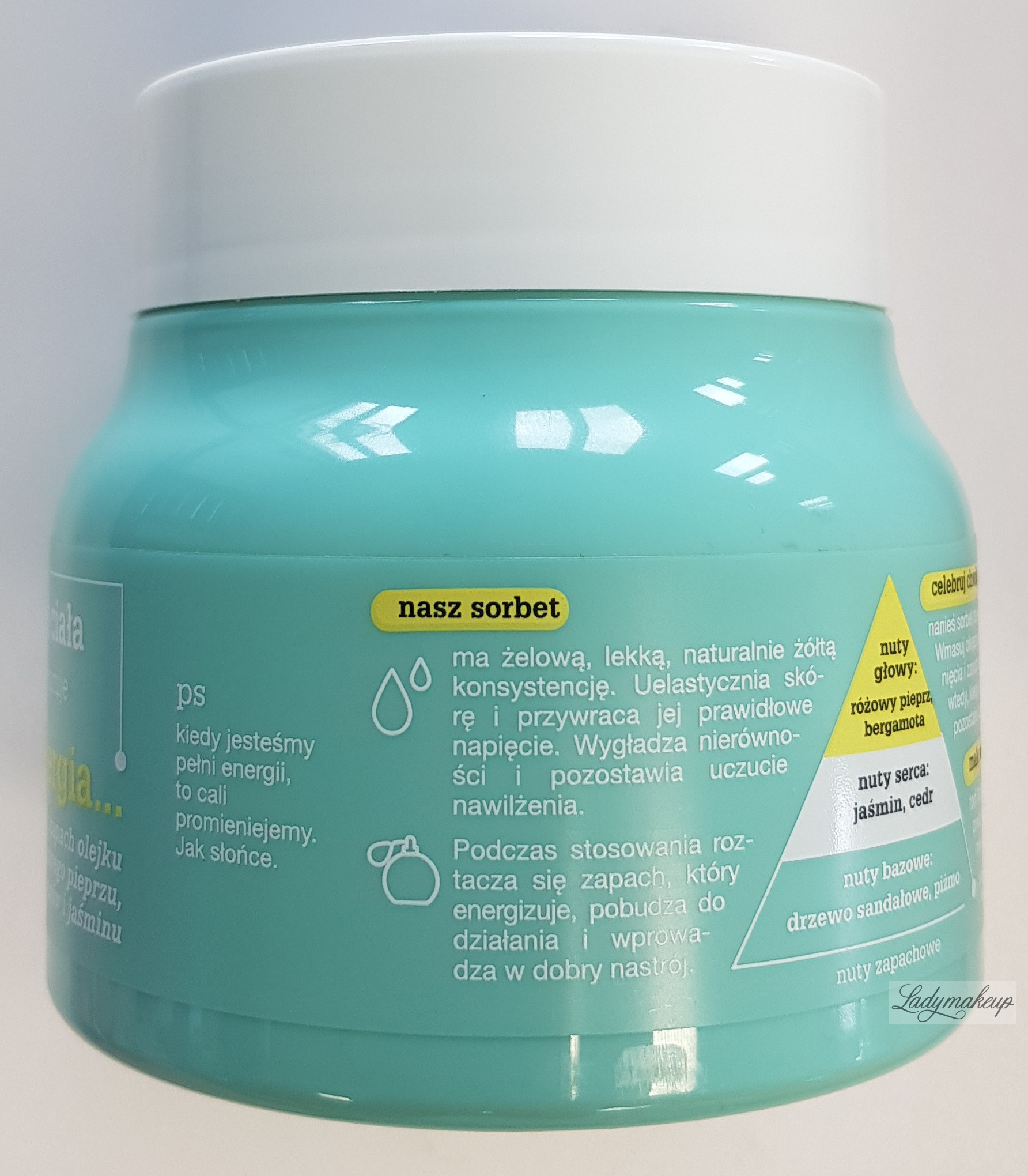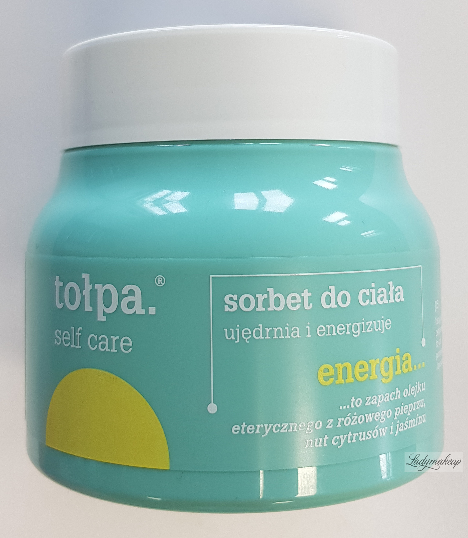 Pochodzi ze specjalnej serii Self Care. Posiada przyjemnie lekką, żelową konsystencję o naturalnie żółtej barwie, którą przyjemnie nakłada się, bezproblemowo rozciera i szybko się wchłania w naskórek. W swoim składzie zawiera specjalnie wyselekcjonowane aktywne składniki takie jak: torf tołpa, guarana, kwiat pomarańczy, prebiotyk oraz mleczko ryżowe. Sorbet Tołpa dobrze nawilża naskórek, wygładza nierówności, a także uelastycznia, napina oraz dodaje skórze energii. Wystarczy niewielką ilość nanieść na wybrane partie lub całe ciało i wmasować, by cieszyć się komfortem oraz profesjonalną pielęgnacją. Ponadto Tołpa sorbet dodaje skórze energii, pobudza do działania I wprowadza w dobry nastrój. W nutach głowy można znaleźć różowy pieprz i bergamotkę, w nutach serca umieszczono jaśmin i cedr, zaś nuty bazy to drzewo sandałowe i piżmo. Kosmetyk dostępny jest w opakowaniu o pojemności 250 ml.