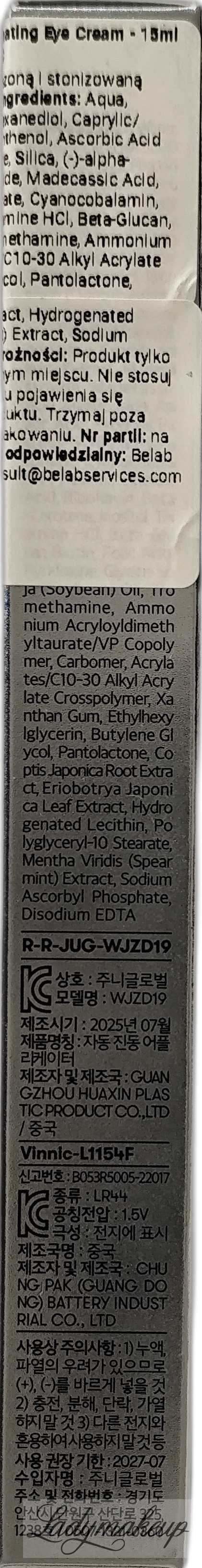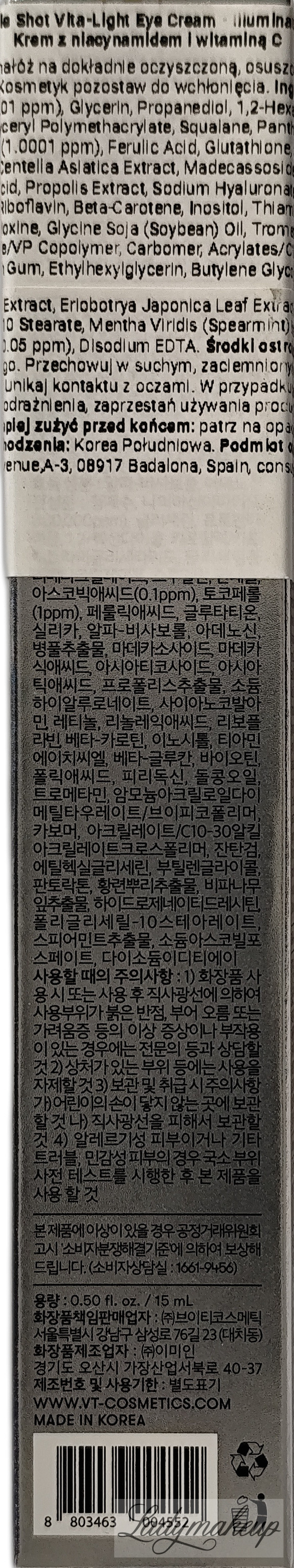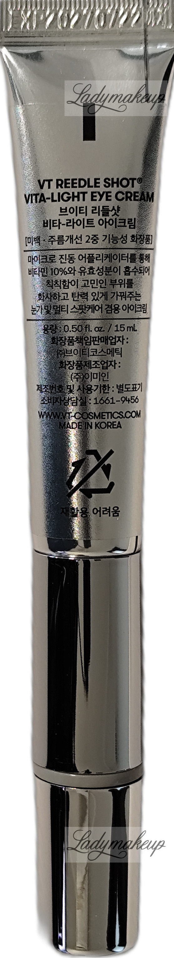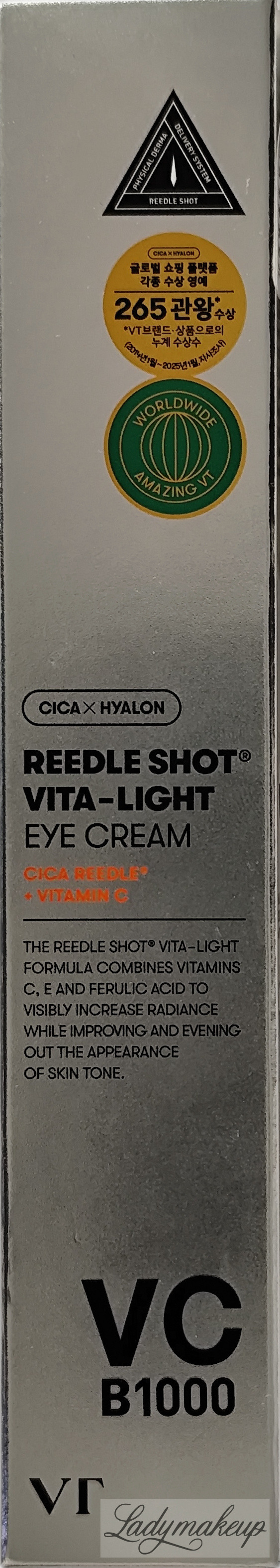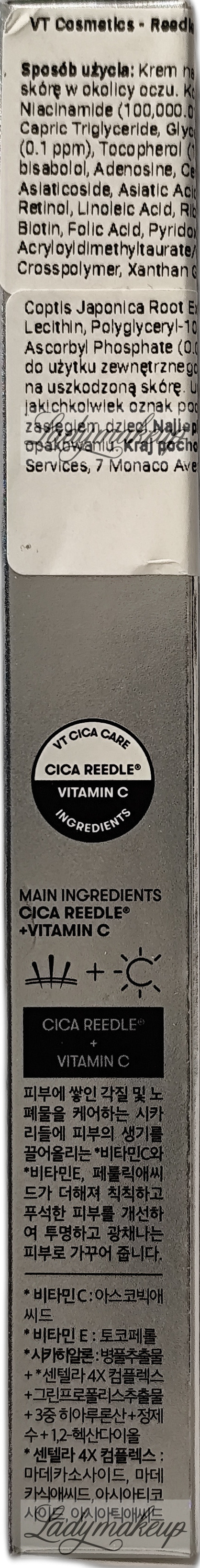 Krem pod oczy. Został stworzony specjalnie z myślą o codziennej pielęgnacji cery dojrzałej, z nierównym kolorytem i przebarwieniami. Swoje działanie opiera na bazie specjalnie wyselekcjonowanych składników aktywnych takich jak: niacynamid, witamina C i E, kwas ferulowy, retinol oraz komplek Cica Reedle. Krem VT Cosmetics widocznie wyrównuje koloryt oraz rozjaśnia przebarwienia. Jednocześnie niweluje działanie wolnych roników, działa przeciwstarzeniowo, zmniejsza widoczność zmarszczek i linii mimicznych, a także dobrze nawilża oraz ujędrnia i uelastycznia naskórek. Dodatek kompleksu Cica Reedle stymuluje skórę do odnowy oraz wspomaga lepszą wchłanialność składników aktywnych. Kosmetyk dostępny jest o pojemności 15 ml.