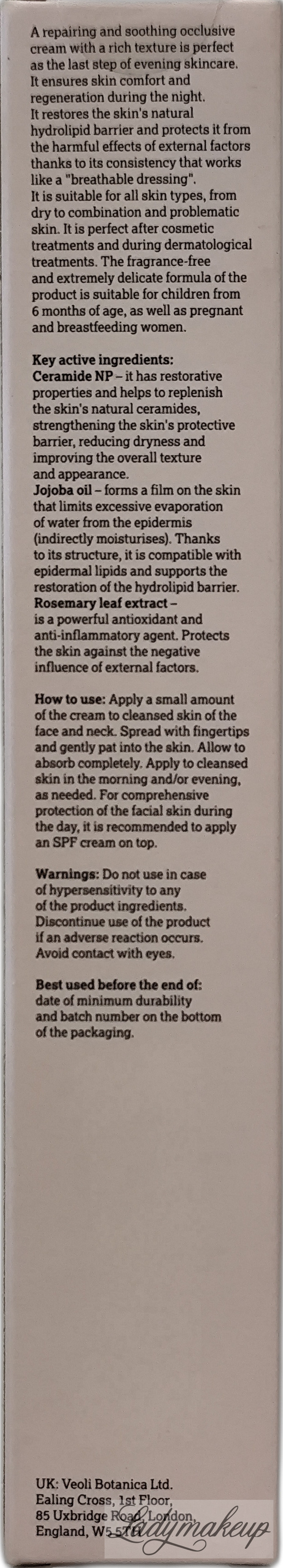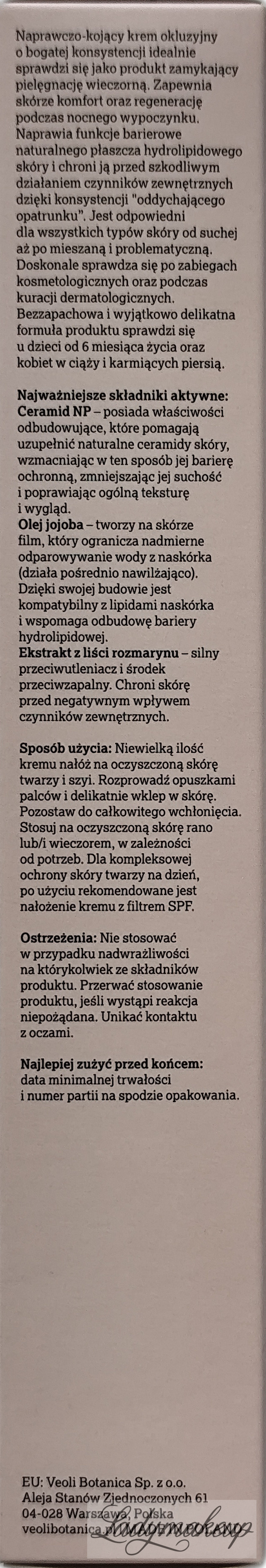 Krem do twarzy. Przeznaczony do codziennej pielęgnacji skóry każdego rodzaju, w tym również suchej, odwodnionej, wrażliwej, nadreaktywnej i podrażnionej. W swoim składzie zawiera takie składniki aktywne jak: ceramidy NP, olej jojoba oraz ekstrakt z liści rozmarynu. Krem Veoli Botanica zapewnia skórze uczucie komfortu, dobrze nawilża, odżywia, a także regeneruje naskórek. Tworzy na powierzchni skóry specjalną warstwę okluzyjną, która chroni cerę przed szkodliwym działaniem czynników zewnętrznych. Veoli Botanica krem pobudza skórę do szybszej odbudowy i naprawy, a także ma działanie przeciwzapalne i przeciwutleniające. Kosmetyk dostępny jest w poręcznej tubce o pojemności 75 ml.