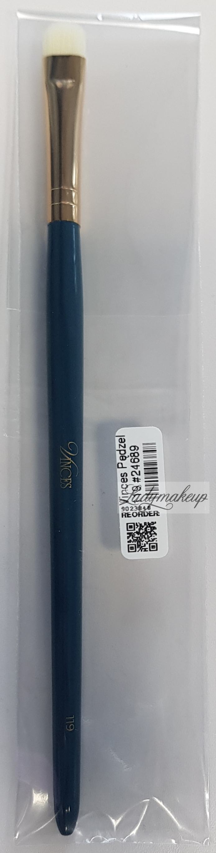 Jest w 100% wegański. Pochodzi z unikatowej serii Ocean, która charakteryzuje się niezwykle luksusową, a przy tym wygodną drewnianą rączką pomalowaną na ciemny szmaragdowo-zielony odcień ze złotym logo producenta oraz uroczą, złotą skuwką. Posiada niewielką, spłaszczoną języczkową główkę o zaokrąglonych krawędziach. Wykonany został z niezwykle miękkiego i elastycznego białego włosia syntetycznego, które nie podrażnia i nie drapie nawet mocno wrażliwej skóry. Idealnie sprawdzi się aplikacji cieni, korektora, a nawet szminki na usta. Pędzel posiada odpowiednio wyprofilowaną rączkę, dzięki czemu bardzo dobrze leży w dłoni i nie wyślizguje się z palców podczas pracy.