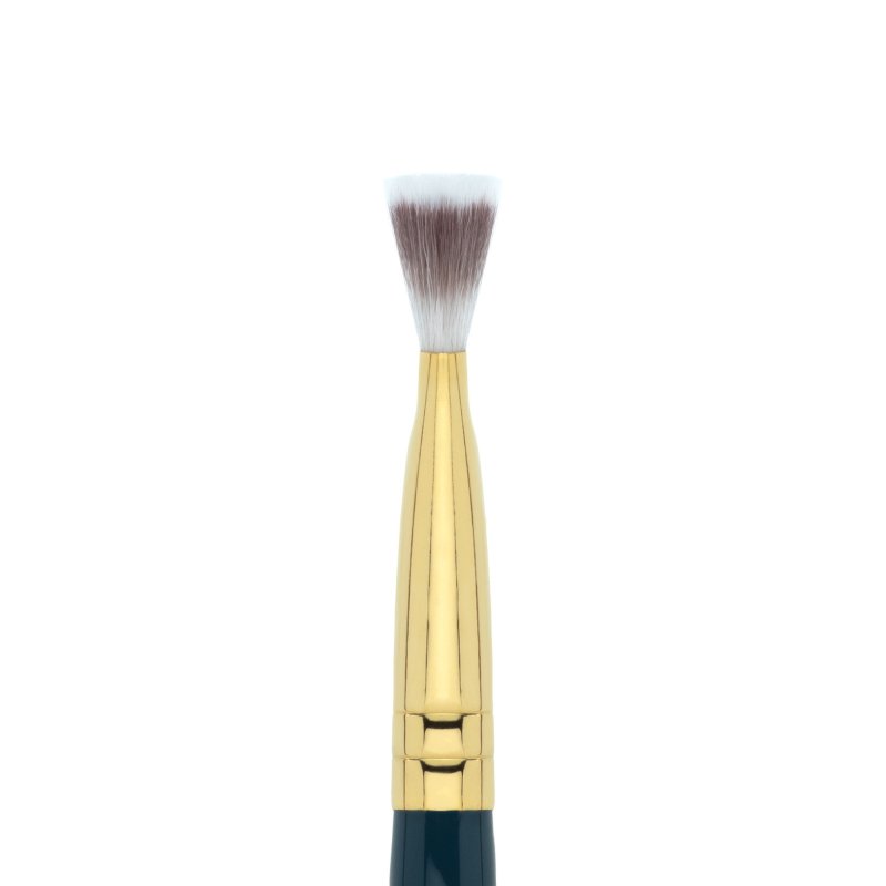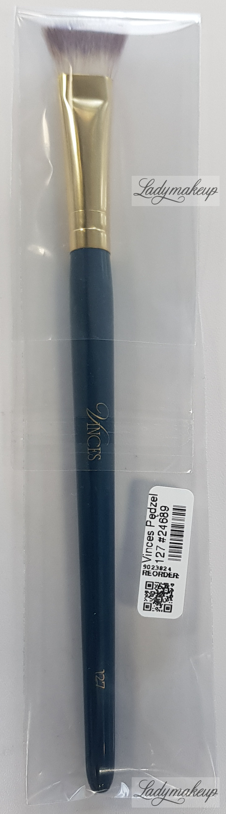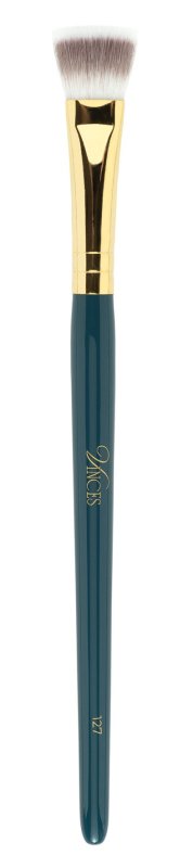 Jest w 100% wegański. Pochodzi z unikatowej serii Ocean, która charakteryzuje się niezwykle luksusową, a przy tym wygodną drewnianą rączką pomalowaną na ciemny szmaragdowo-zielony odcień ze złotym logo producenta oraz uroczą, złotą skuwką. Posiada spłaszczoną i rozkloszowaną główkę o prostej końcówce. Wykonany został z niezwykle miękkiego i elastycznego włosia syntetycznego, które nie podrażnia i nie drapie nawet mocno wrażliwej skóry. Idealnie sprawdzi się do konturowania w szczególności małych partii twarzy, takich jak np. nos czy okolice ust. Dobrze poradzi sobie również z nakładaniem cieni na powiekę ruchomą oraz rozcieraniem cieni na dolnej i górnej powiece. Pędzel posiada odpowiednio wyprofilowaną rączkę, dzięki czemu bardzo dobrze leży w dłoni i nie wyślizguje się z palców podczas pracy.