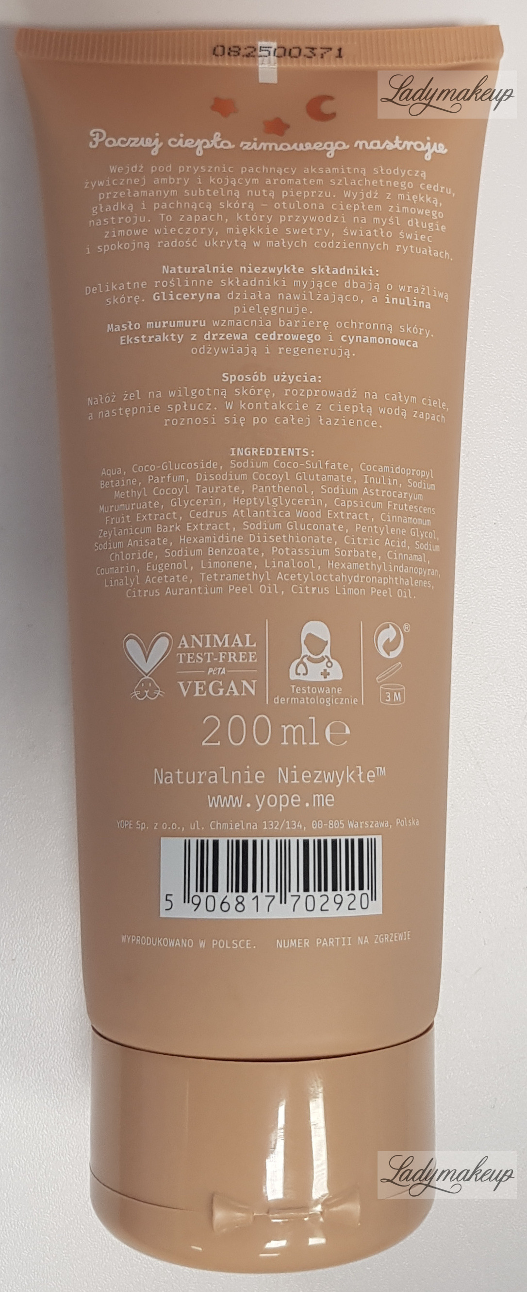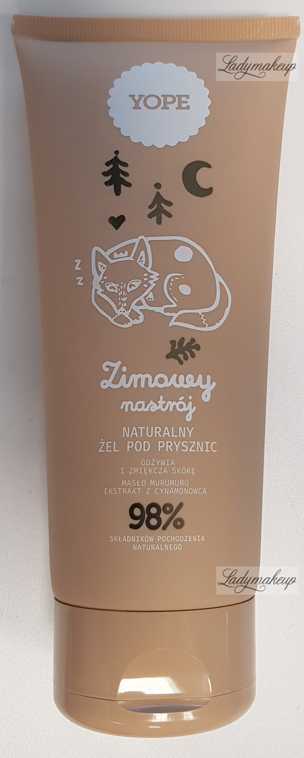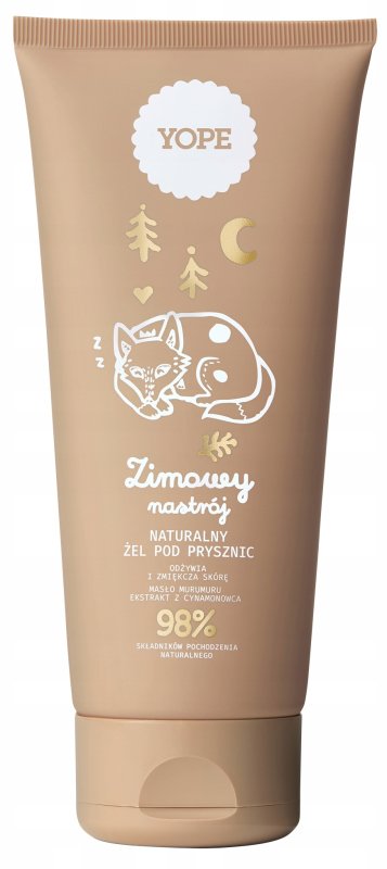 Jest w 100% wegański i w 98% zawiera składniki pochodzenia naturalnego. Pochodzi ze specjalnej serii Zimowy Nastrój powstałej na sezon jesień/zima 2025, która rozsiewa wokół siebie kuszącą świąteczną nutę zapachową. Naturalny żel Yope dokładnie myje oraz oczyszcza skórę z wszelkich zanieczyszczeń oraz brudu bez wywoływania podrażnień oraz przesuszeń naskórka. W swoim składzie zawiera takie aktywne składniki jak: gliceryna, inulina, masło murumuru oraz ekstrakt z cedru i cynamonowca. Yope żel silnie i długotrwale nawilża, widocznie zmiękcza i wygładza naskórek, a także pobudza skórę do znacznie szybszej regeneracji. Posiada ciepły, świąteczny i pierniczkowy zapach. Kosmetyk umieszczony został w tubce o pojemności 200 ml.