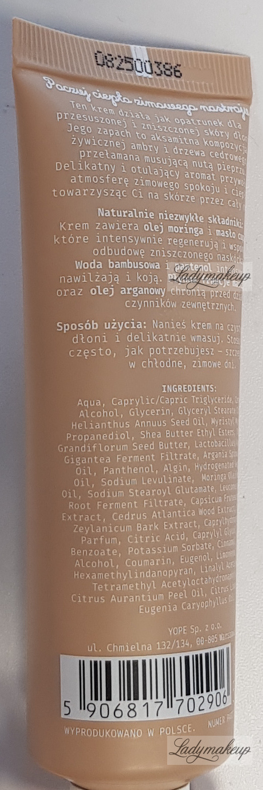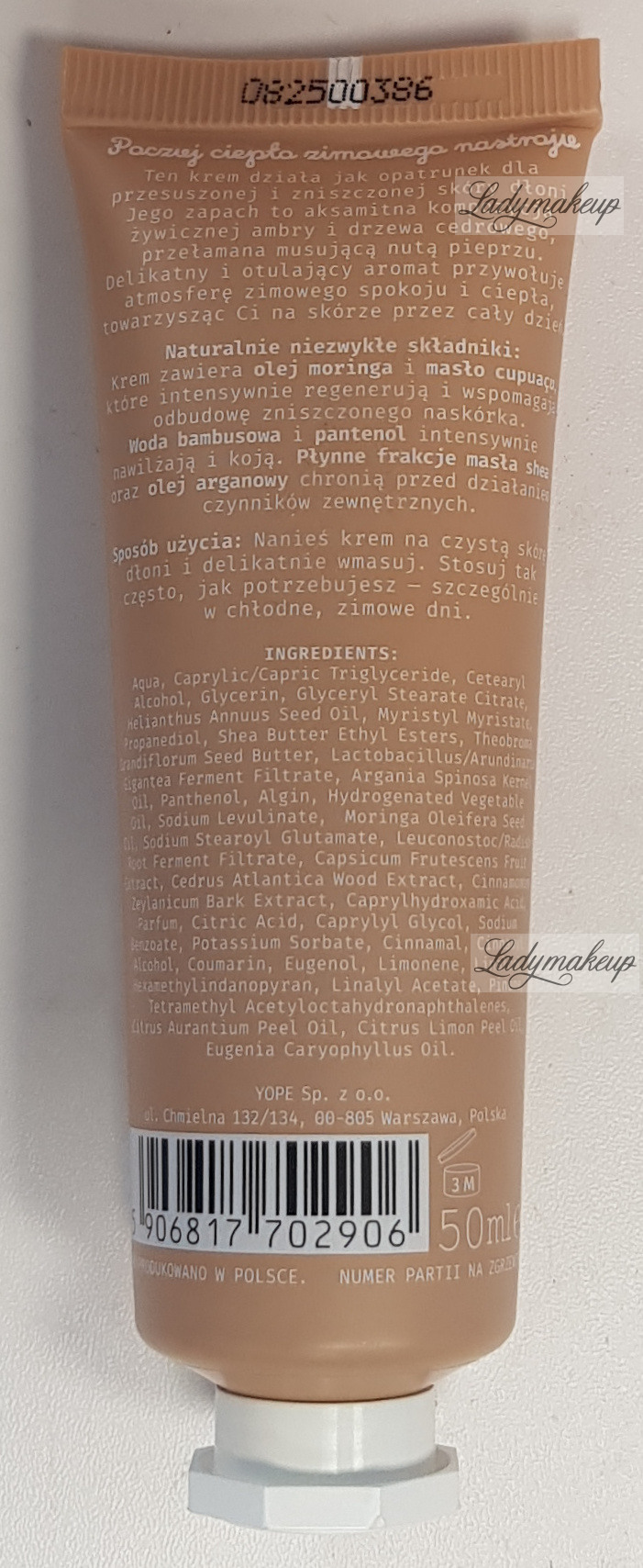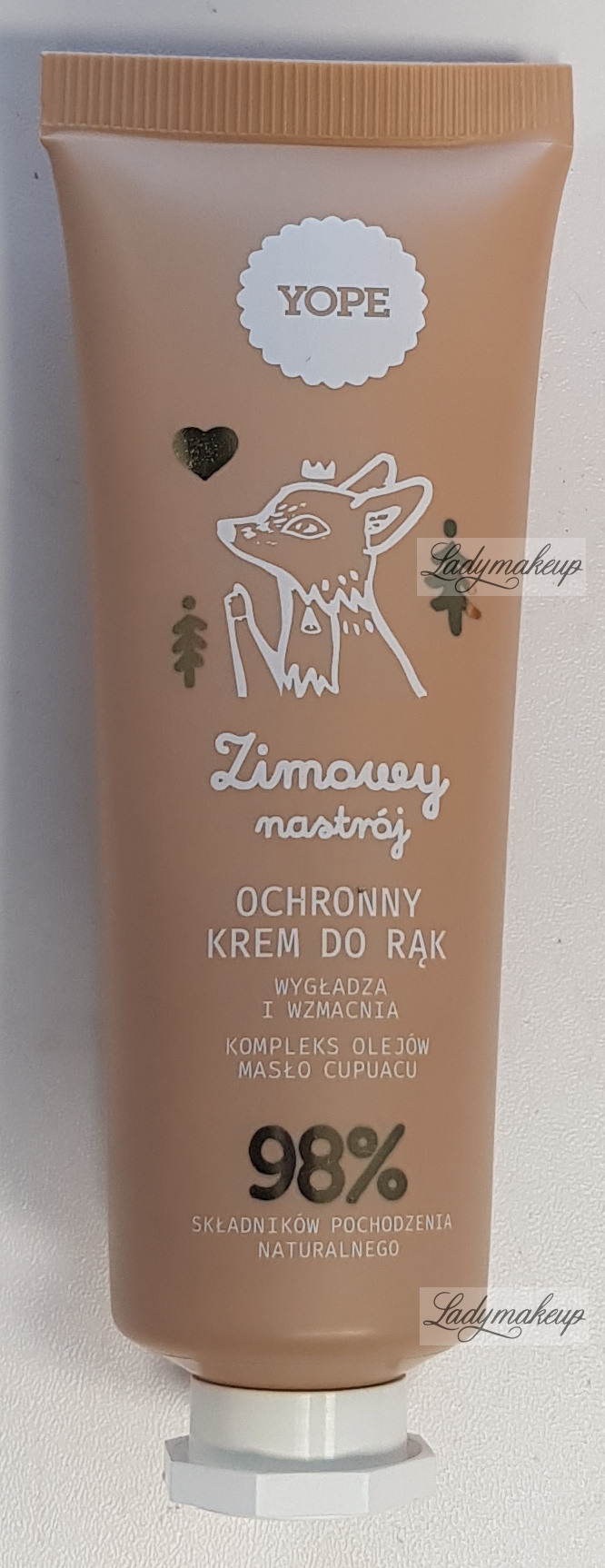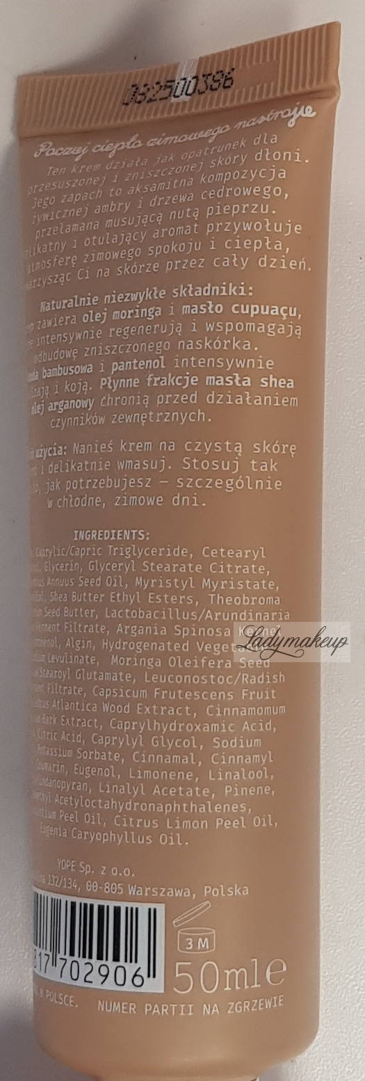 Jest w 100% wegański i w 98% zawiera składniki pochodzenia naturalnego. Pochodzi ze specjalnej zimowej serii Zimowy Nastrój, która charakteryzuje się niezwykle kuszącą świąteczną nutą zapachową. Yope balsam posiada przyjemnie kremową formułę, która szybko się wchłania i nie zostawia po sobie tłustego filmu. W swoim składzie zawiera takie składniki aktywne jak: olej moringa, masło cupuacu, pantenol, woda bambusowa, olej arganowy oraz masło shea. Balsam Yope silnie nawilża, koi podrażnienia, a także pobudza skórę do szybszej regeneracji. Po aplikacji sprawia, że dłonie są przyjemne miękkie, elastyczne oraz wygładzone. Dodatkowo krem chroni skórę przed szkodliwym działaniem czynników zewnętrznych, takich jak: zimno oraz wiatr. Krem został umieszczony w niezwykle klimatycznej tubce o pojemności 50 ml.
