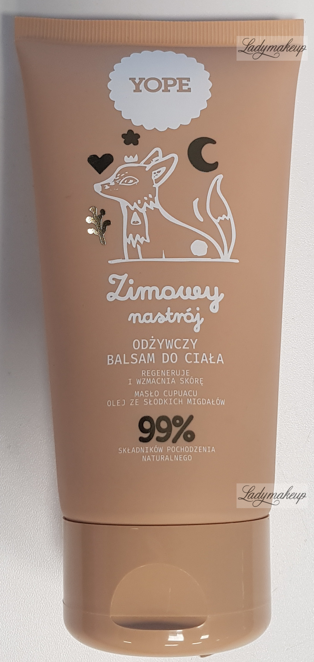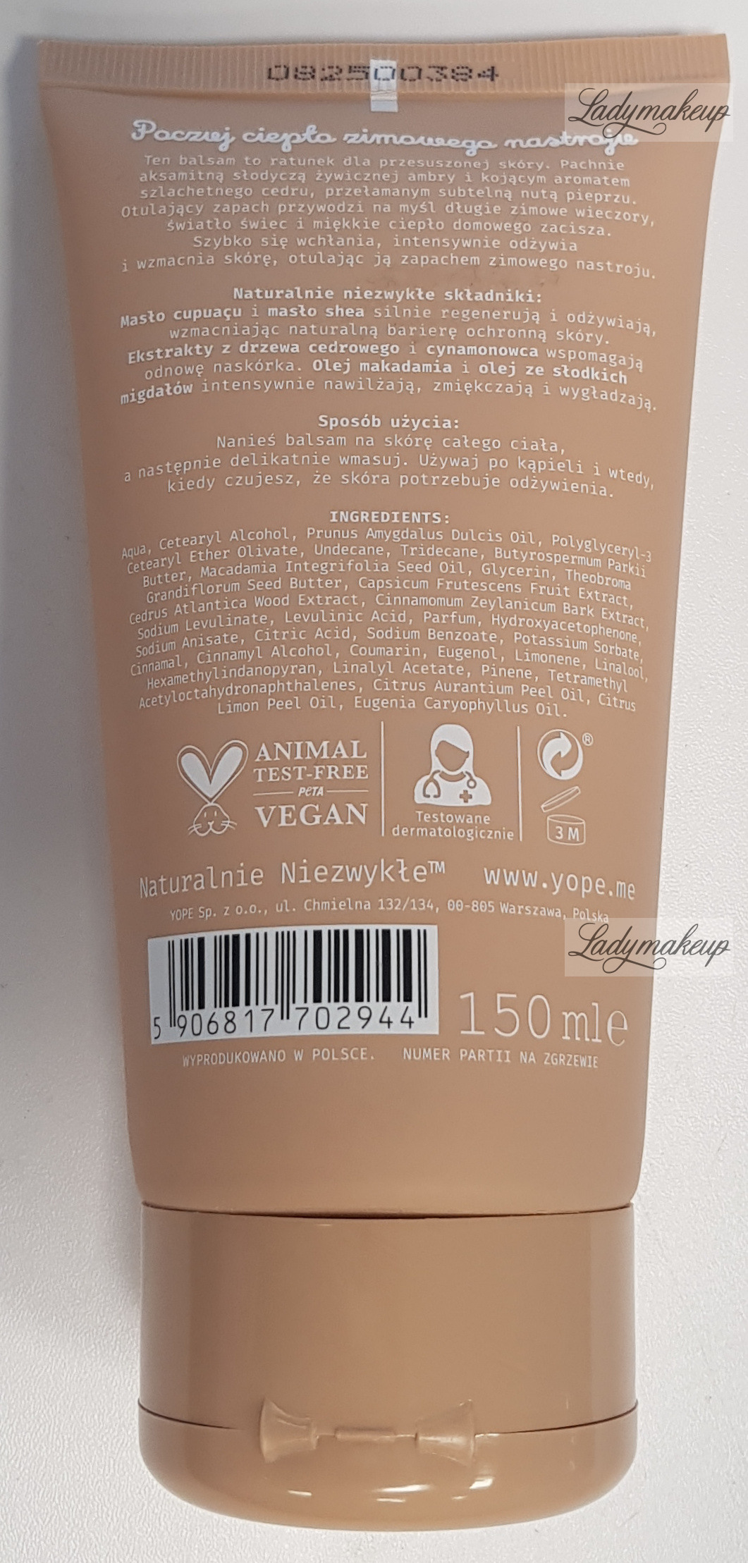 Jest wegański i w 99% zawiera składniki pochodzenia naturalnego. Pochodzi ze specjalnej serii Zimowy Nastrój powstałej na sezon jesień/zima 2025, która posiada kuszącą, świąteczną nutę zapachową. Yope balsam w swoim składzie zawiera takie składniki aktywne jak: masło cupuacu, masło shea, olej ze słodkich migdałów, olej makadamia, oraz ekstrakty z drzewa cedrowego i cynamonowca. Balsam Yope posiada przyjemnie kremową formułę, która łatwo się aplikuje oraz szybko się wchłania w naskórek. Kosmetyk długotrwale nawilża, intensywnie odżywia, a także wygładza i regeneruje naskórek. Po zastosowaniu ciało jest przyjemnie miękkie i gładkie w dotyku. Balsam dostępny jest w tubce o pojemności 150 ml. Kosmetyk posiada świąteczny zapach pierniczków.