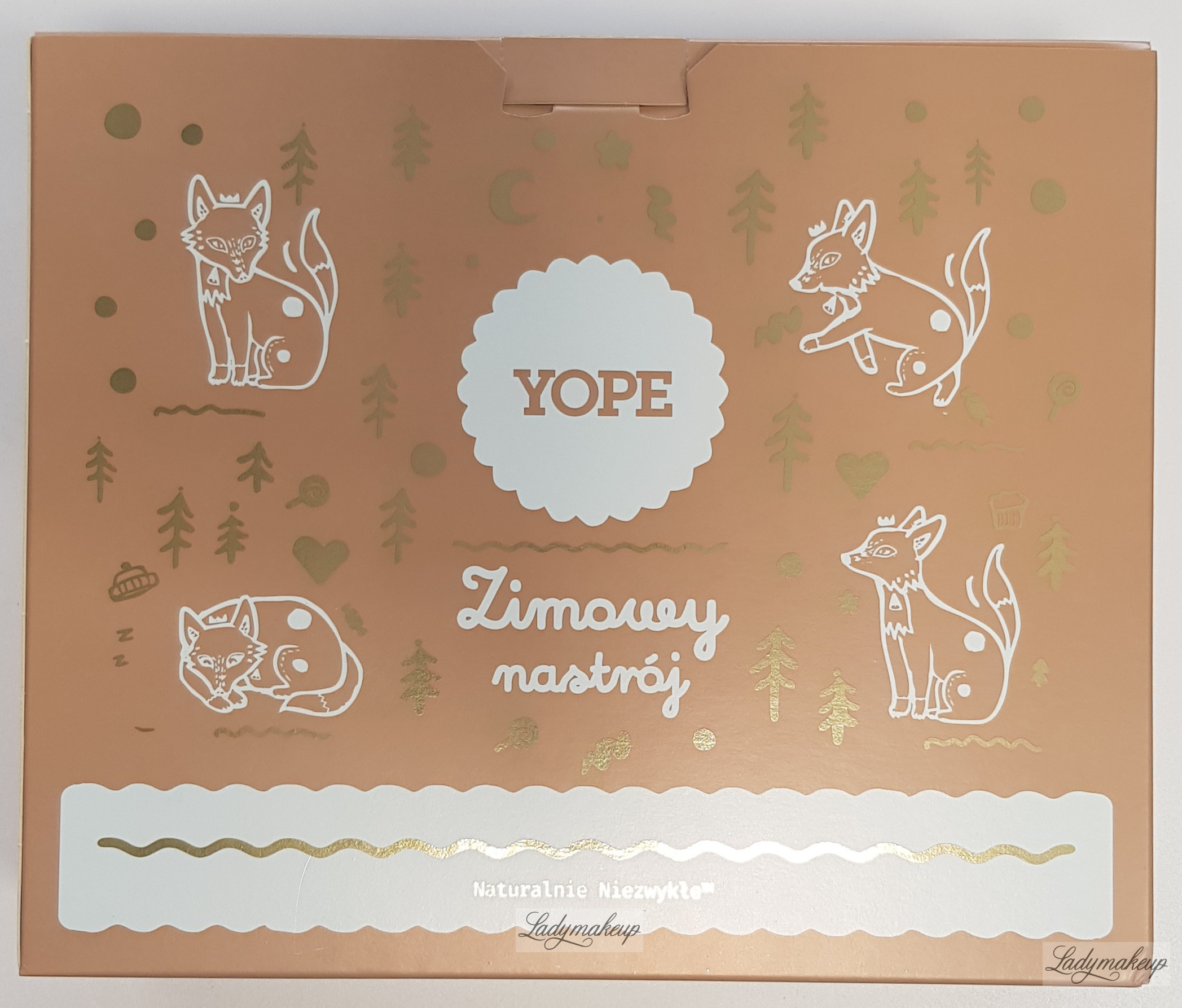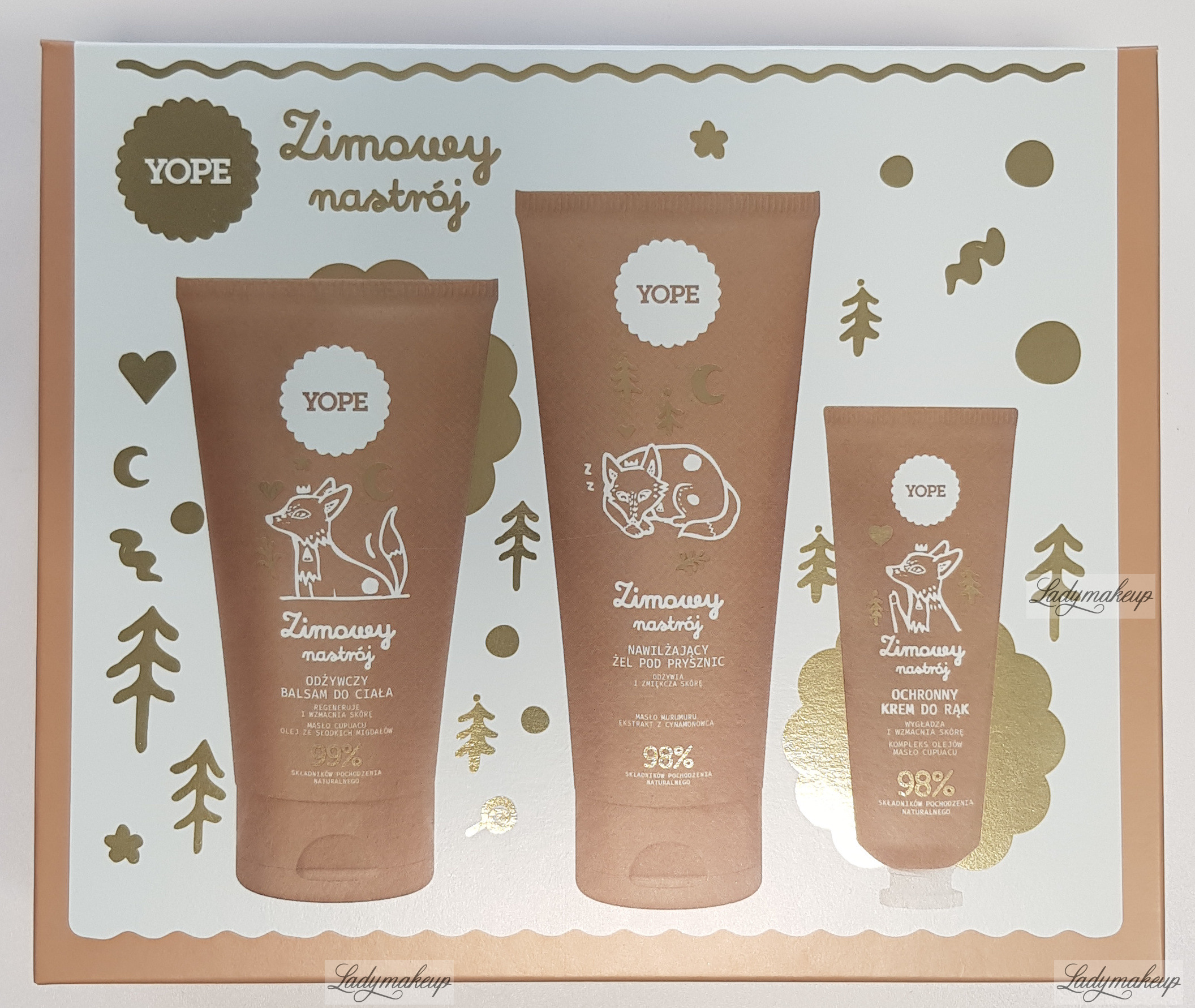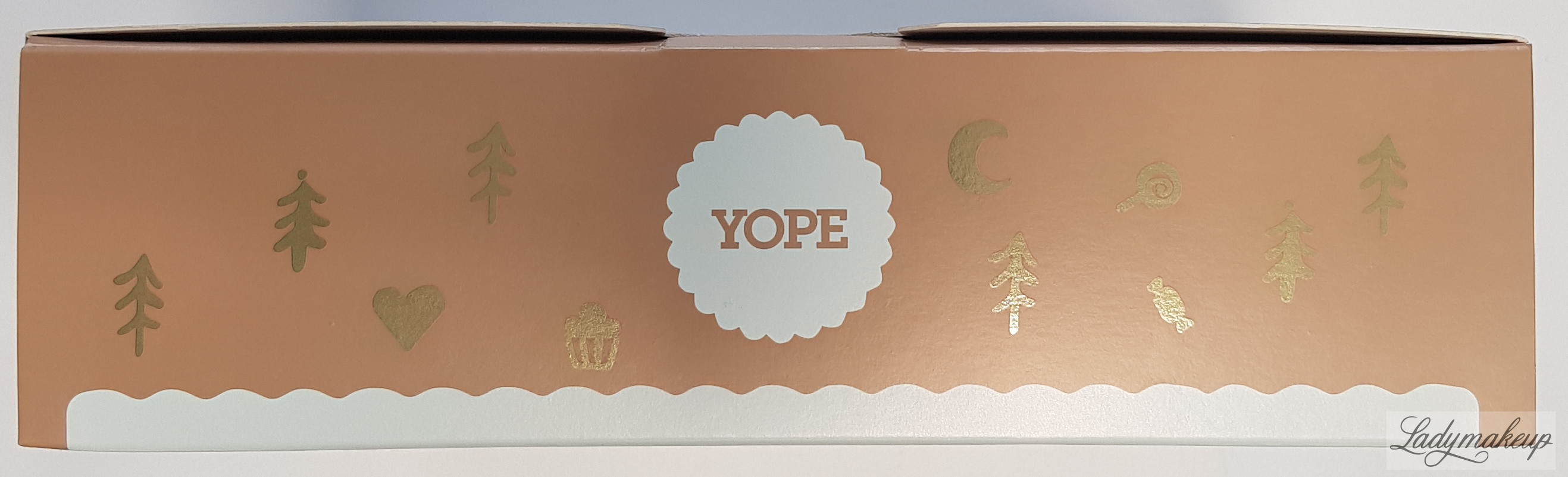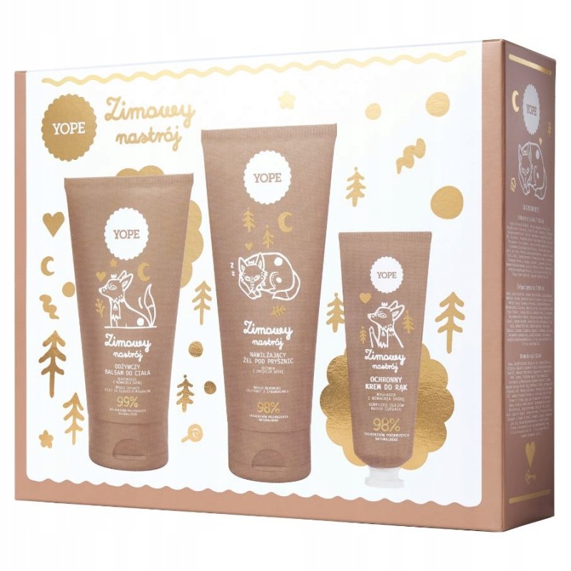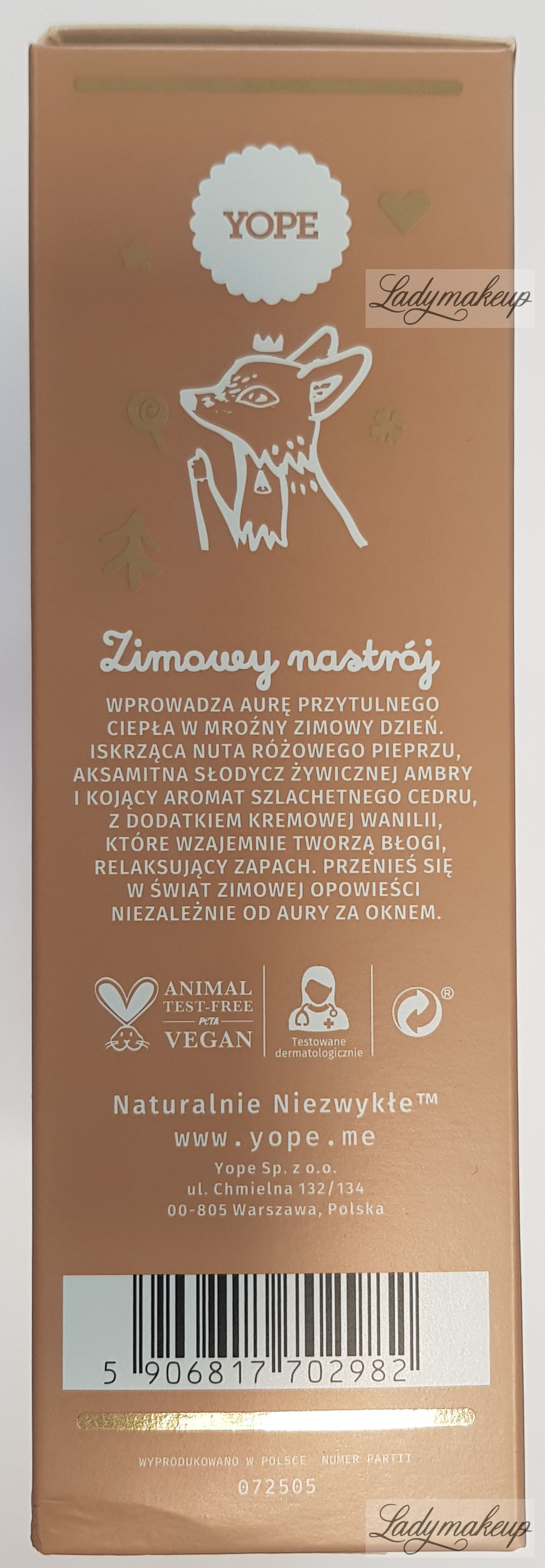 - Żel pod prysznic. Jest w 100% wegański i w 98% zawiera składniki pochodzenia naturalnego. Pochodzi ze specjalnej serii Zimowy Nastrój powstałej na sezon jesień/zima 2025, która rozsiewa wokół siebie kuszącą świąteczną nutę zapachową. Naturalny żel Yope dokładnie myje oraz oczyszcza skórę z wszelkich zanieczyszczeń oraz brudu bez wywoływania podrażnień oraz przesuszeń naskórka. W swoim składzie zawiera takie aktywne składniki jak: gliceryna, inulina, masło murumuru oraz ekstrakt z cedru i cynamonowca. Yope żel silnie i długotrwale nawilża, widocznie zmiękcza i wygładza naskórek, a także pobudza skórę do znacznie szybszej regeneracji. Posiada ciepły, świąteczny i pierniczkowy zapach. Kosmetyk umieszczony został w tubce o pojemności 200 ml.