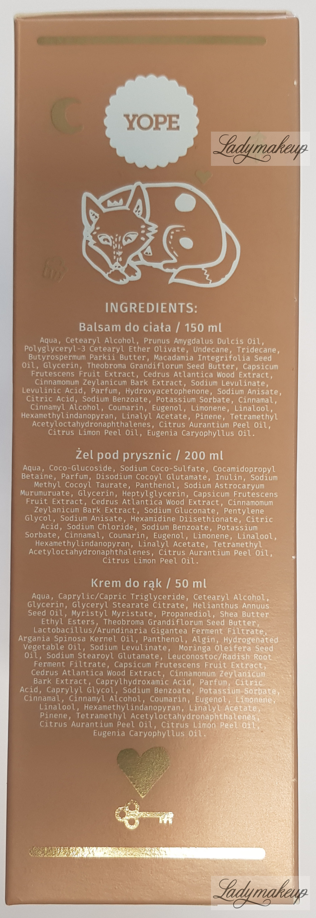 - Balsam do ciała. Jest wegański i w 99% zawiera składniki pochodzenia naturalnego. Pochodzi ze specjalnej serii Zimowy Nastrój powstałej na sezon jesień/zima 2025, która posiada kuszącą, świąteczną nutę zapachową. Yope balsam w swoim składzie zawiera takie składniki aktywne jak: masło cupuacu, masło shea, olej ze słodkich migdałów, olej makadamia, oraz ekstrakty z drzewa cedrowego i cynamonowca. Balsam Yope posiada przyjemnie kremową formułę, która łatwo się aplikuje oraz szybko się wchłania w naskórek. Kosmetyk długotrwale nawilża, intensywnie odżywia, a także wygładza i regeneruje naskórek. Po zastosowaniu ciało jest przyjemnie miękkie i gładkie w dotyku. Balsam dostępny jest w tubce o pojemności 150 ml. Kosmetyk posiada świąteczny zapach pierniczków.