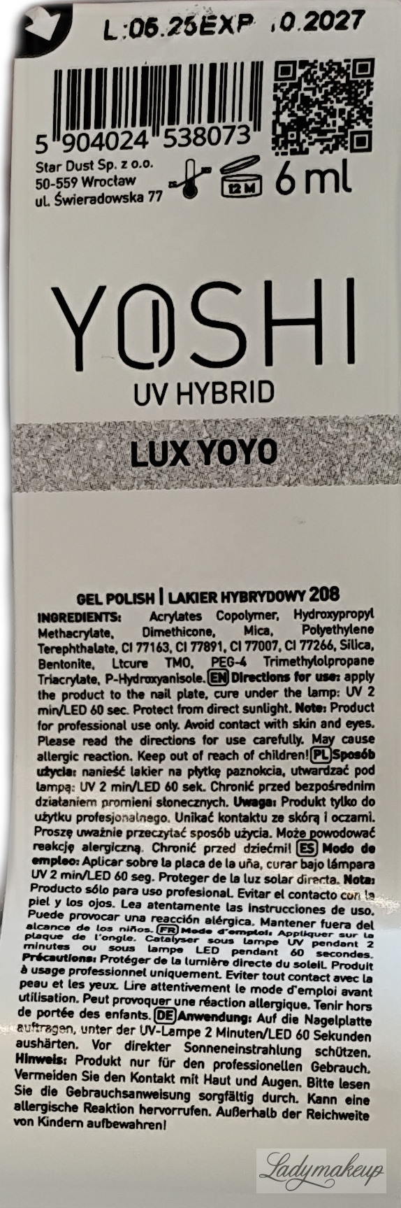 Lakier hybrydowy. Pochodzi ze specjalnej serii Yacht & Yoyo, która pozwala osiągnąć kuszący i elegancki manicure inspirowany luksusowymi wakacjami na jachcie. Posiada kremową formułę, która przyjemnie aplikuje się na płytkę paznokcia. Jednocześnie posiada odpowiednio gęstą konsystencję, która bezproblemowo się rozprowadza, a także nie zalewa skórek i nie tworzy nieestetycznych smug i zacieków. Specjalny szeroki i elastyczny pędzelek zapewnia niezwykle szybką oraz precyzyjną aplikację Yoshi lakier hybrydowy jest niezwykle dobrze napigmentowany, a także tworzy na paznokciu twardą warstwę odporną na odpryski, ścieranie, uszkodzenia oraz blaknięcie koloru. Kosmetyk dostępny jest w butelce o pojemności 6 ml oraz jest wolny od HEMA i TPO.- Lakier Yoshi.