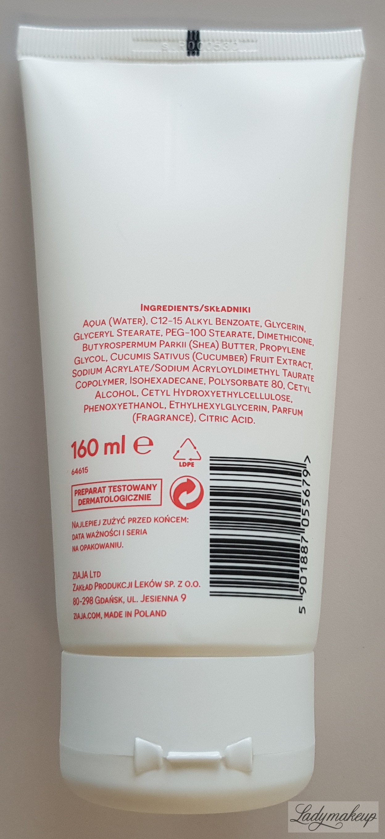 Jest w 100% wegański i w 90% zawiera składniki pochodzenia naturalnego. Przeznaczony do pielęgnacji skóry każdego rodzaju, również wrażliwej. W swojej formule zawiera takie składniki aktywne jak: ekstrakt z ogórka, gliceryna roślinna oraz masło shea. Posiada przyjemnie lekką oraz dobrze wchłaniającą się w skórę formułę. Balsam Ziaja intensywnie oraz długotrwale nawilża i wygładza naskórek. Dodatkowo widocznie ujędrnia, uelastycznia i napina skórę całego ciała. Ziaja balsam posiada niezwykle kuszący zapach arbuza, który uprzyjemnia jego stosowanie. Produkt został umieszczony w poręcznej tubce o pojemności 160 ml.