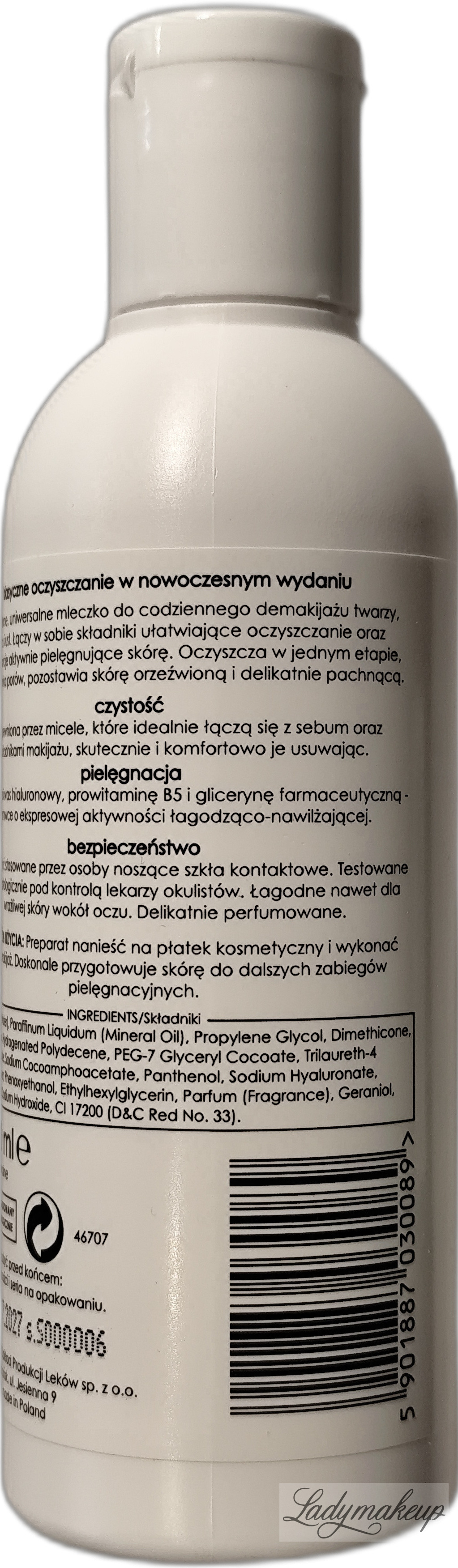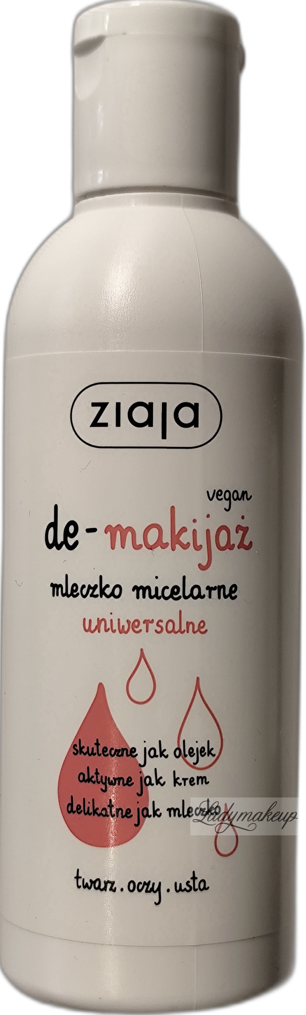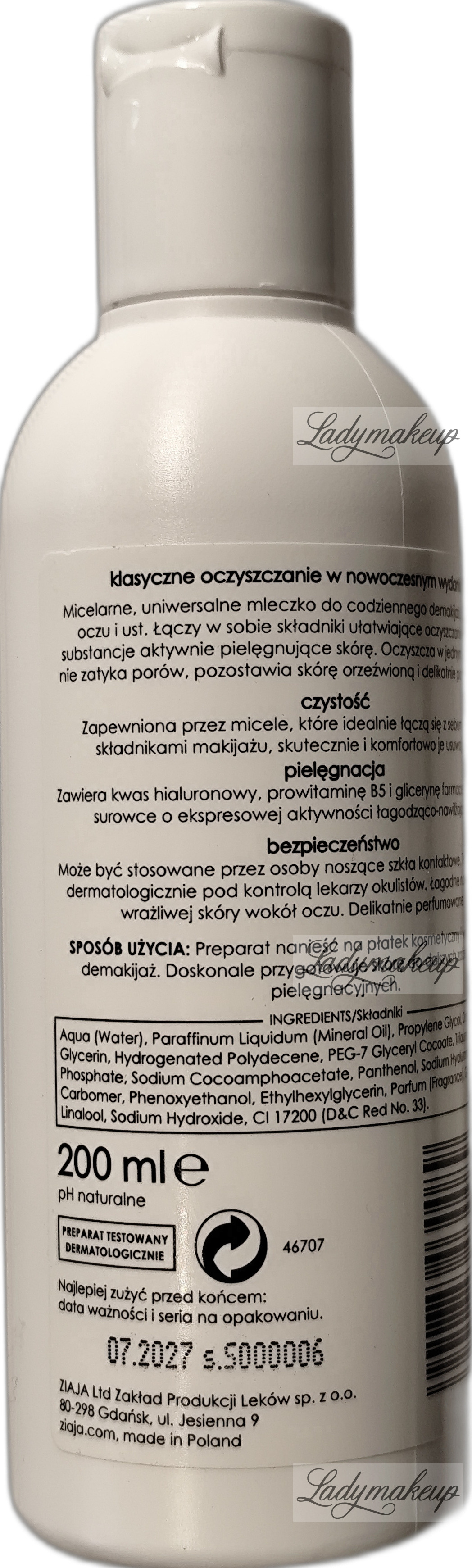 Jest w 100% wegańskie. Posiada delikatną, micelarną formułę, która skutecznie usuwa nawet mocny make-up twarzy, oczu oraz ust. Specjalnie opracowana nowoczesna formuła powstała na bazie specjalnie wyselekcjonowanych składników aktywnych, takich jak: kwas hialuronowy, prowitamina B5 oraz gliceryna. Mleczko Ziaja działa skutecznie jak olejek, aktywnie jak krem oraz delikatnie jak mleczko. Dogłębnie oczyszcza oraz przyjemnie nawilża skórę twarzy, bez obaw o zatkanie porów oraz wywołanie podrażnień. Dodatkowo Ziaja mleczko łagodzi i koi podrażnienia. Delikatna formuła kosmetyku sprawia, że bez problemu może być on stosowany przez osoby noszące szkła kontaktowe. Produkt dostępny jest w poręcznej butelce o pojemności 200 ml.