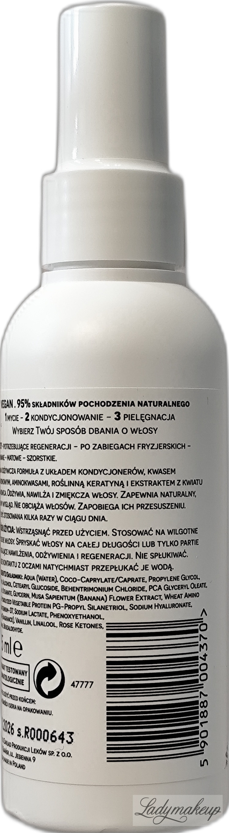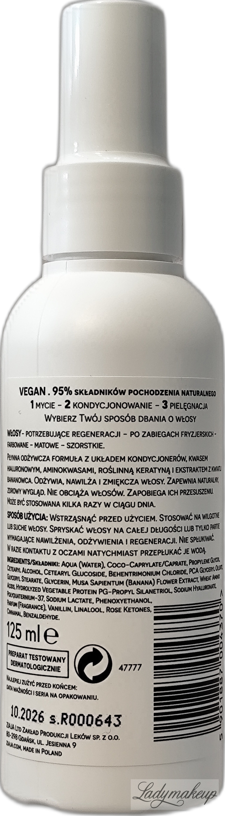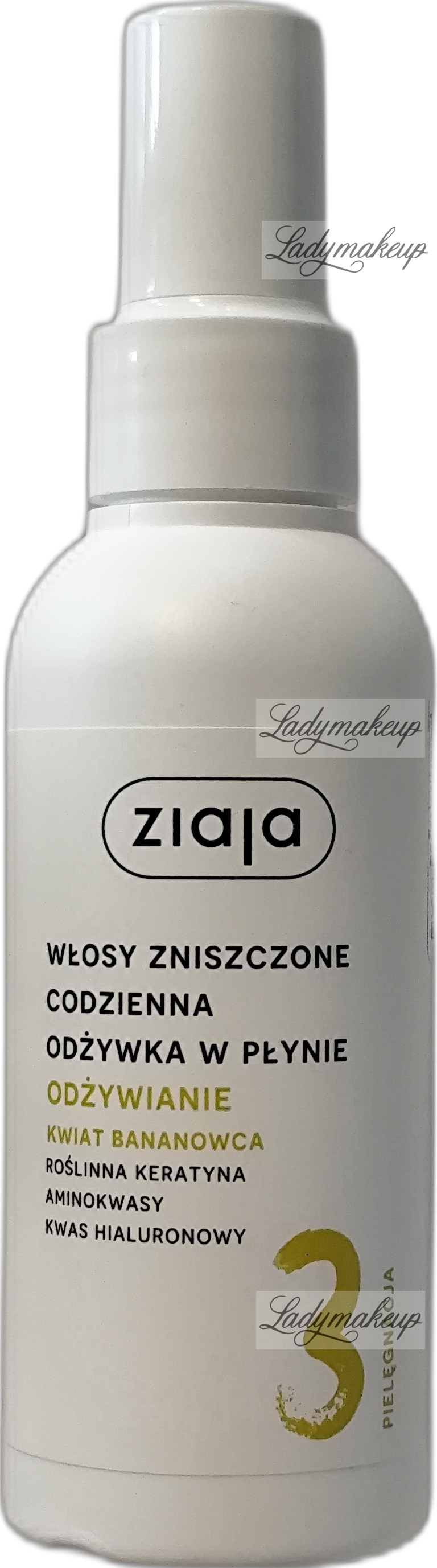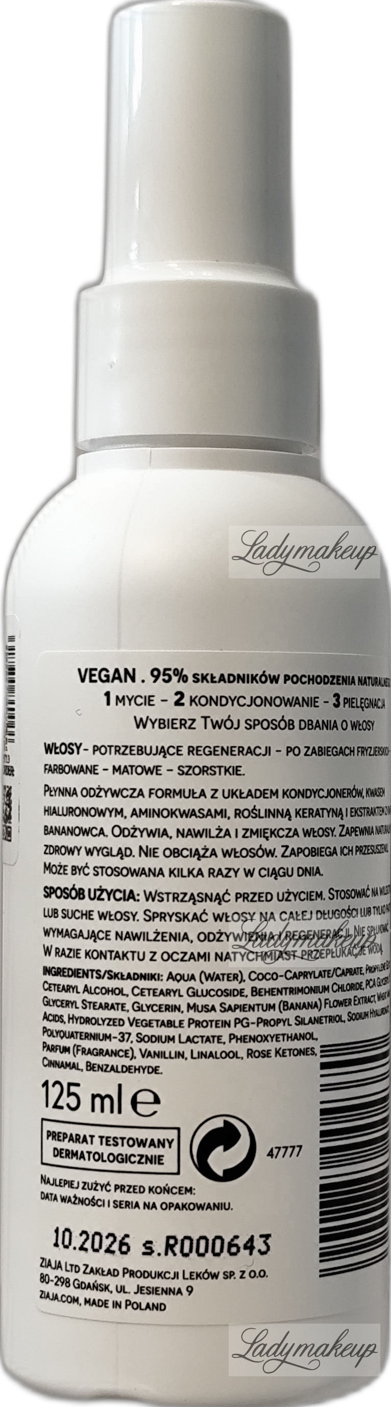 Jest w 100% wegańska i w 95% zawiera składniki pochodzenia naturalnego. Polecana w szczególności w pielęgnacji włosów po zabiegach fryzjerskich, farbowanych, matowych oraz szorstkich. Odżywka Ziaja posiada niezwykle lekką, płynną formułę, która nie obciąża delikatnych pasm. W swoim składzie zawiera specjalnie wyselekcjonowane składniki aktywne, takie jak m.in.: ekstrakt z kwiatów bananowca, aminokwasy, kwas hialuronowy, roślinną keratynę, glukozydy kokosowe oraz olej kokosowy. Ziaja odżywka intensywnie nawilża oraz dogłębnie odżywia pasma na całej długości. Dodatkowo kosmetyk pobudza do znacznie szybszej regeneracji, a także wygładza i zmiękcza pasma. Dostępna jest w opakowaniu o pojemności 125 ml.