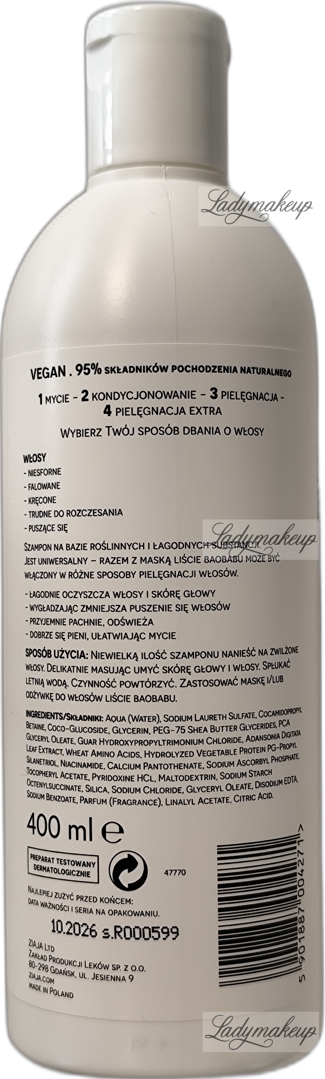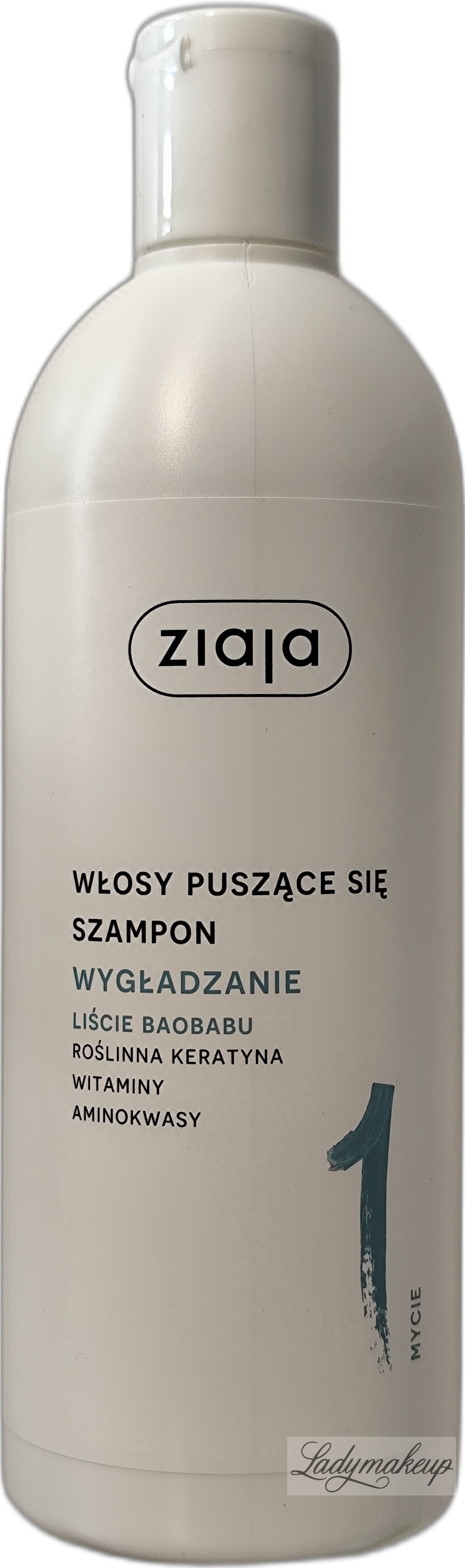 Jest w 100% wegański i w 95% zawiera składniki pochodzenia naturalnego. Został stworzony specjalnie z myślą o codziennej pielęgnacji włosów puszących się, niesfornych, falowanych, kręconych i trudnych do rozczesania. Swoje działanie opiera na bazie specjalnie wyselekcjonowanych składników aktywnych takich jak: roślinna keratyna, witaminy i aminokwasy. Szampon Ziaja delikatnie myje oraz dokładnie oczyszcza skórę z wszelkich zanieczyszczeń, sebum i pozostałości kosmetyków. Sprawia, że pasma są długotrwale odświeżone. Dodatkowo szampon Ziaja silnie nawilża, odżywia oraz wygładza oraz zmniejsza puszenie się pasm. Kosmetyk dobrze się pieni oraz łatwo spłukuje się z pasm. Dostępny jest w opakowaniu o pojemności 400 ml.